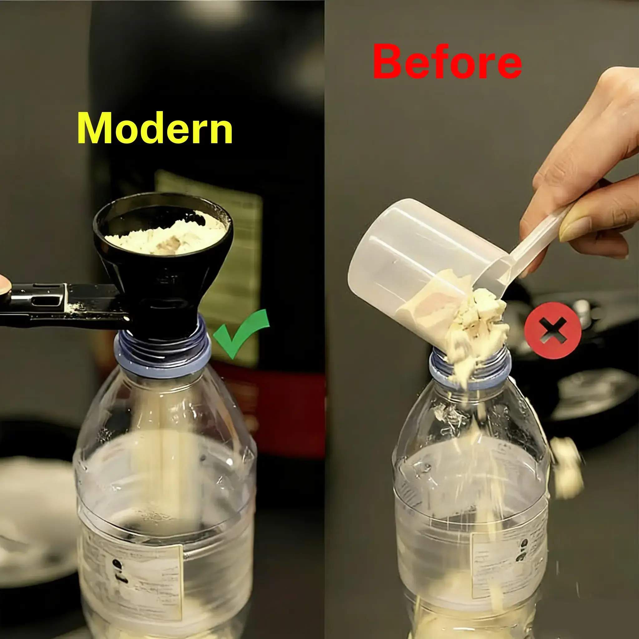 ·Simple to operate and easy to get started: simply push open the sliding lid to load the material, and the conical spoon mouth precisely connects to narrow mouthed bottles (protein powder cans, coffee bottles, milk bottles, etc.). Close the lid and pour it directly without complicated steps. Elderly people, mothers, and fitness enthusiasts can all do it in seconds, saving time and worry.