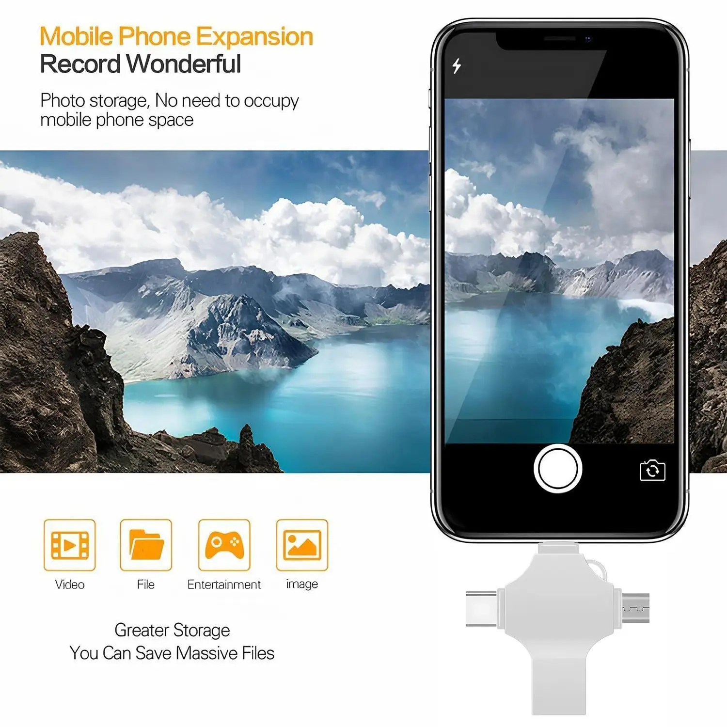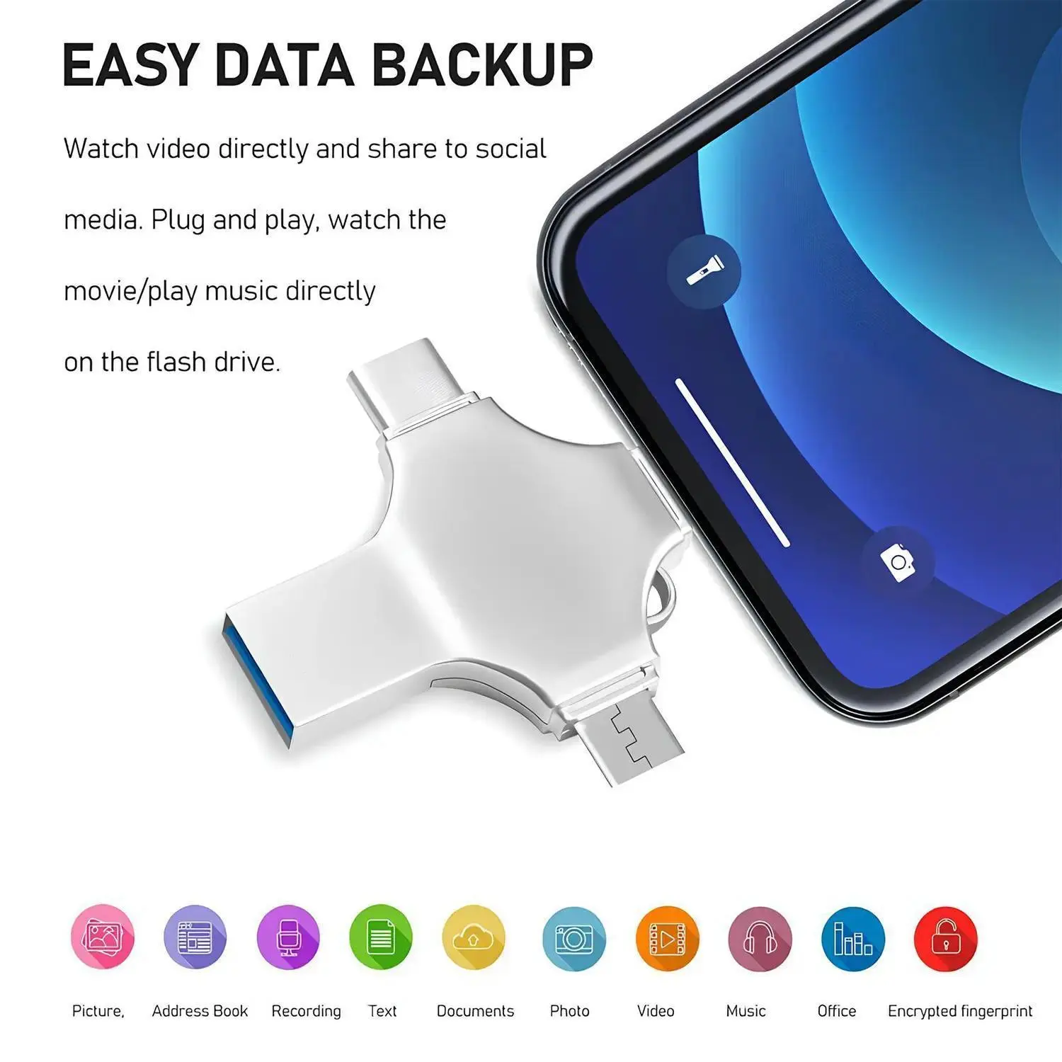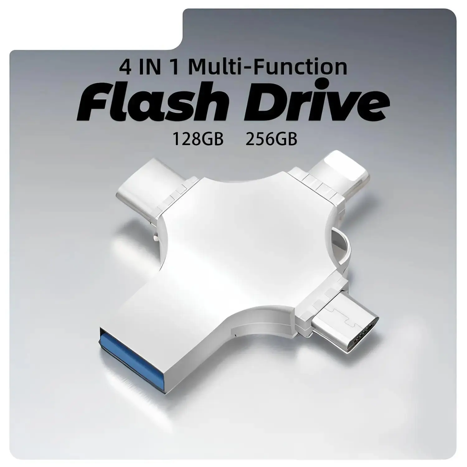 4 in 1 USB Flash Drive High-Speed Storage: This USB 3.0 flash drive offers fast data transfer speeds, perfect for backing up photos and videos. Capacity Options: Available in 128GB and 256GB, this flash drive provides ample storage space for your files. Portable and Mini: The compact design makes it easy to carry, suitable for iPhone, iPad, Android, computer, laptop, and PC. Features Versatile Compatibility: Works with a wide range of devices, ensuring seamless data transfer. External Storage: Acts as an external storage device, enhancing your device's storage capacity. Thumb Drive: Acts as a mini jump drive, making it convenient for on-the-go storage. Perfect for Backup: Ideal for backing up important photos and videos. Storage: Provides ample storage space for your files. Portability: Easy to carry and use on various devices.