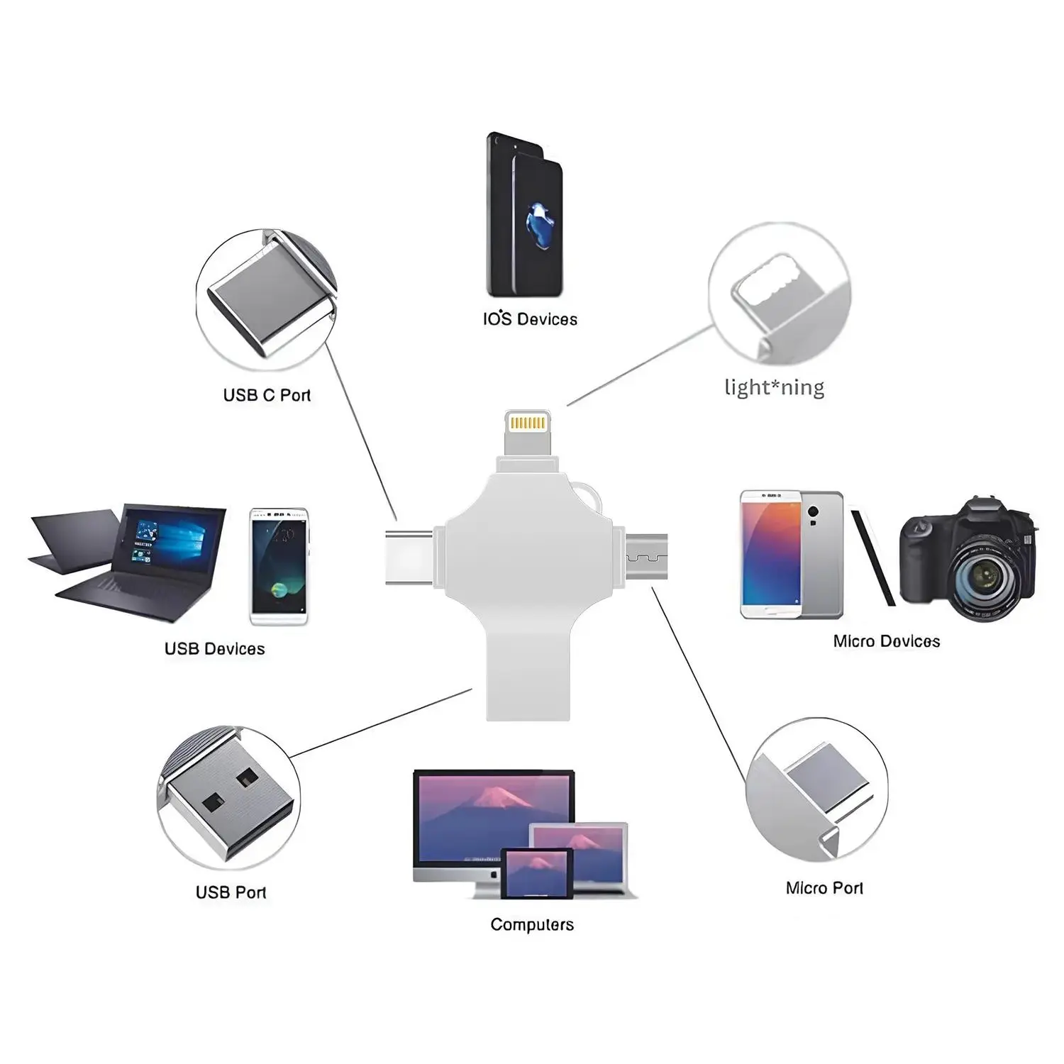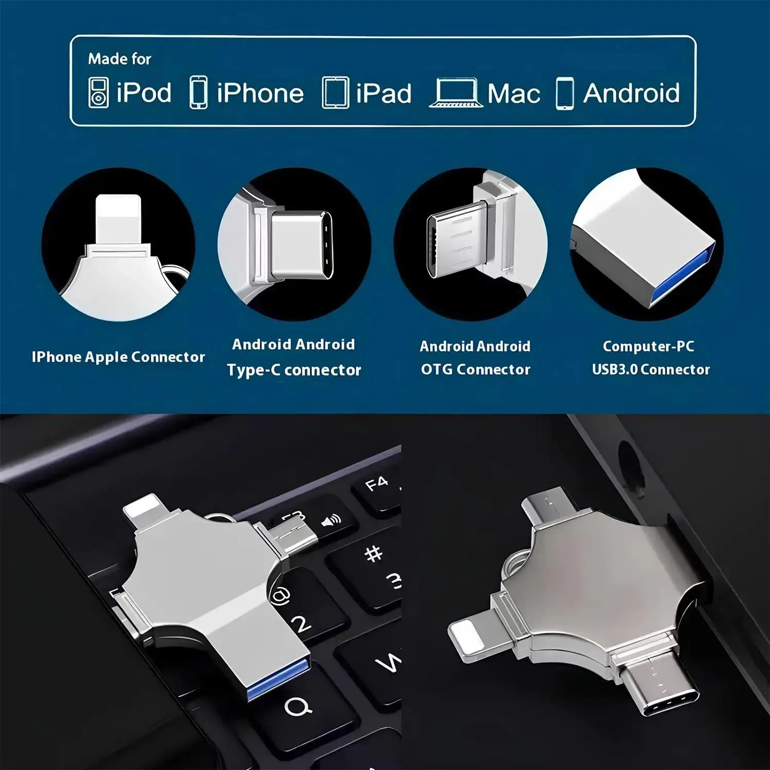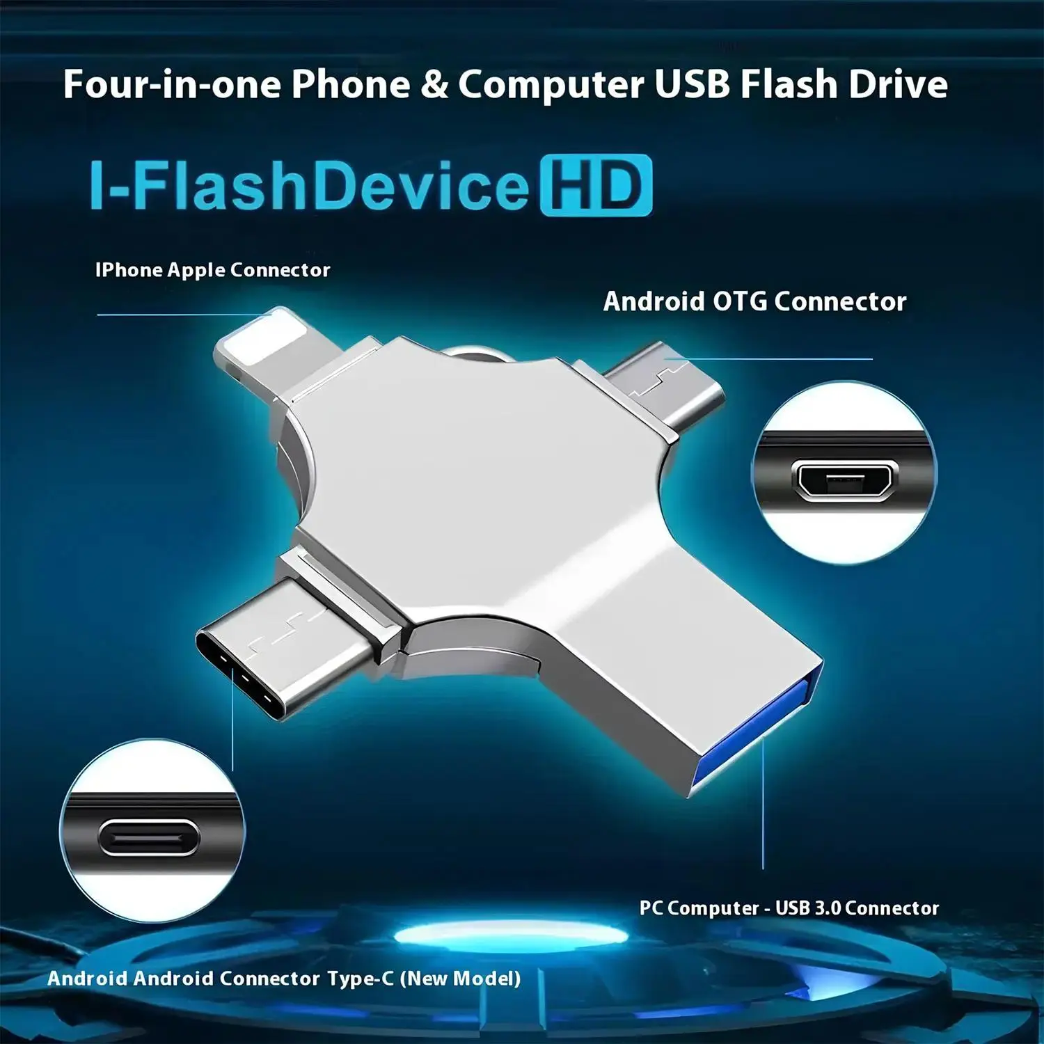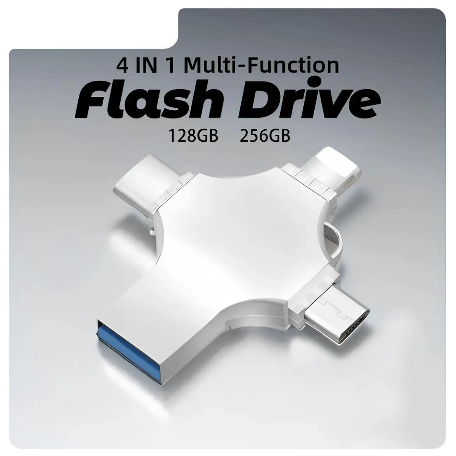 4 in 1 USB Flash Drive High-Speed Storage: This USB 3.0 flash drive offers fast data transfer speeds, perfect for backing up photos and videos. Capacity Options: Available in 128GB and 256GB, this flash drive provides ample storage space for your files. Portable and Mini: The compact design makes it easy to carry, suitable for iPhone, iPad, Android, computer, laptop, and PC. Features Versatile Compatibility: Works with a wide range of devices, ensuring seamless data transfer. External Storage: Acts as an external storage device, enhancing your device's storage capacity. Thumb Drive: Acts as a mini jump drive, making it convenient for on-the-go storage. Perfect for Backup: Ideal for backing up important photos and videos. Storage: Provides ample storage space for your files. Portability: Easy to carry and use on various devices.