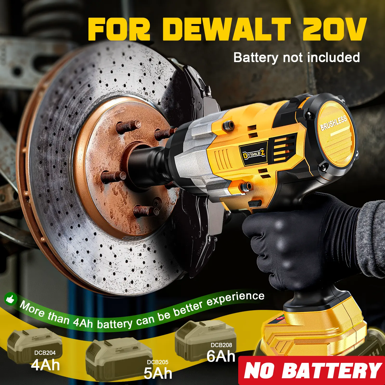 ·This power impact wrenches does NOT INCLUDE any batteries and impact sockets attachment. It is compatible with DeWalt 20V batteries. It is just a bare tool.