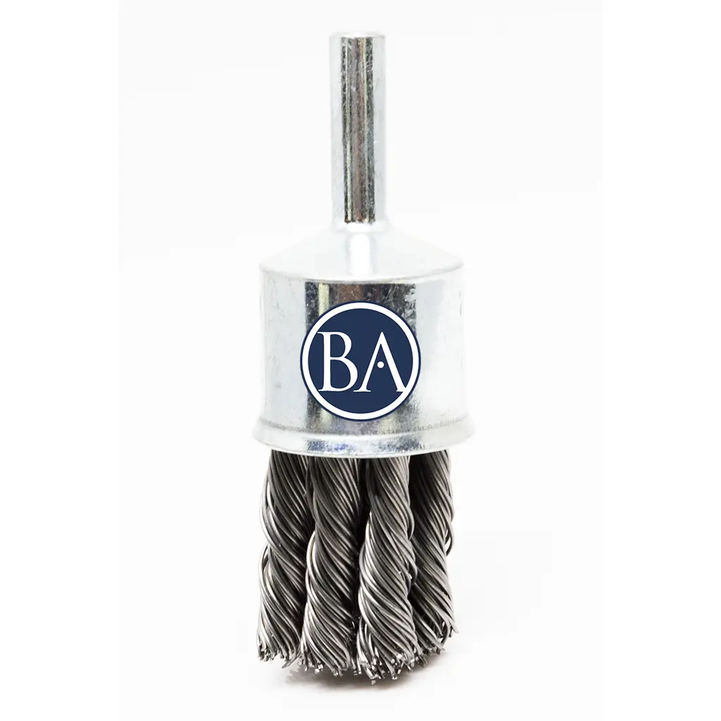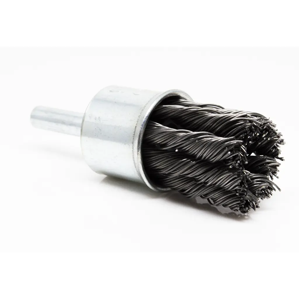 3/4" Knot Wire End Brush for Stainless Steel are best for use on corrosion-resistant or non-ferrous materials. They are also used to clean surfaces and to create a better conductive area for attaching electrical connections. The crimped wire style is suited for medium to heavy duty jobs. This end brush has 1/4" shank for easy use on powered drills and other pneumatic tools.