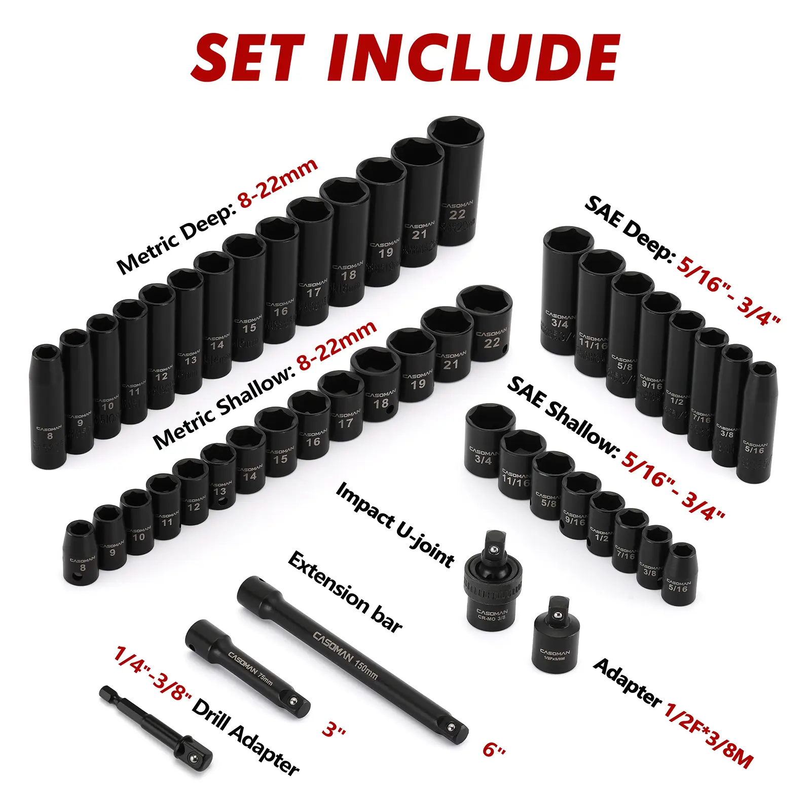 CASOMAN 3/8" Drive Impact Socket Set, SAE and Metric, 5/16-Inch to 3/4-Inch & 8-22 mm, 6 Point, CR-V, 49 Piece Set