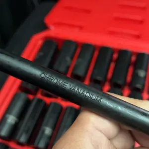 This socket set is made from drop forged and heat treated chrome vanadium steel (50BV30) with a corrosion-resistant black phosphate finish, providing the durability for a hard use. Its deep 6-point sockets with chamfered openings and an attachment port compatible with traditional ratchets, high-contrast laser etched with high-visibility markings and hard stamped with size labels.