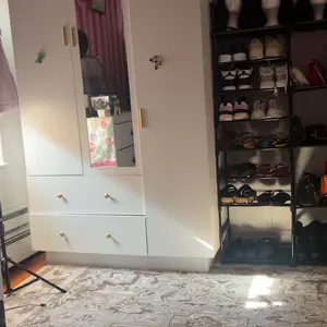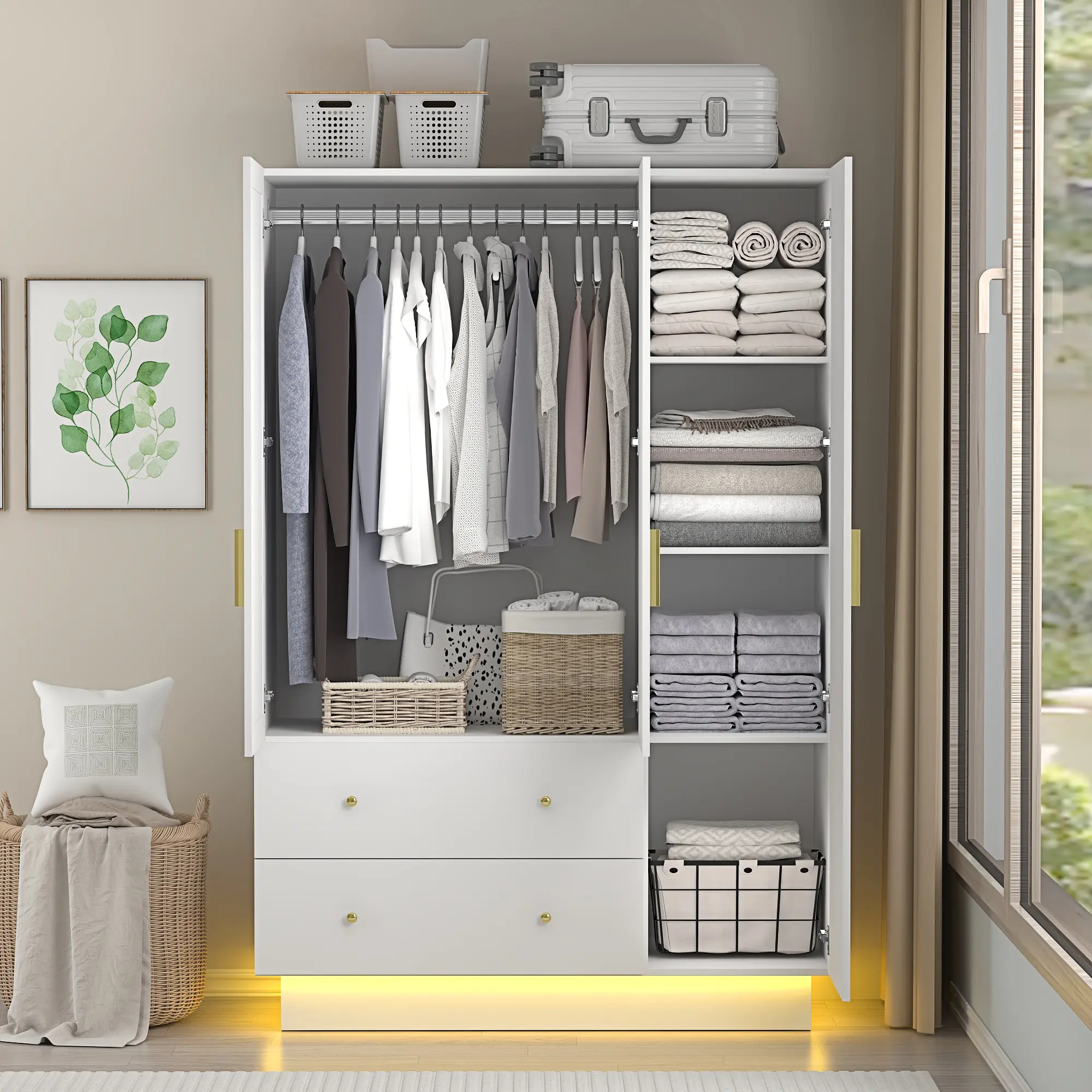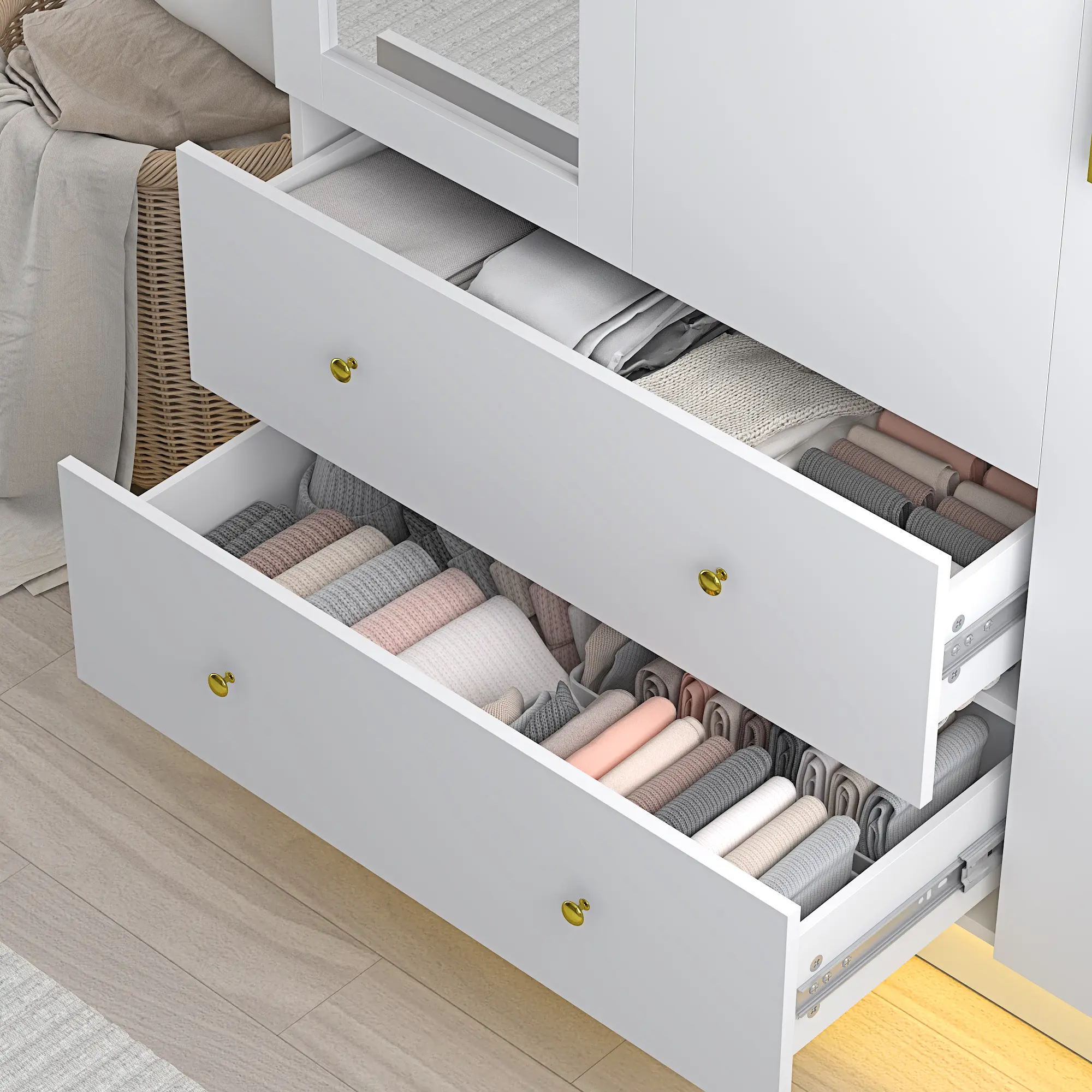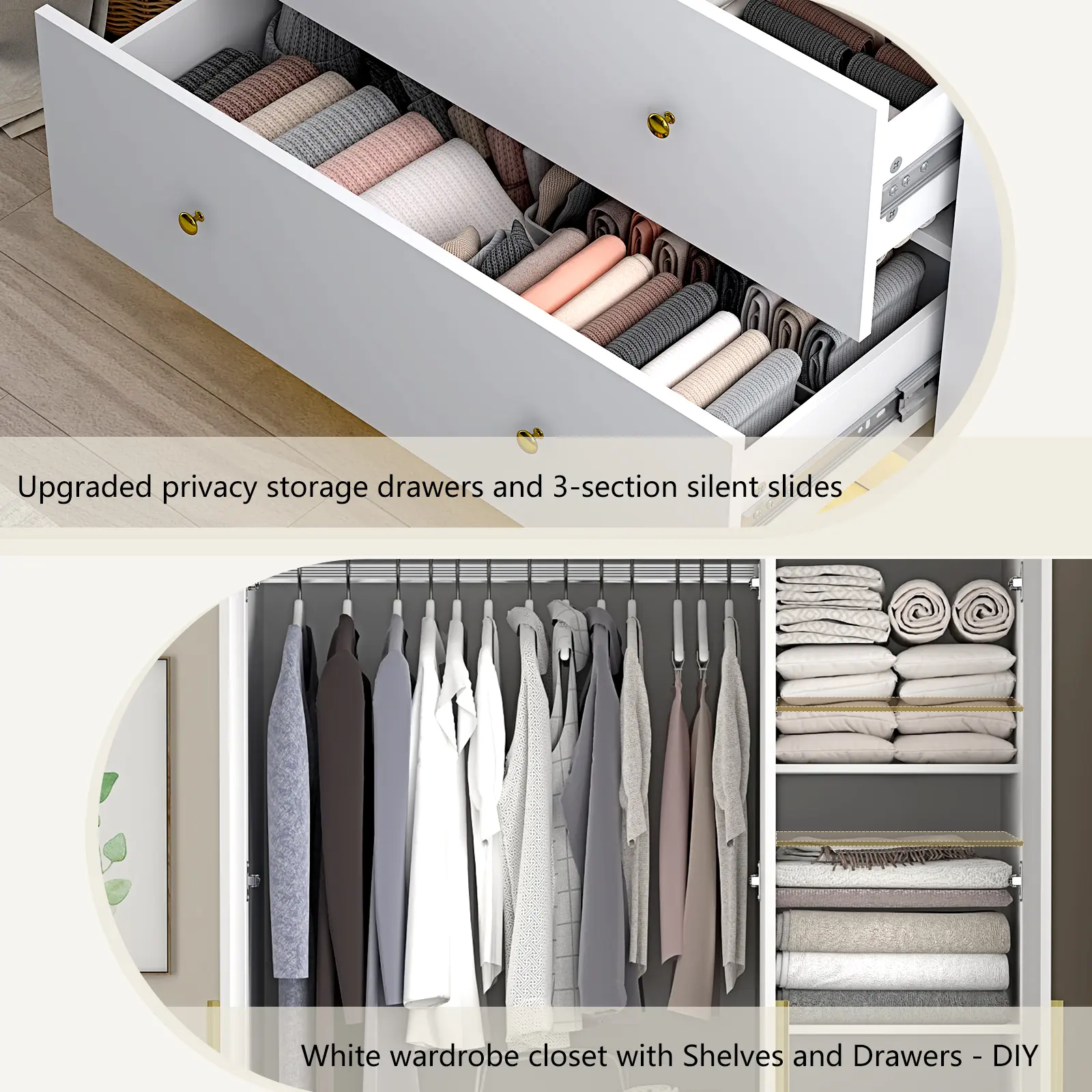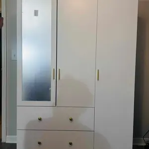Our details: Buffer hinges can reduce the impact of doors, and the door gap can be adjusted as needed. The drawer uses 3-section slide rails for smoother operation. The entire wardrobe is made of engineered wood, which is stable and reliable.