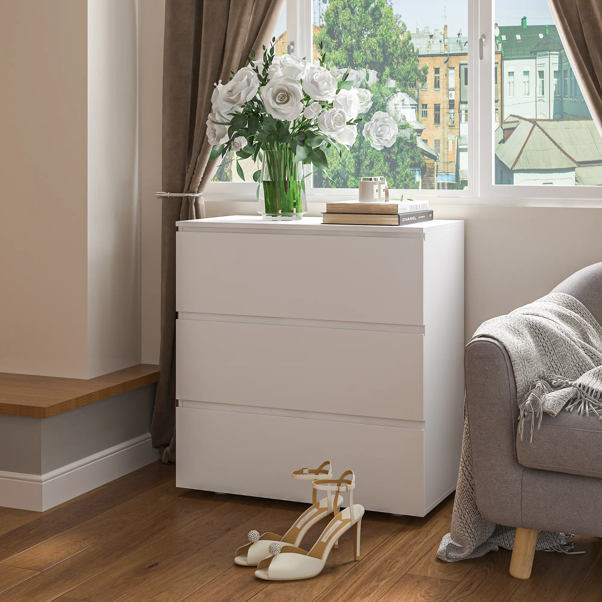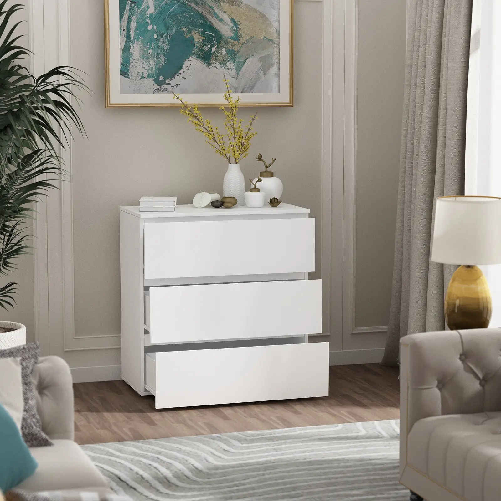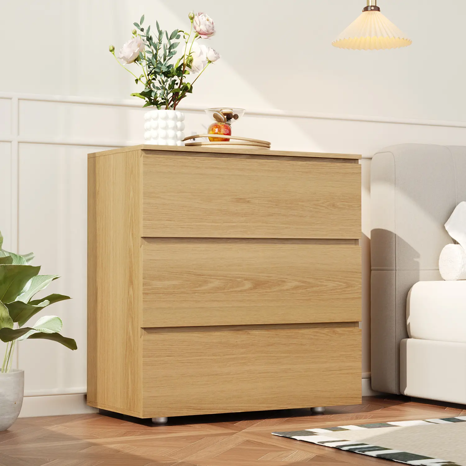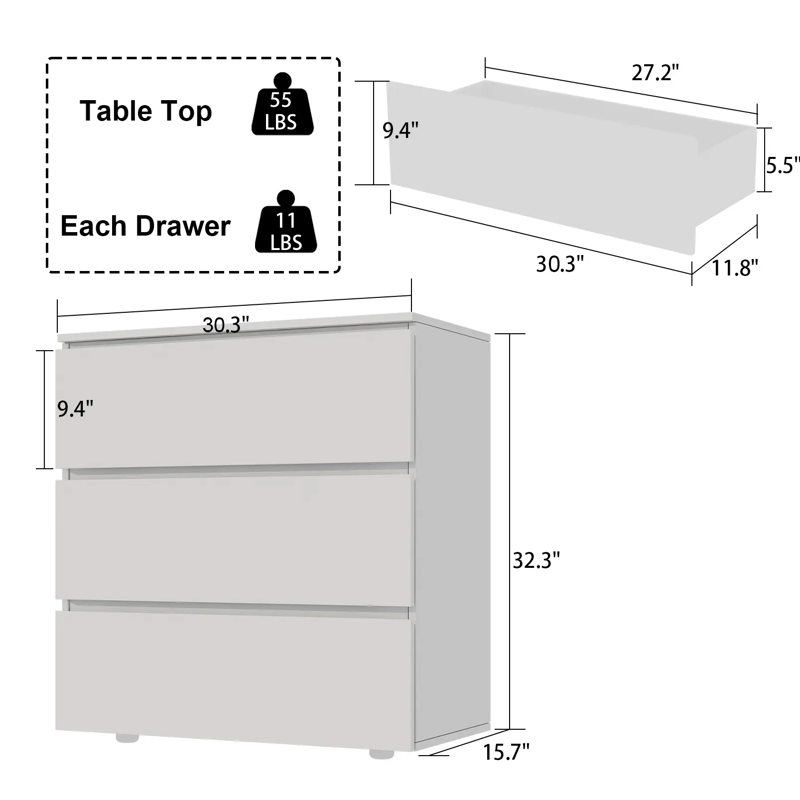 【Ample storage space】: Overall dimensions: 30.3”L x 15.7”W x 32.3”H. This 3-drawer dresser offers deep and wide space to store your socks, underwear, clothes, shoes, toys ans so on. You can make a full use of the the dresser top to display crafts or daily-used essentials