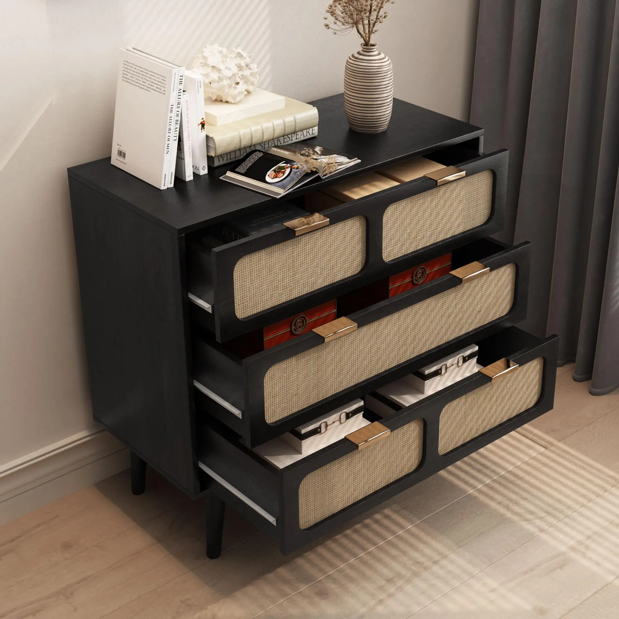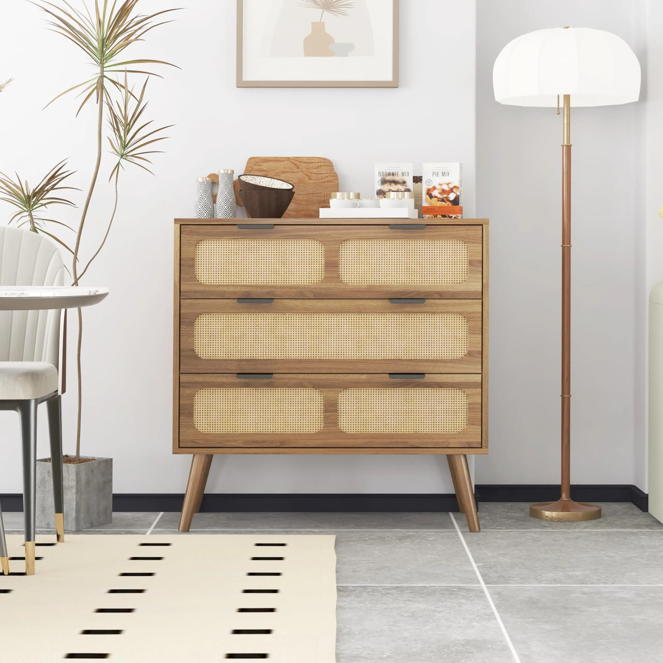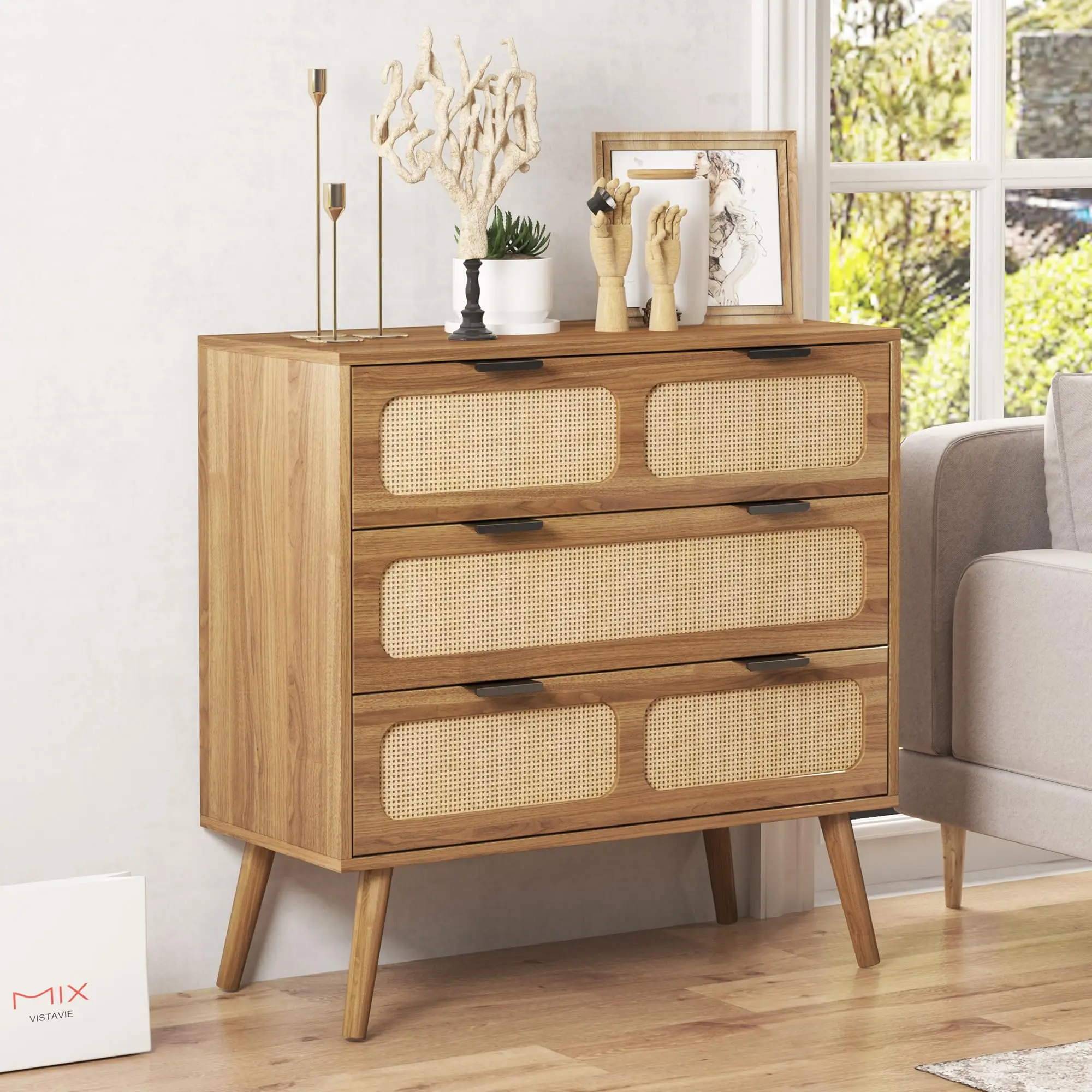 The style goes perfectly with my bedroom. Love the color, finish & the rattan. it’s a beautiful dresser. Easy assembly, just tedious. I would definitely recommend.
