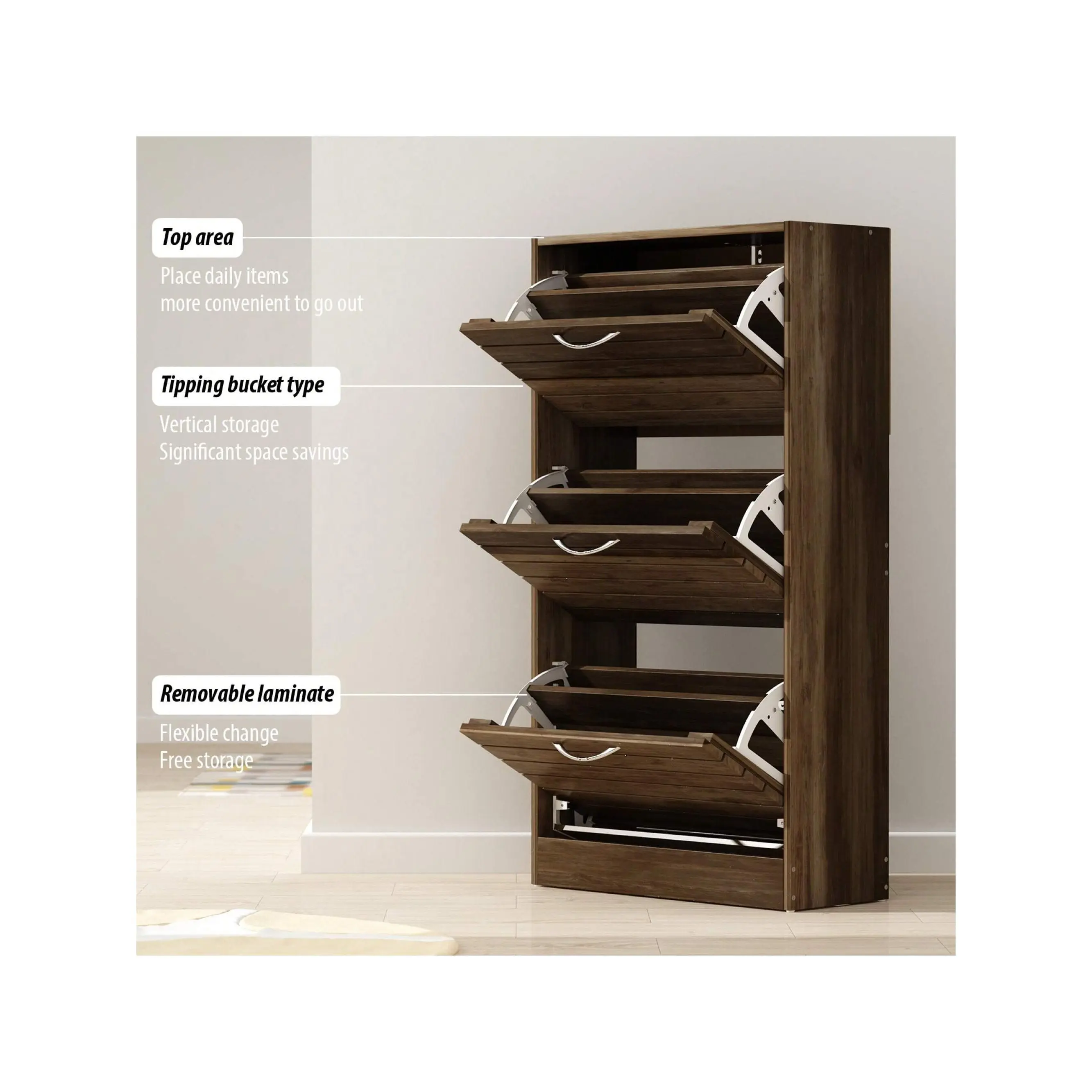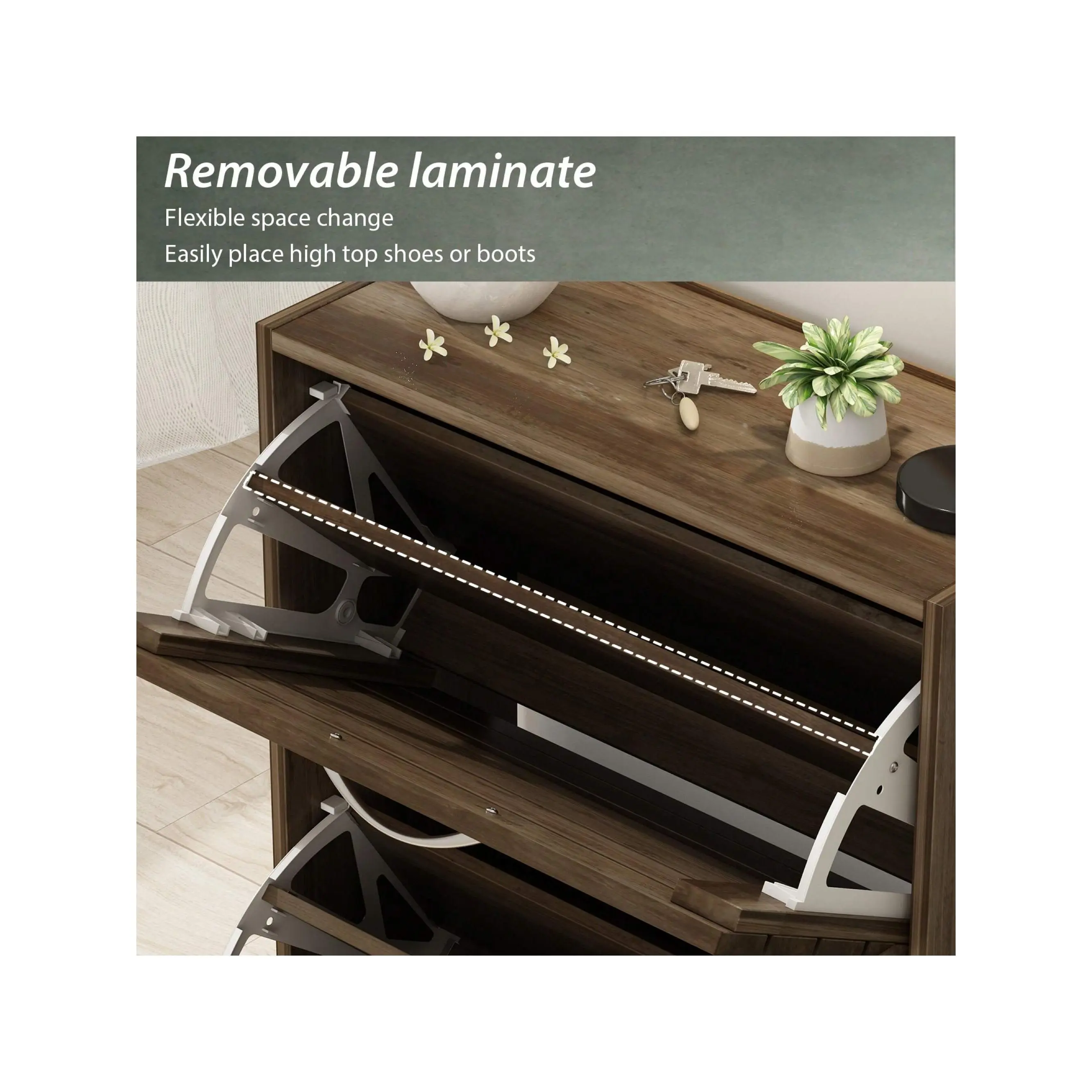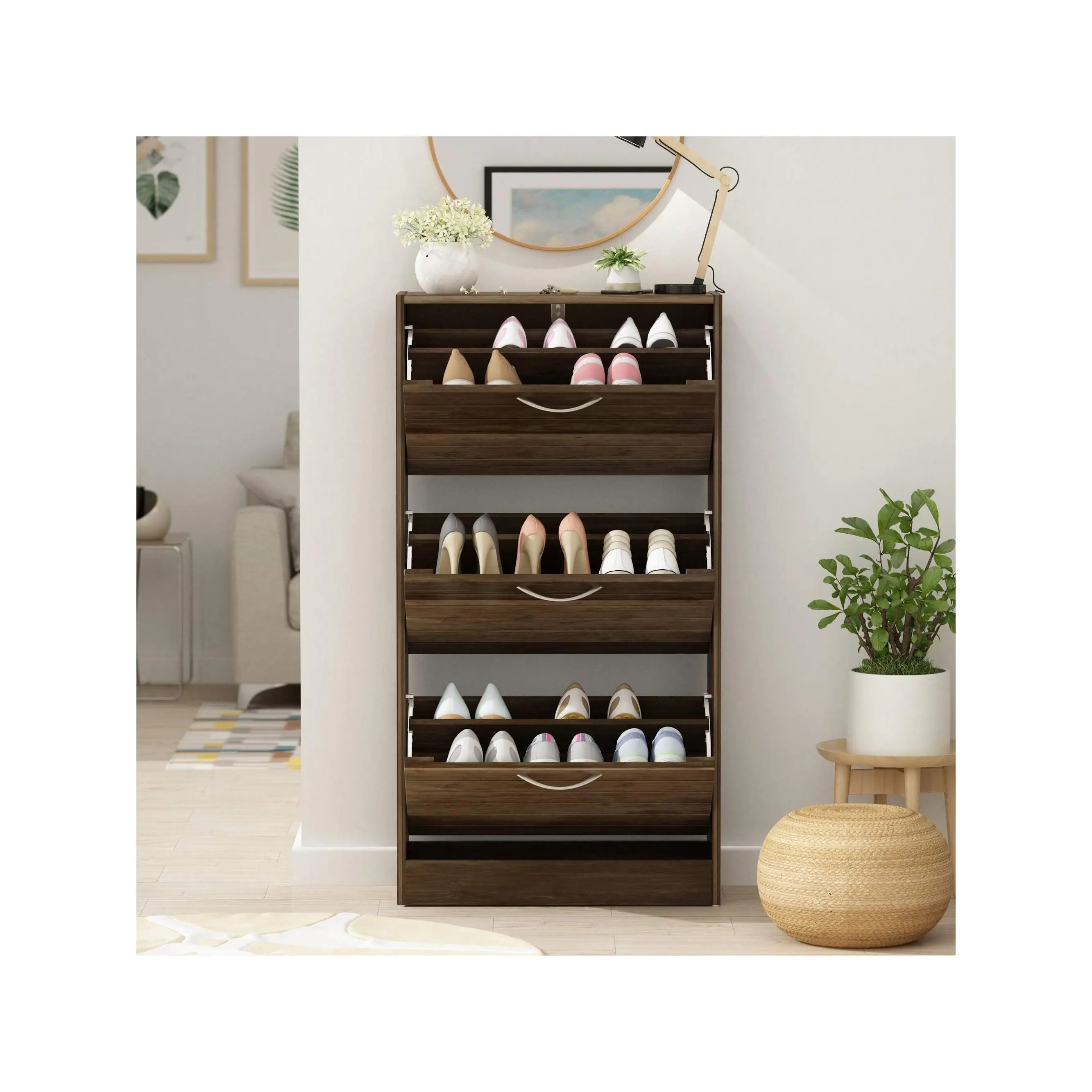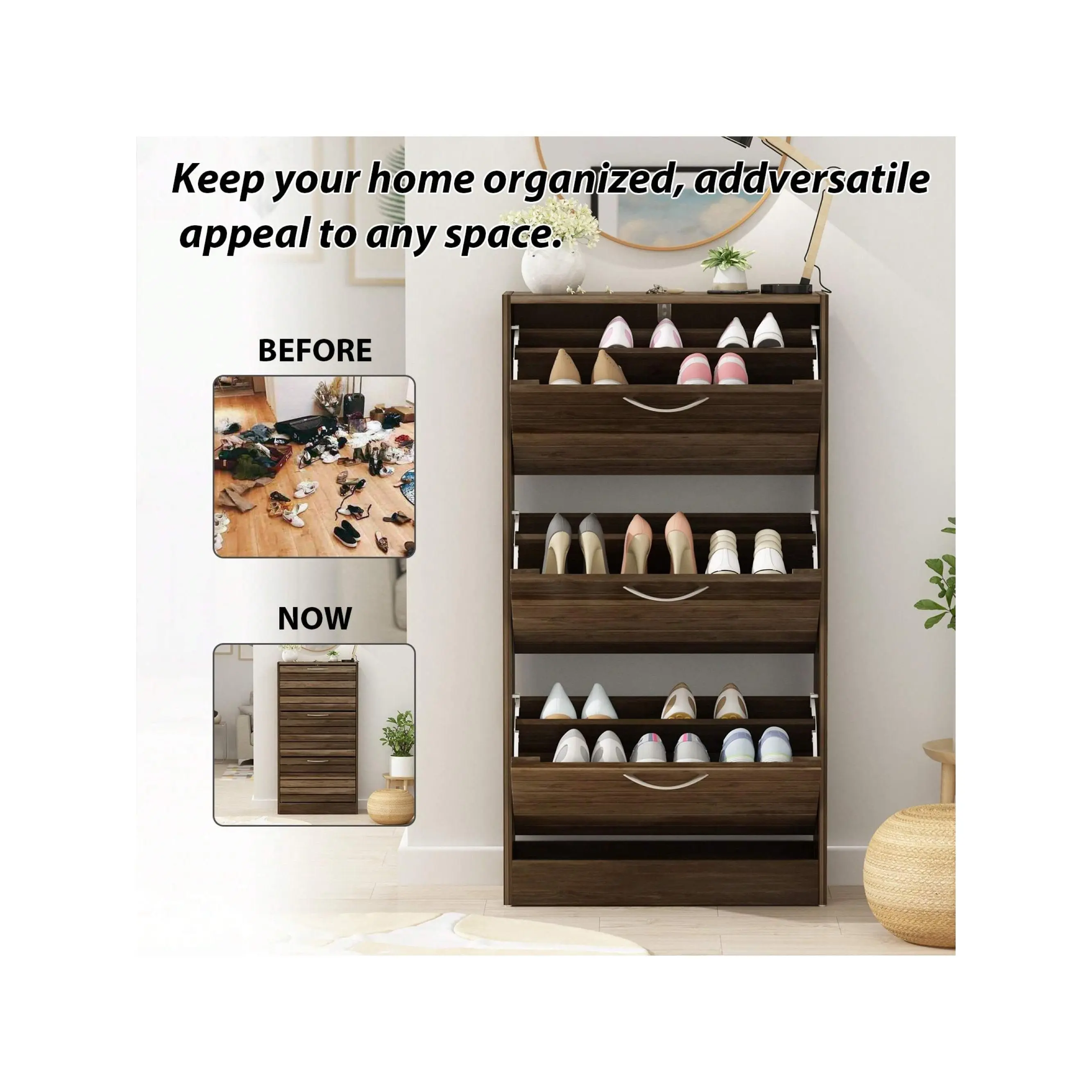 ·Functional - The shoe cabinet features 3 flip drawers, each of which equips divider making it 2 rows of shoe storage to organize your shoes well. It’s also possible to store heels or small boots if you remove the divider.