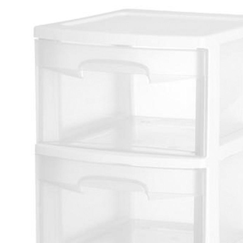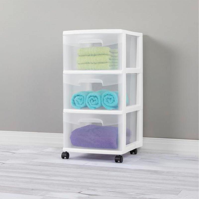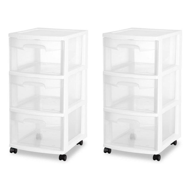 The Sterilite 2-Pack 3-Drawer Wheeled Plastic Storage Containers provide extra storage for homes, apartments, or garages. Each cart has three clear drawers for easy content identification, and casters for mobility. Ideal for organizing items in laundry rooms, closets, or bathrooms, these durable, easy-to-clean containers help eliminate clutter and keep belongings accessible.