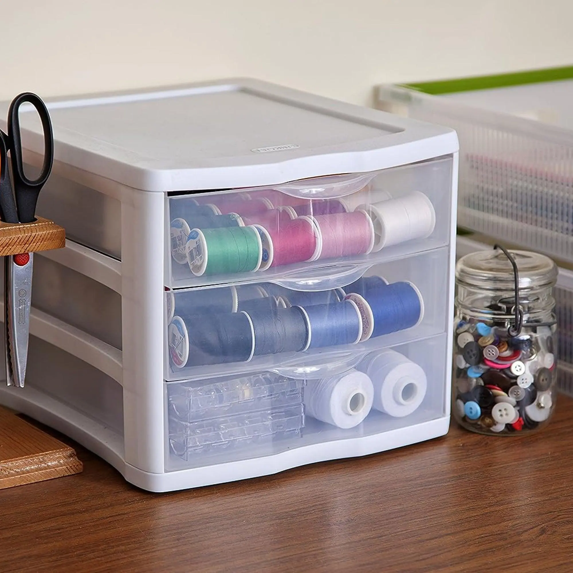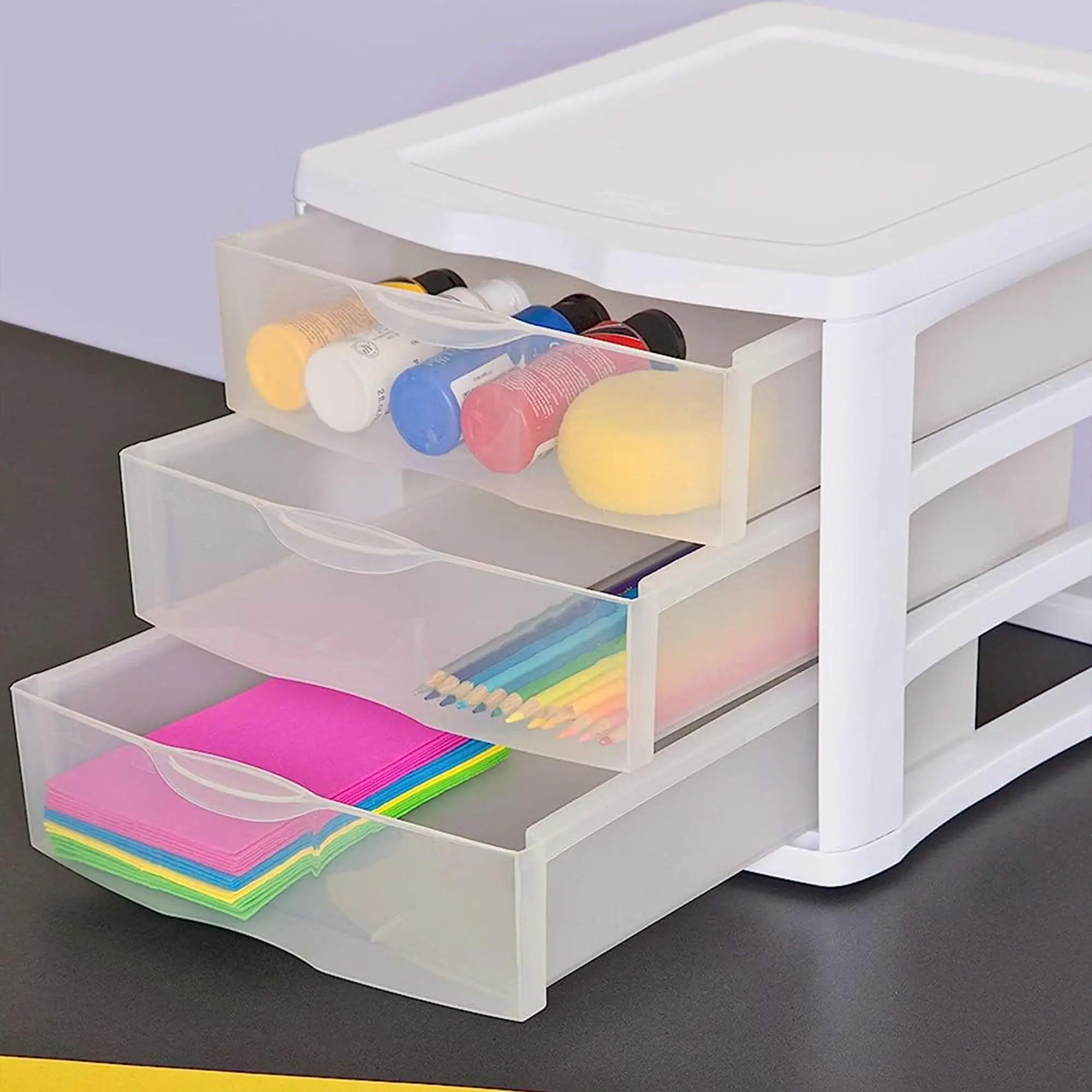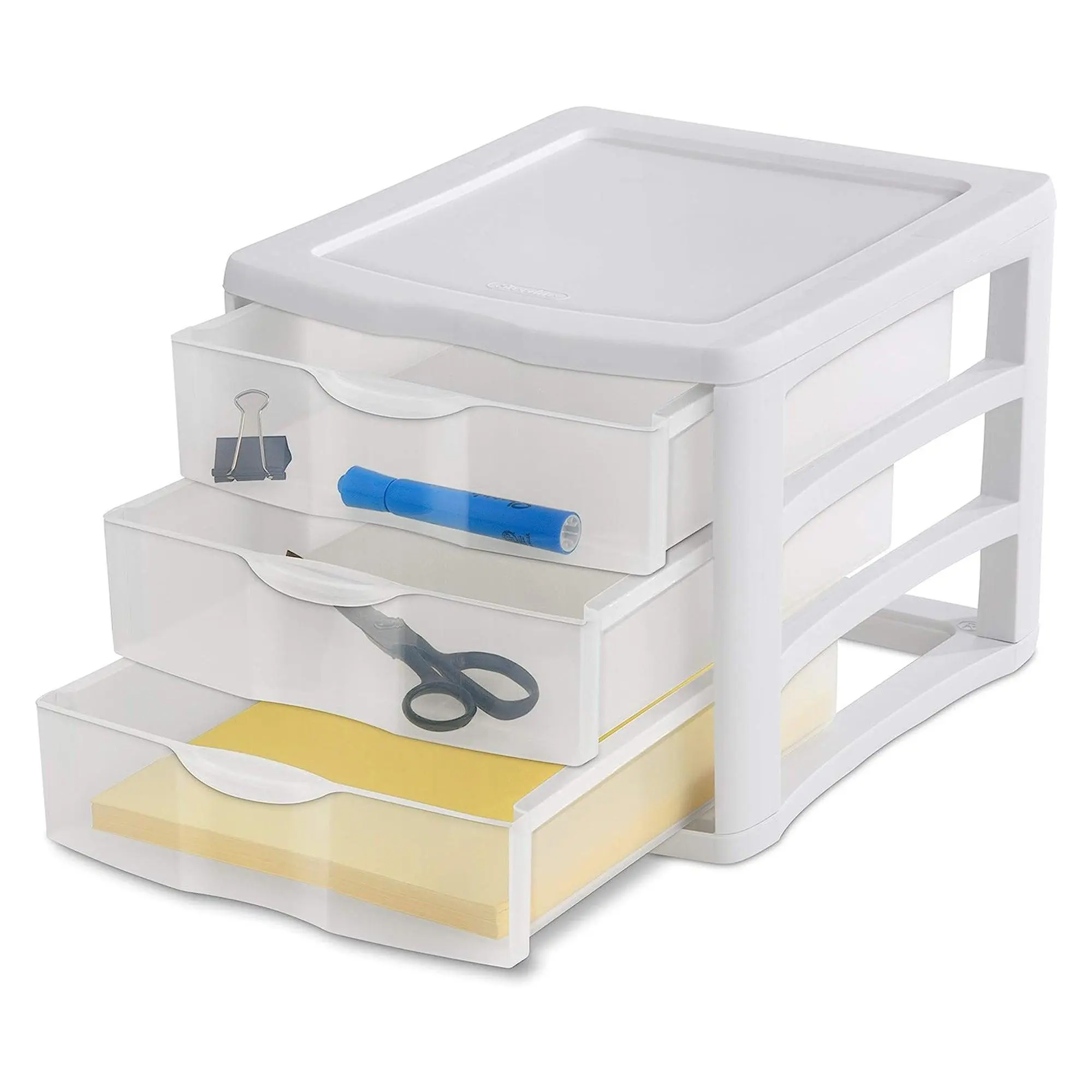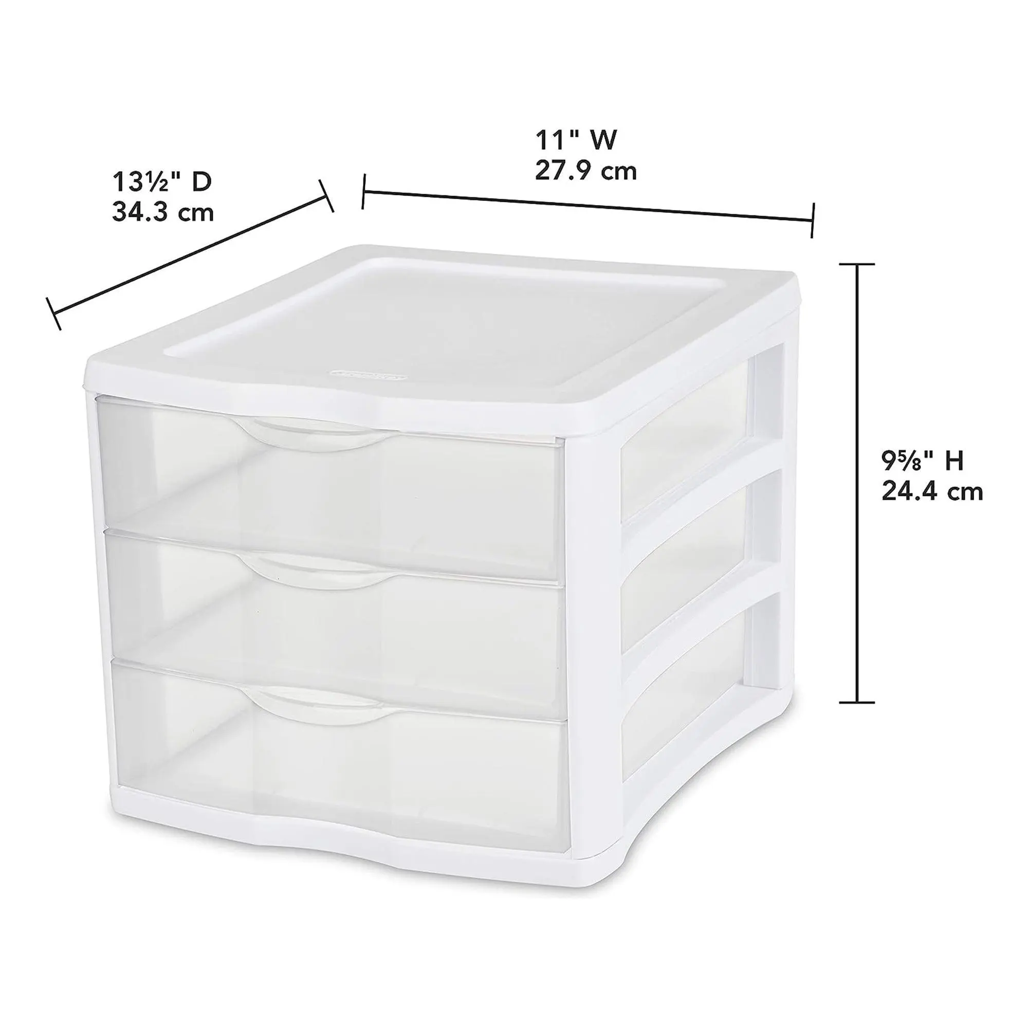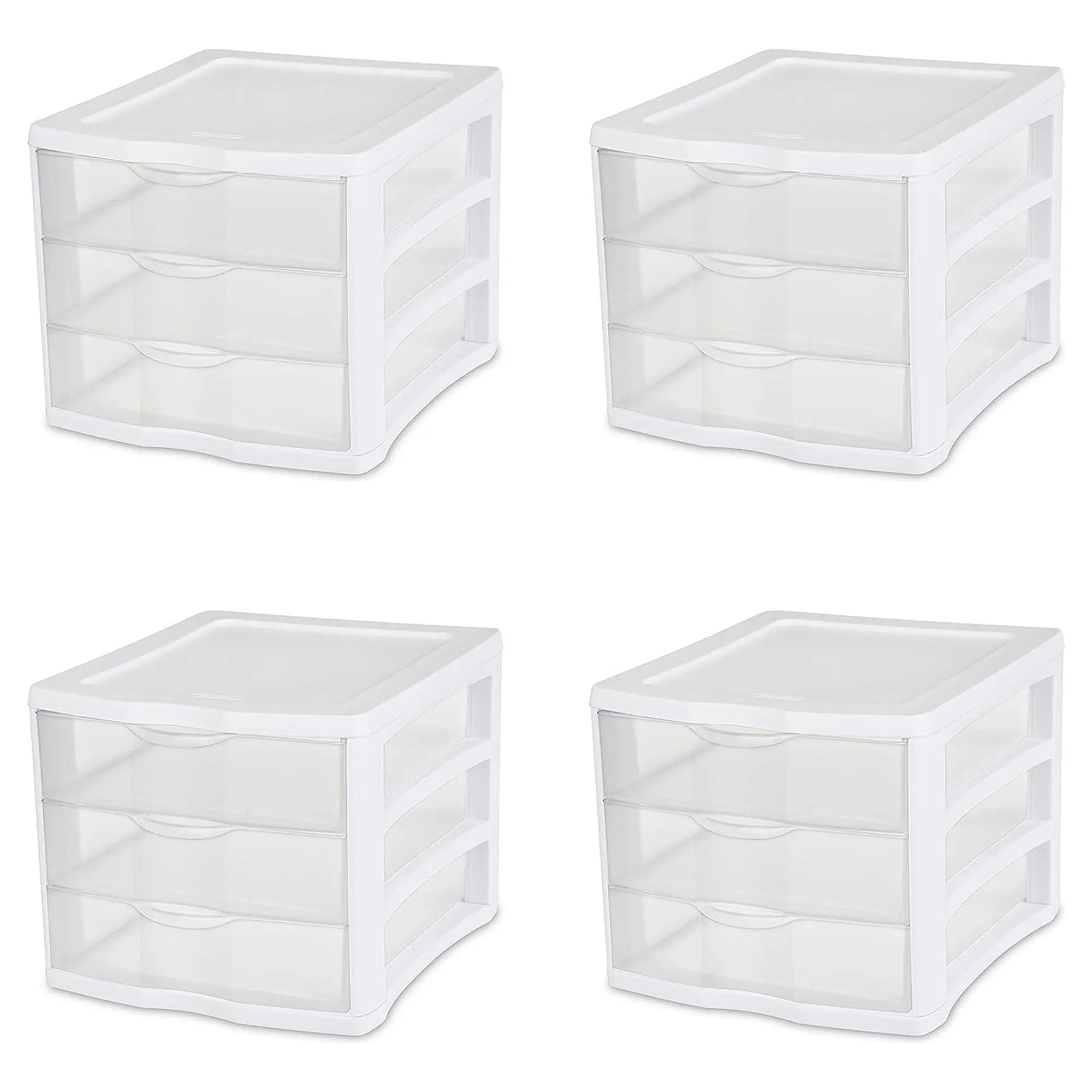 This small storage unit is ideal for offices, bedrooms, bathrooms, and dorms. Maximize your storage space with the Sterilite ClearView Plastic Stacking 3-Drawer Storage Organizer System, (4-Pack).