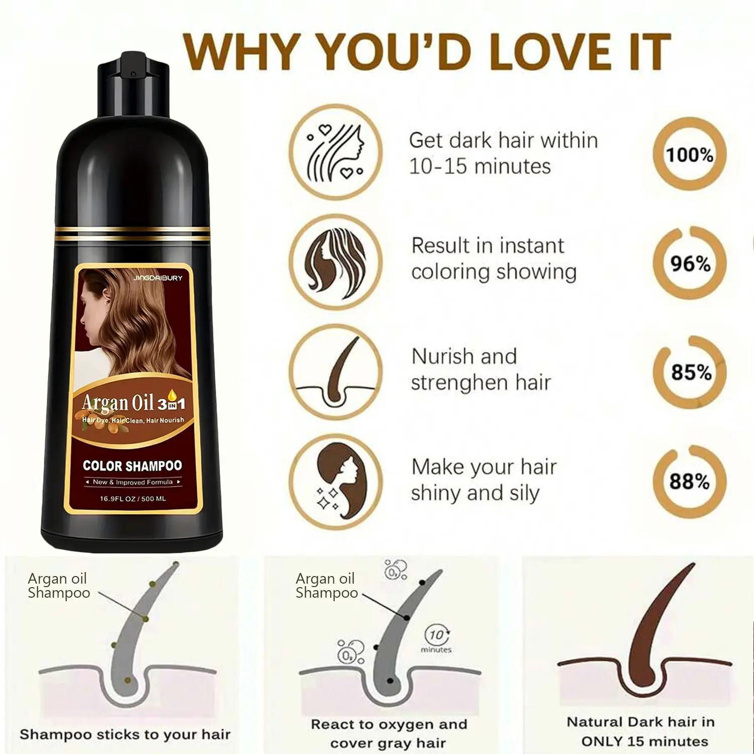 ·EFFECTIVE GRAY COVERAGE: Tired of seeing those pesky gray hairs? Use our Argan Oil Hair Dye Shampoo to revitalize your hair. It works on all levels of grays and all hair types. Helps you regain a fresh, youthful look that makes you shine