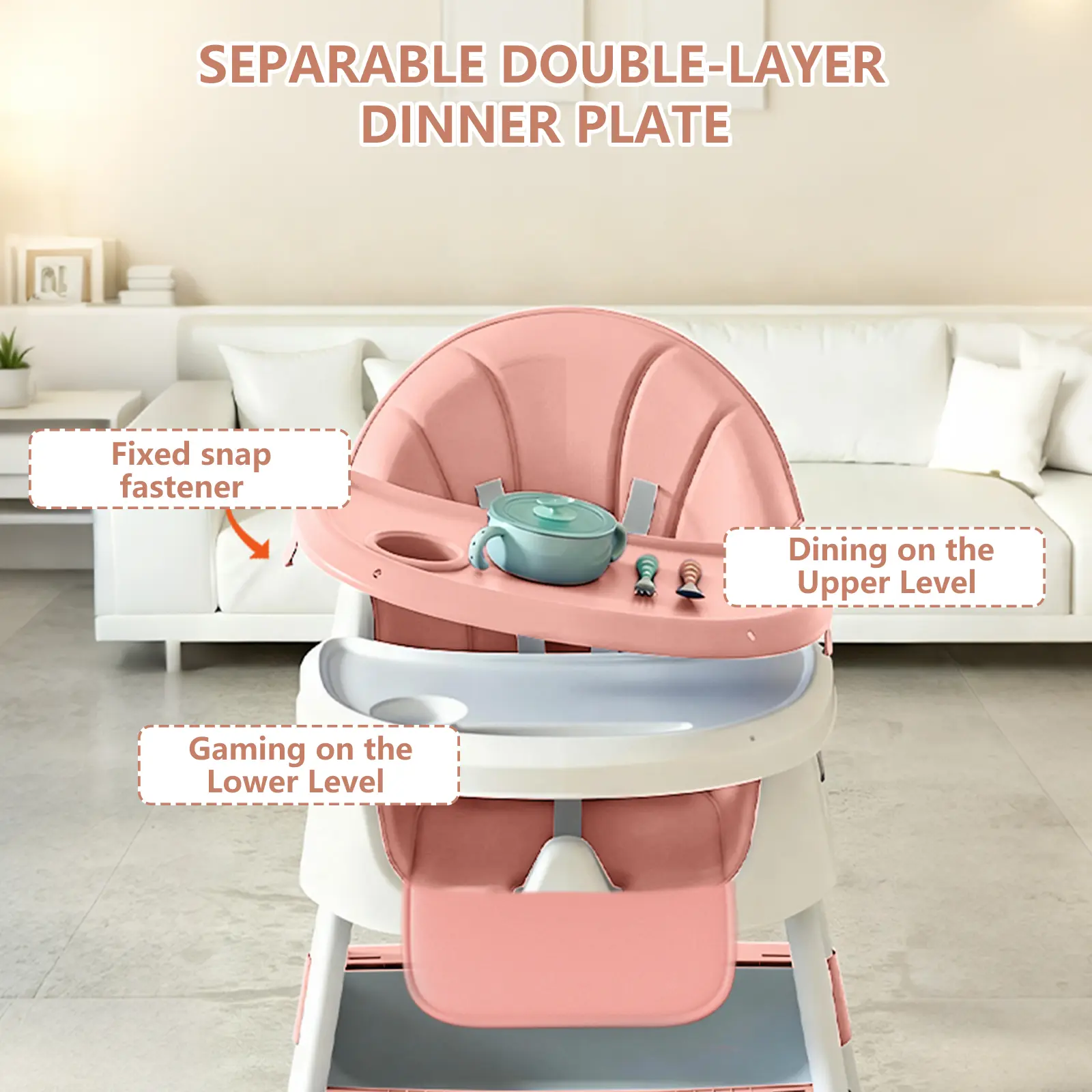 [DOUBLE TRAY DESIGN] Equipped with a 3-position adjustable tray that adapts to different developmental stages, this baby high chair's removable double tray has an upper layer for eating and a lower layer for play, seamless switching using side snap fasteners, a perfect blend for your baby's meal and play time!