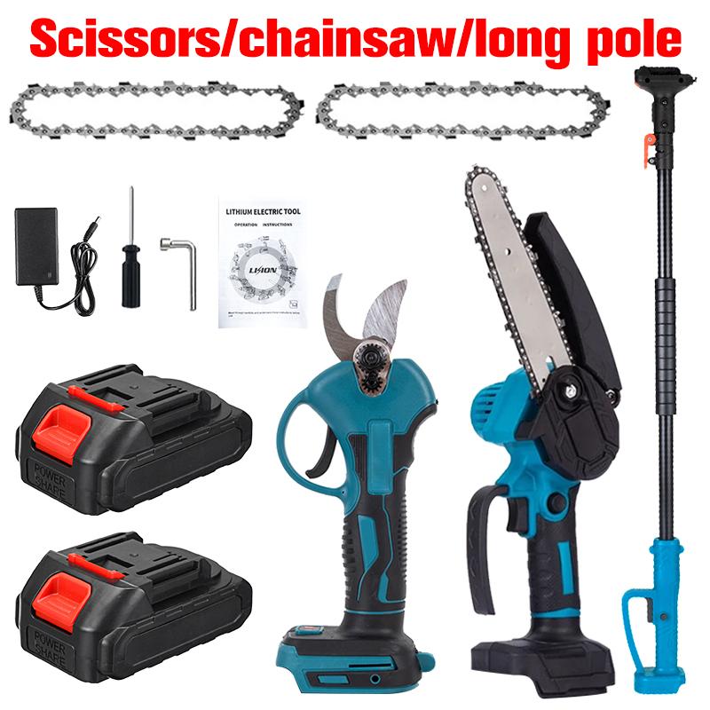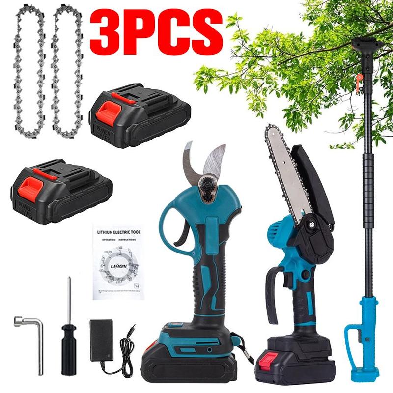 ·【All-in-One Electric Pruner Kit for Homeowners & Gardeners】 Designed for yard work, garden trimming, and DIY landscaping, this 3-in-1 electric pruner kit includes a 6-inch cordless chainsaw, electric pruning shears, and an 6.5ft adjustable extension pole, perfect for seasonal tree pruning. The stylish blue color adds a pop to your tool set, making it both practical and attractive for home users.