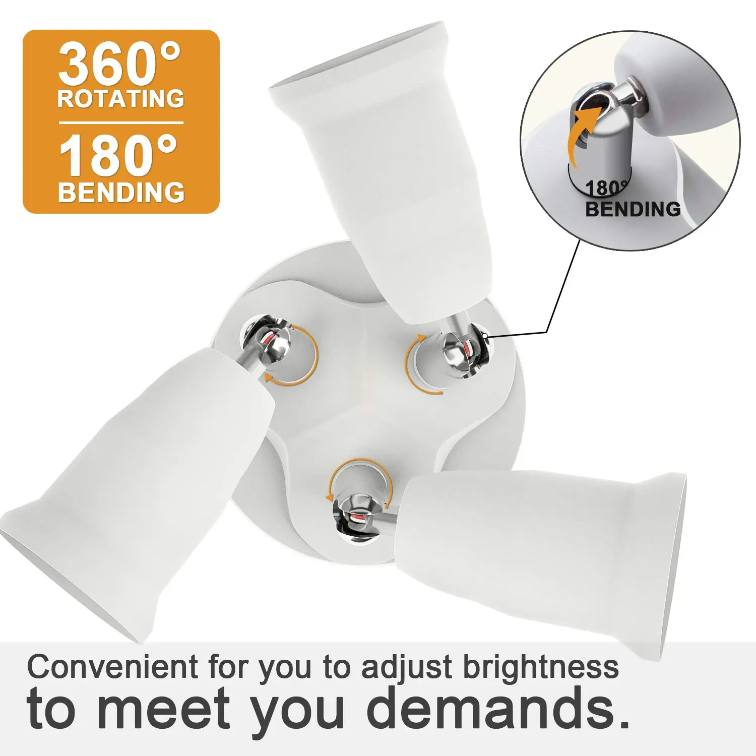 ✔ Adjustable Socket: Three in one E26 light socket adapter allows 3 bulbs installed to one socket. Each socket can be 360° rotated and 180° bended, convenient for you to adjust the lighting angle according to you needs.