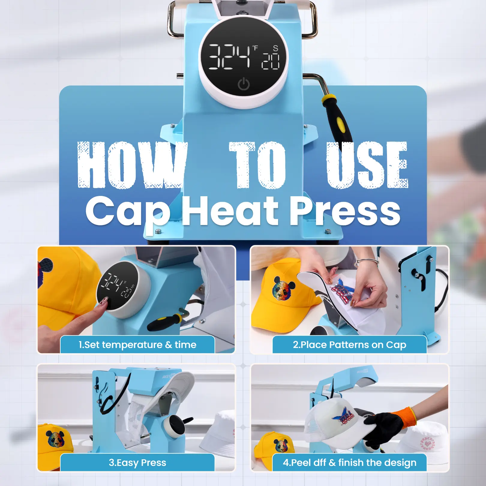 【Small Tips】Comes with 1 heat press, 3 interchangeable cap platens, 1 blank cap, 1 pair of gloves, 1 roll of tape, and 5 sheets of patterned DTF stickers. If you have any questions, please do not hesitate to contact us.