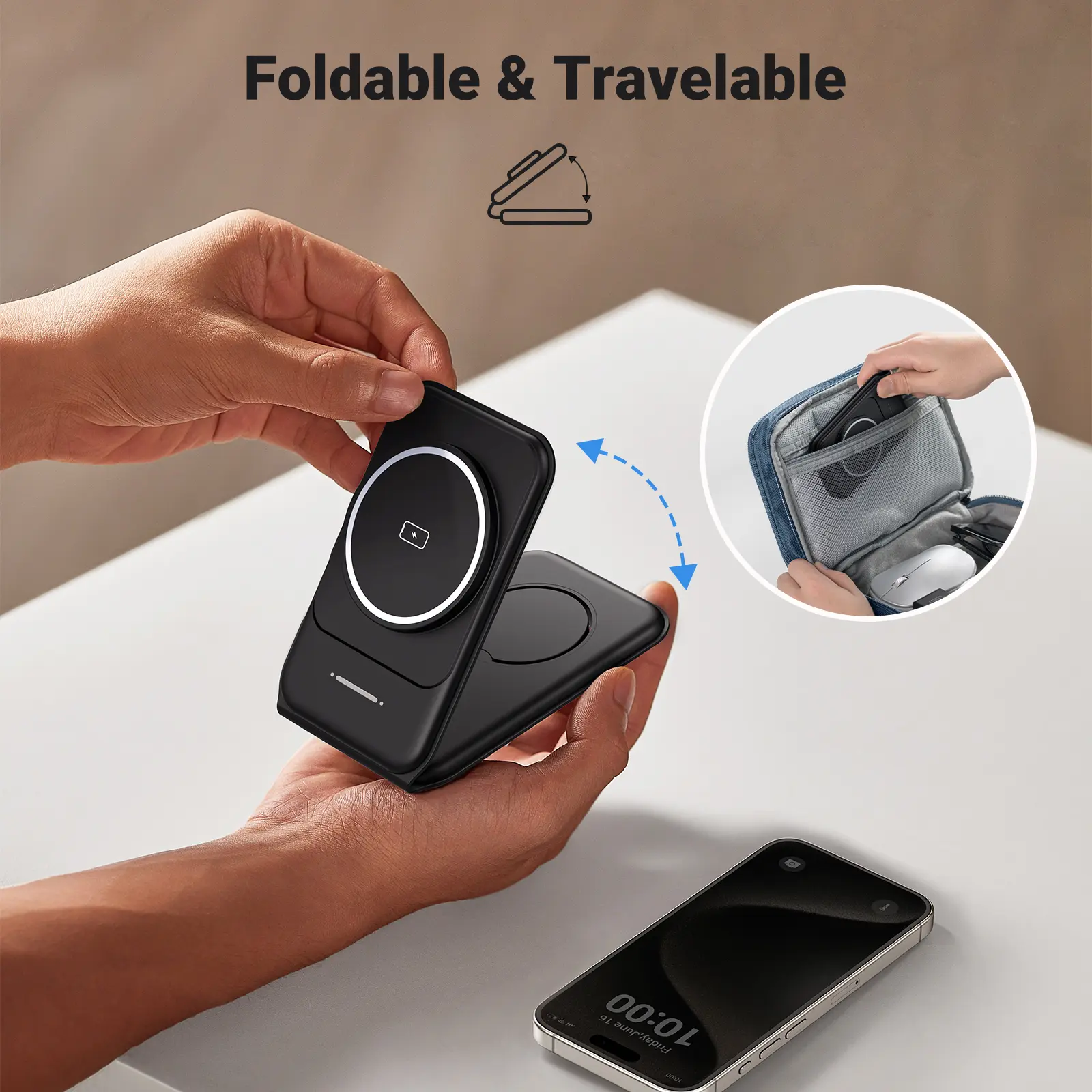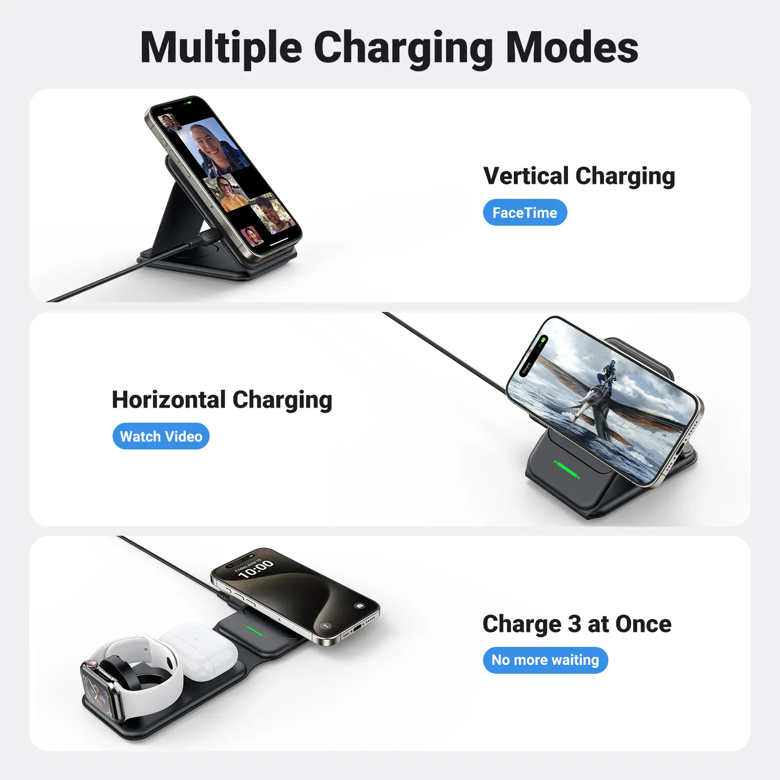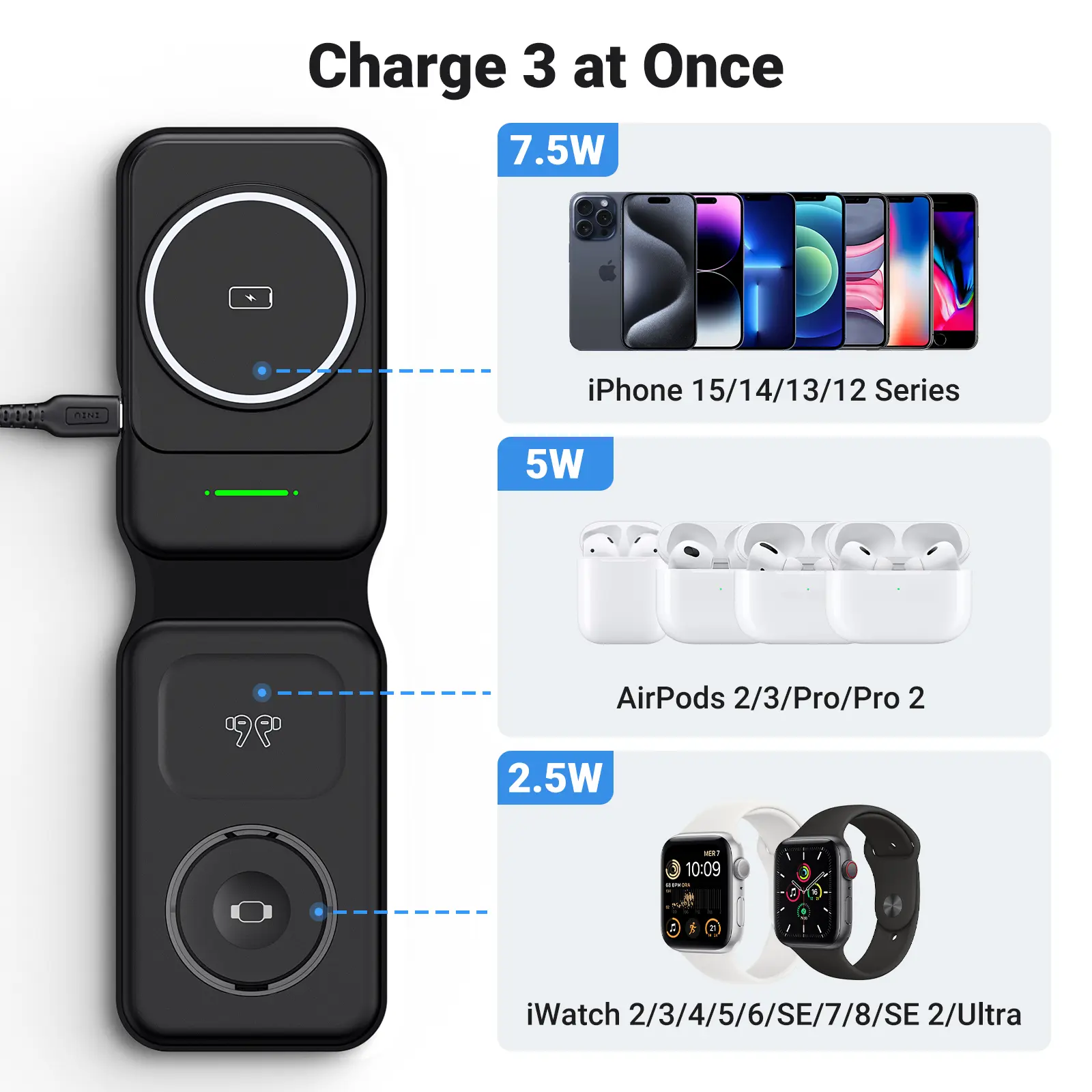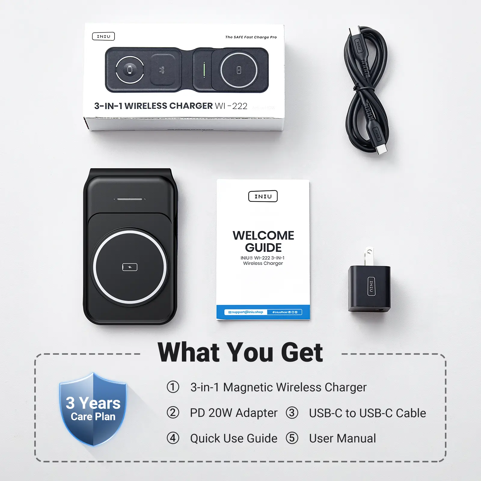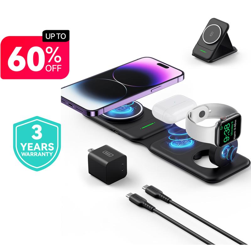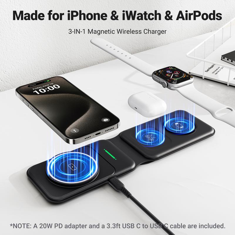 Ever get tired of juggling multiple chargers for your iPhone, Apple Watch, and AirPods? Meet the INIU 3-in-1 Magnetic Foldable Wireless Charger Stand—the perfect all-in-one charging solution for Apple fans on the move. Whether you're gaming, working, or traveling, this stand securely holds your iPhone with strong magnets (compatible with iPhone 12 and newer) so you can charge without interruptions. It powers your phone at 7.5W, AirPods at 5W, and Apple Watch at 2.5W, covering all your essentials simultaneously. The foldable design with a soft silicone hinge lets you pack it flat into your backpack, saving space and avoiding messy cables. Plus, the included 20W adapter and USB-C cable ensure fast, safe charging wherever you are. Inside the box, you'll find everything you need to get started: the charger, power adapter, cable, quick use guide, and user manual. Backed by a 3-year warranty and lifetime technical support, this award-winning charger is a smart, stylish upgrade to your charging routine. Ready to simplify your life and power up all your Apple devices effortlessly? Grab the INIU 3-in-1 charger and enjoy hassle-free charging anytime, anywhere!