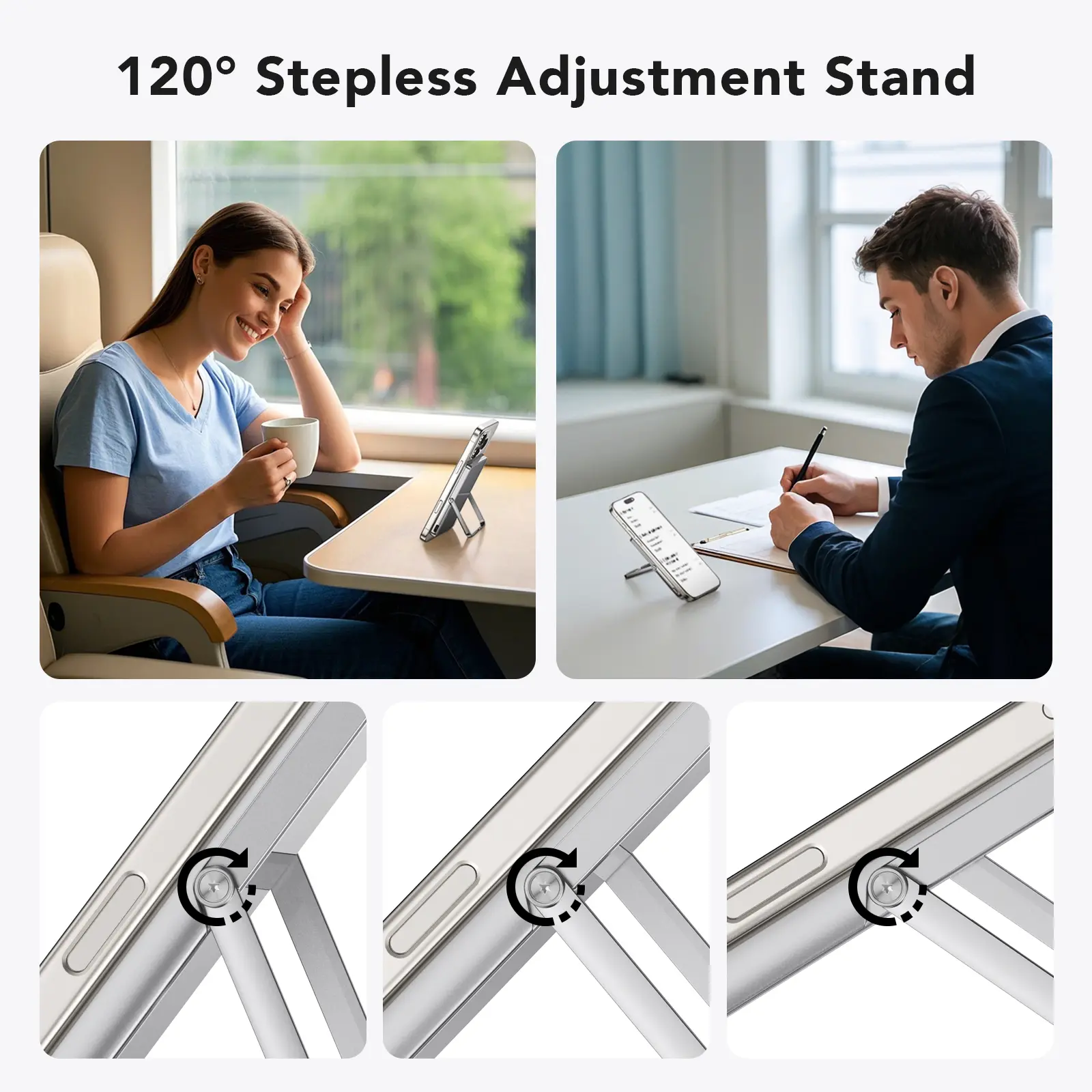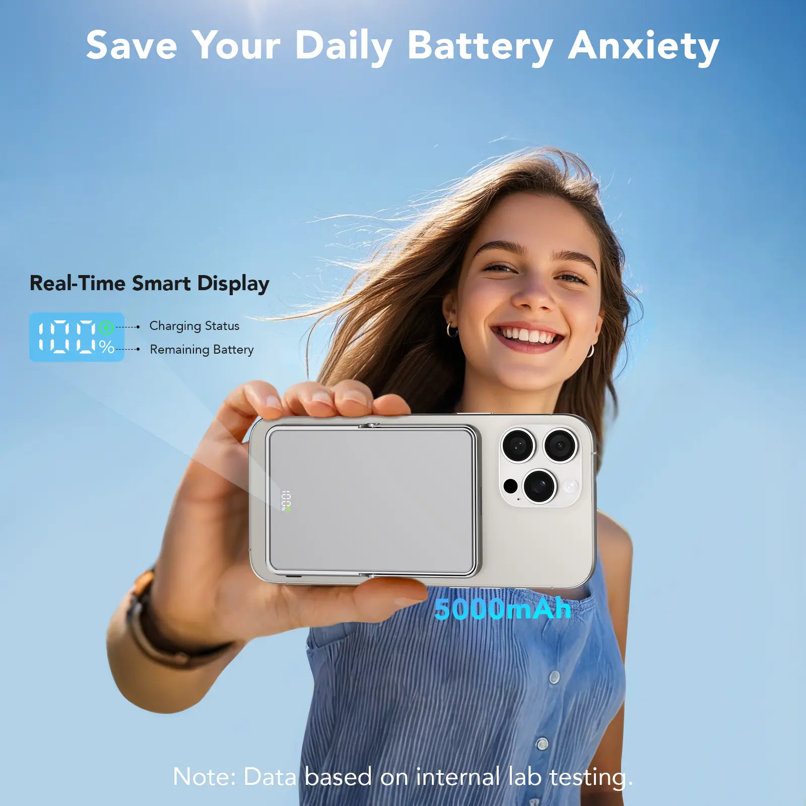 Flexible 120° stand adapts to various usage scenarios. Ideal for video calls, watching content, and hands-free phone use. 5000mAh Battery for All-Day Power Reliable capacity ensures enough power for your daily use. Supports both wired and wireless charging.