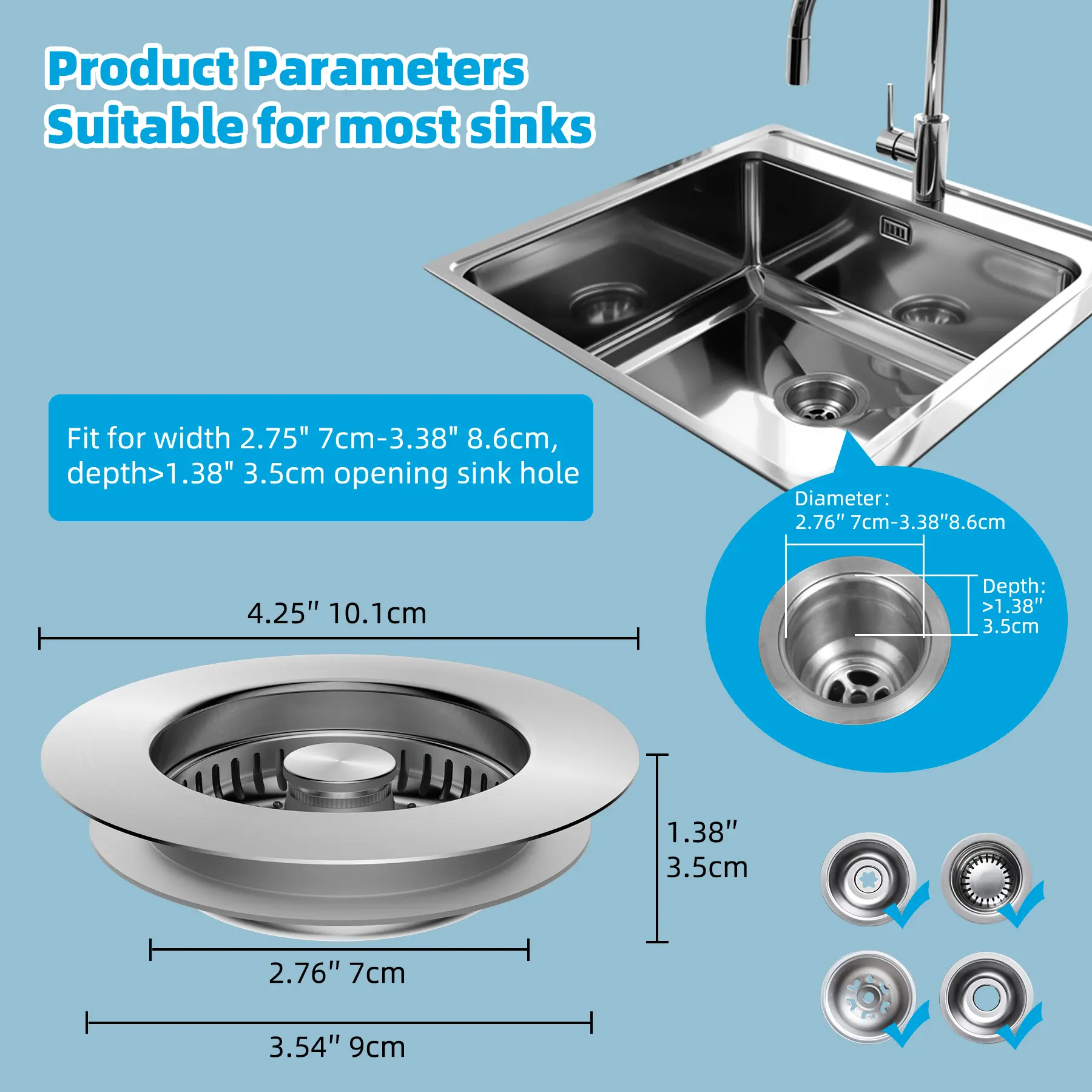 Fit Most US Standard Kitchen Sink: Our kitchen drain strainer is designed to accommodate US standard sink hole openings ranging from 2.76" to 3.38" in width and deeper than 1.38", this Hibbent stainless steel sink stopper is compatible with US Standard 3-1/2 inch drains; Before purchasing, kindly ensure the diameter and depth of your sink drain hole opening match these specifications
