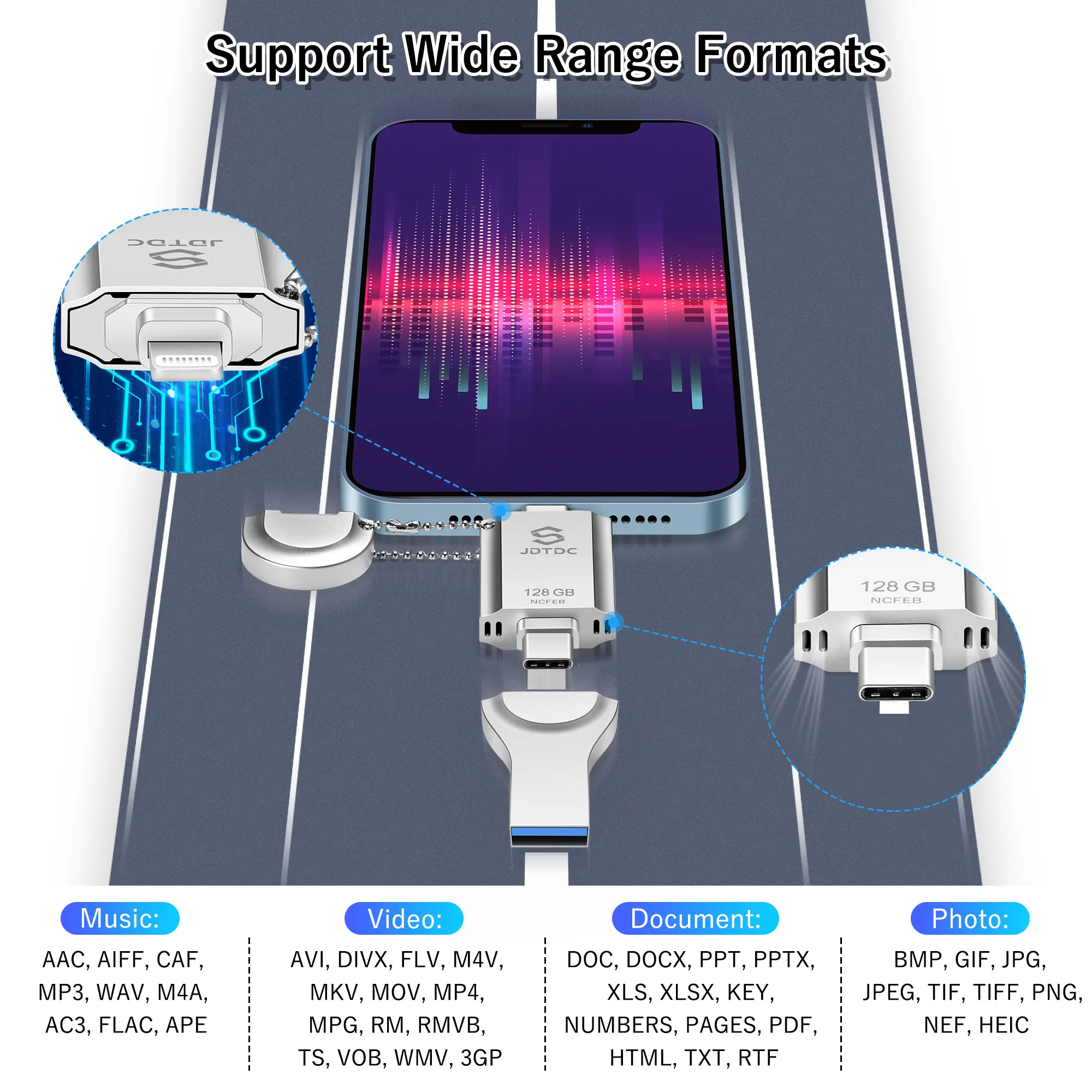 ·The USB flash drive is made of Zinc Alloy, adopts Multi-connectors and Excellent heat dissipation design, which insures Excellent Performance and High Transfer Speed. Only takes about 3 mins to transfer 1000 photos via the iPhone memory!