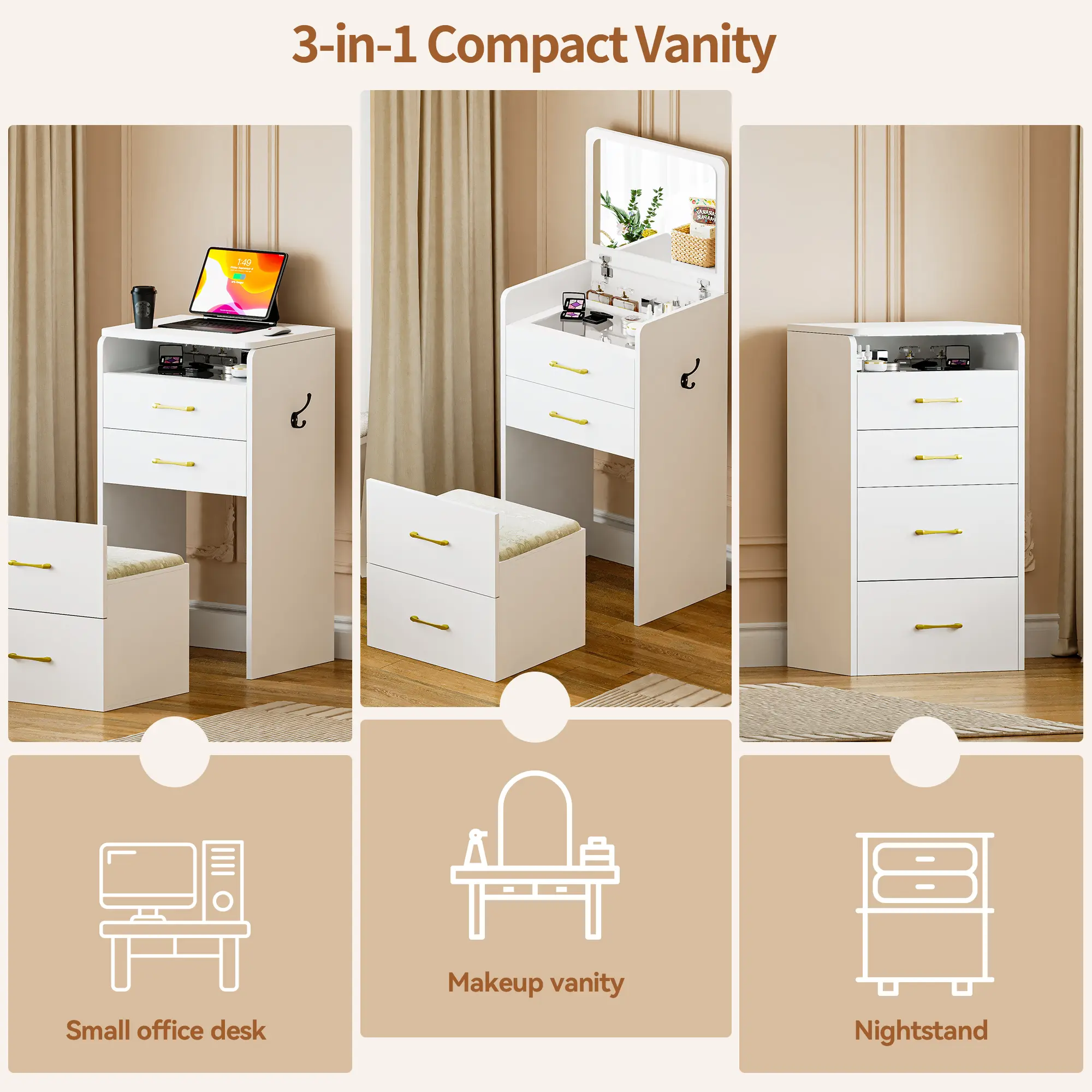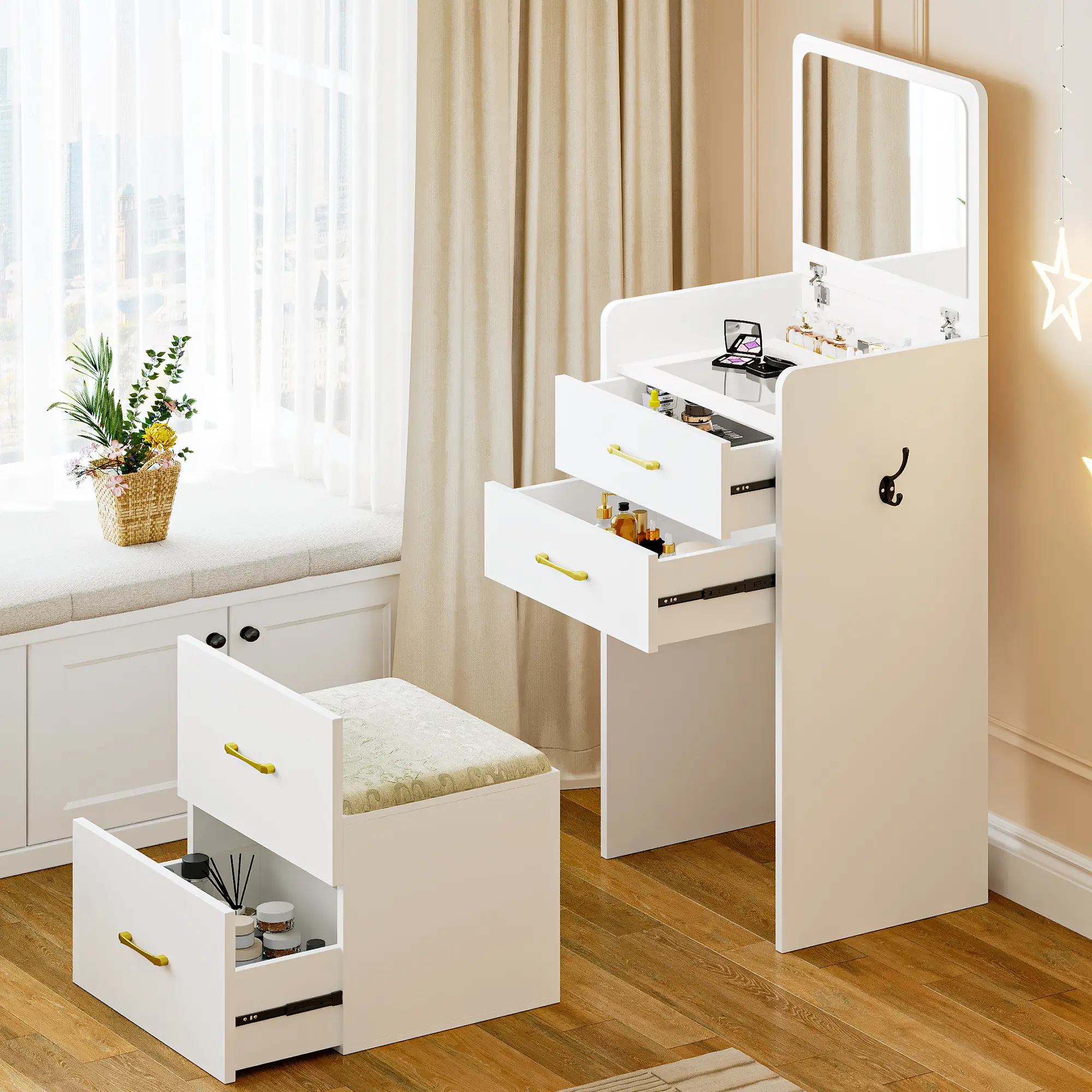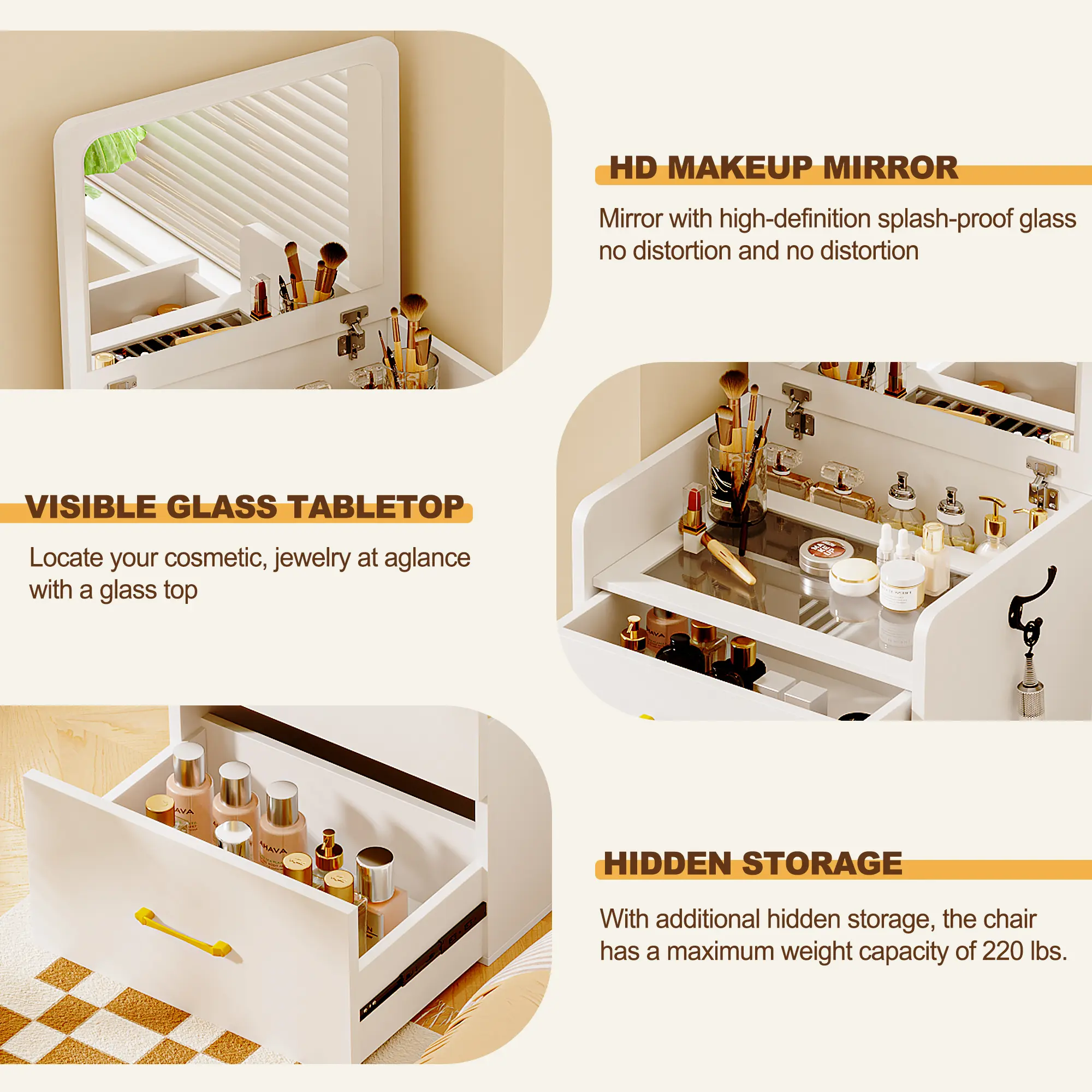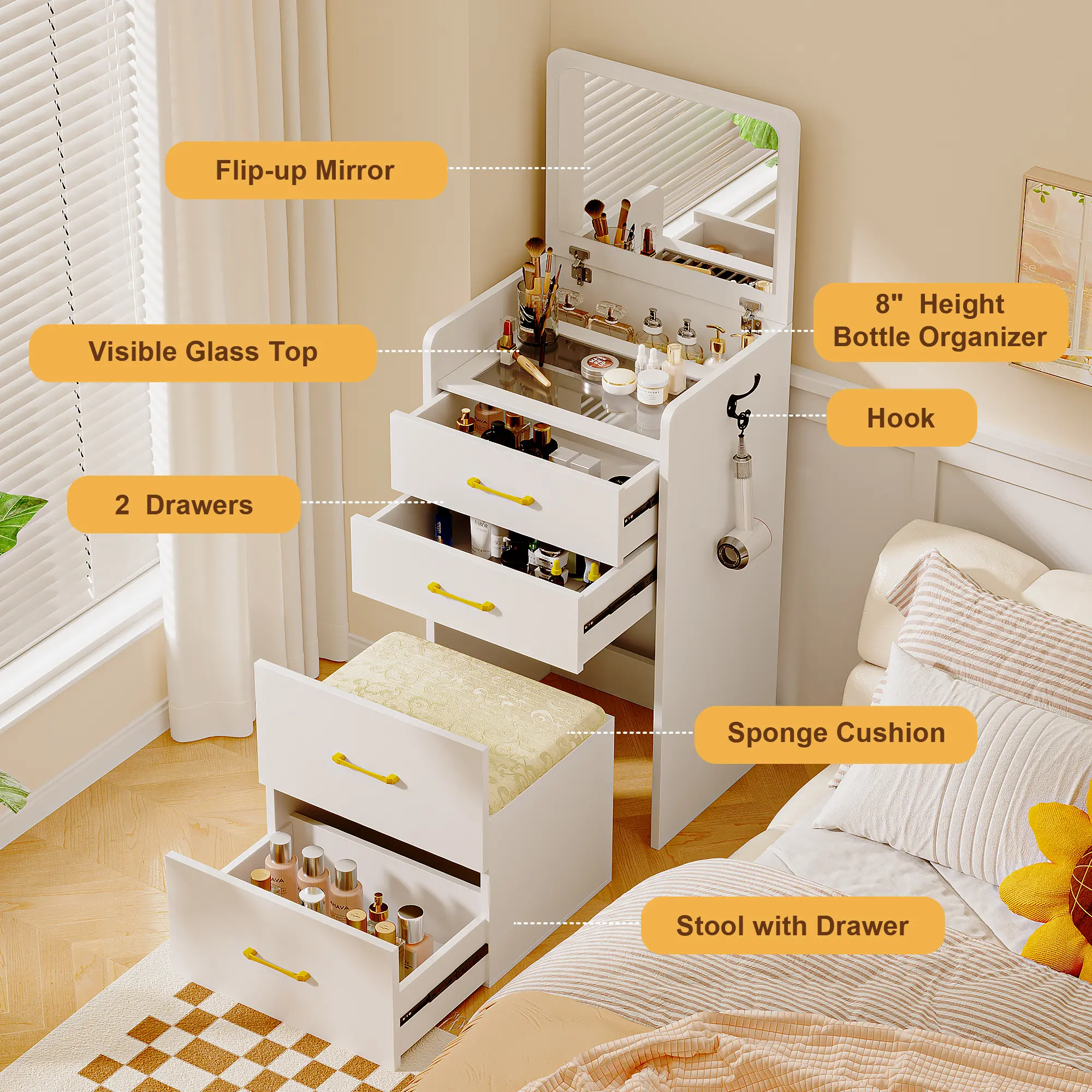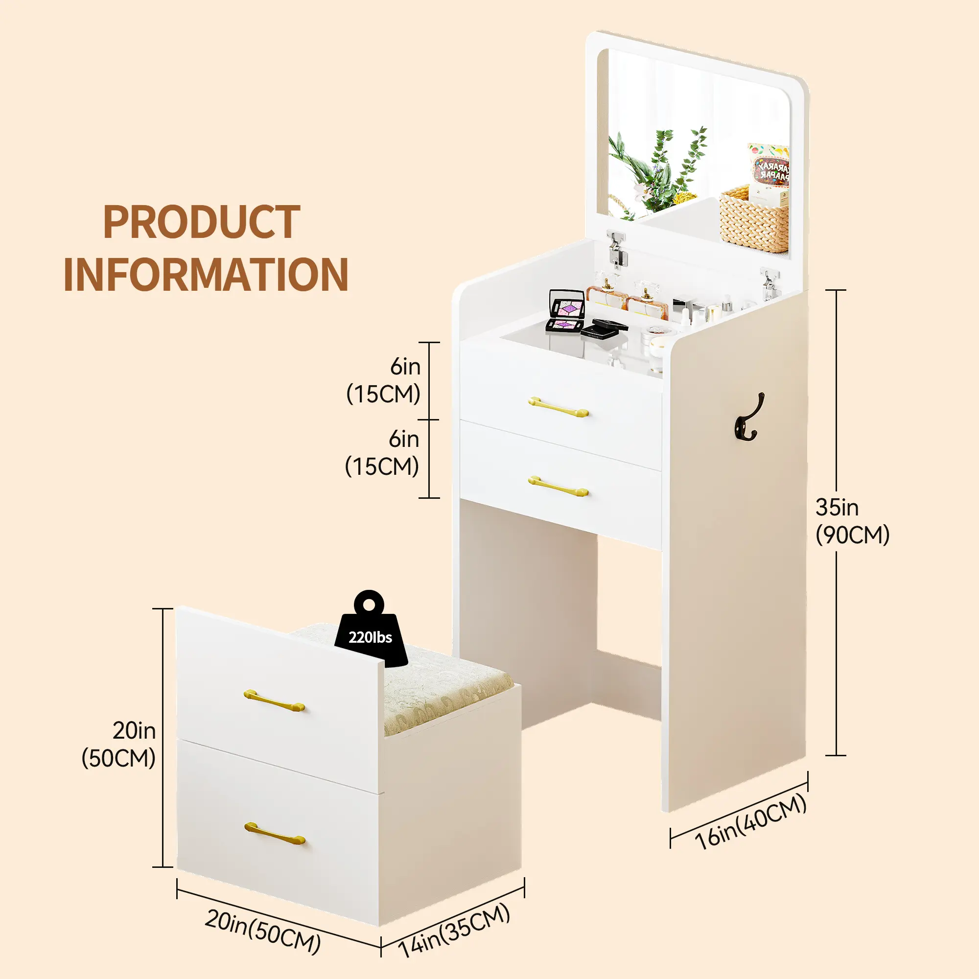 The vanity itself is a 5 star! It’s cute, and comes as described. However the 3 star comes from how TEDIOUS it is to put together, and the instructions do not help at all. Some pieces almost broke due to the poor instructions and overall took me about 3/4 hours to put together.. but overall i love!!
