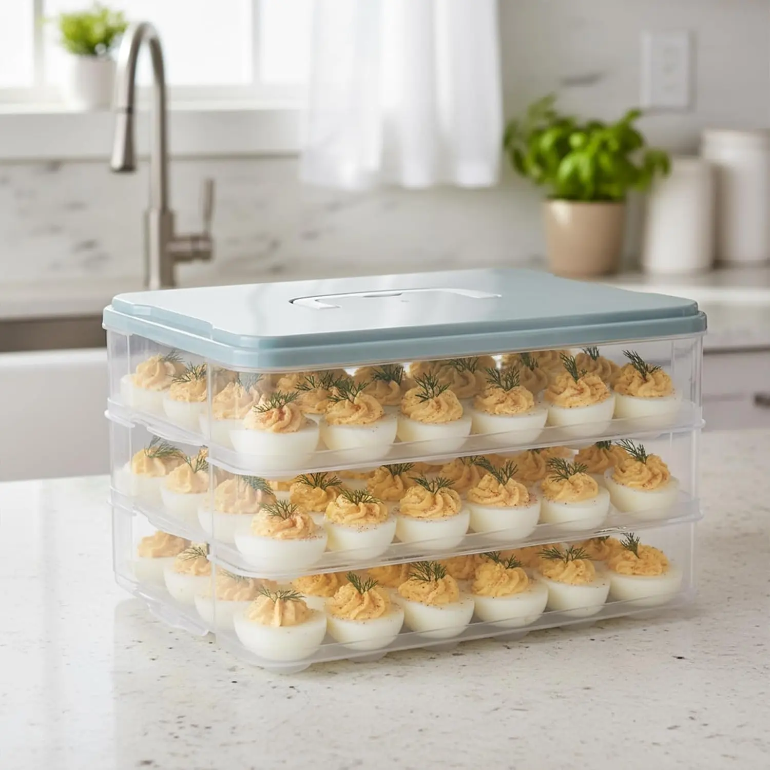 【Multi-Purpose Kitchen Essential】 - Beyond eggs, use this versatile devil egg holder for storing appetizers, cupcakes, or party snacks. Ideal for holidays, potlucks, or daily kitchen use - a -have festival party egg carrier that transitions seamlessly from fridge to table.
