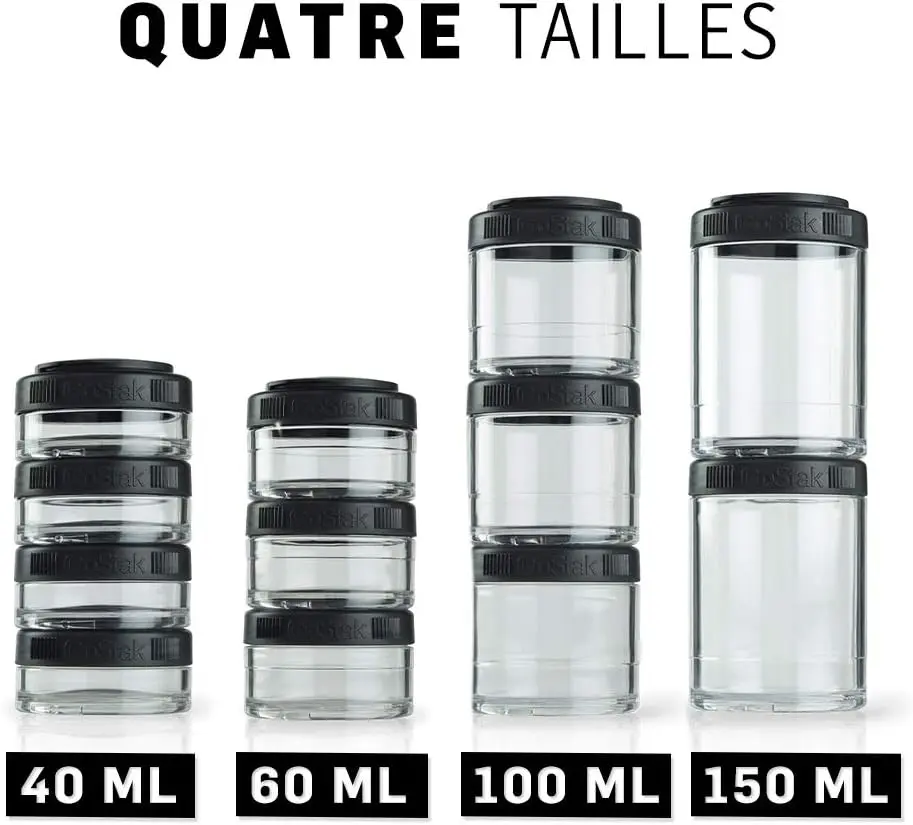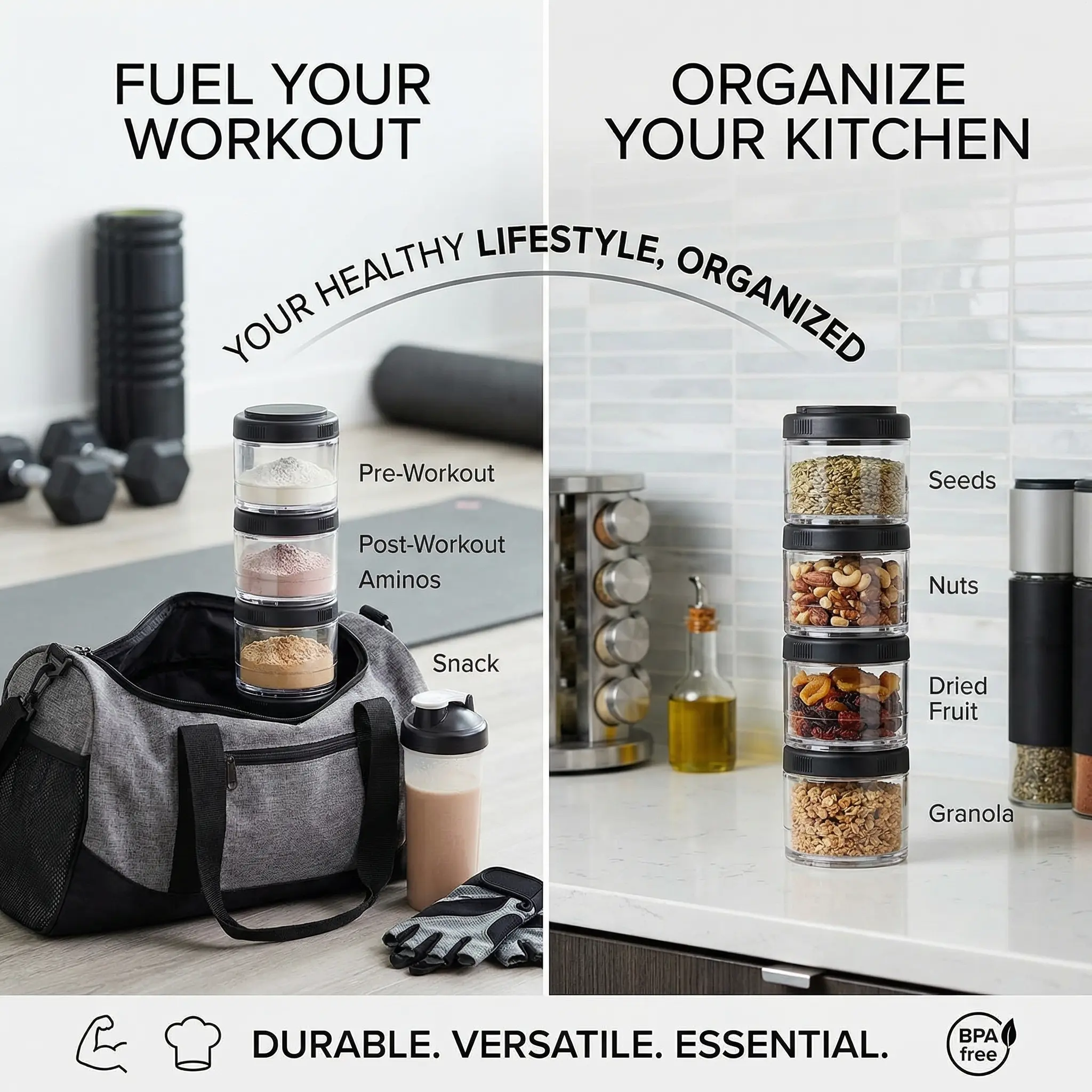 Compact and versatile, they fit inside standard shaker or mixing bottles, making them ideal for storing powders, snacks, or small ingredients. The containers are freezer- and dishwasher-safe for added convenience and easy cleaning.