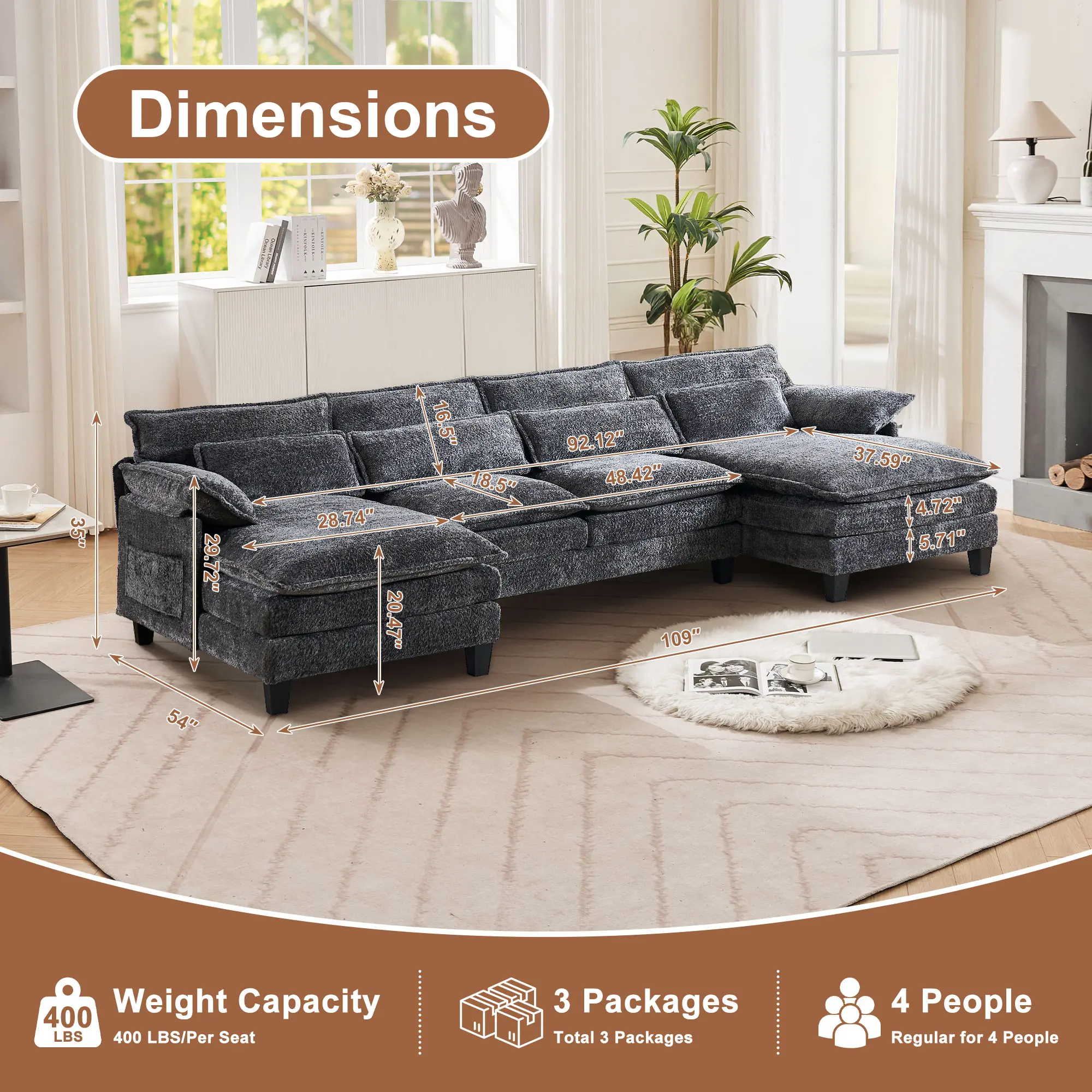 ·Sturdy 110-inch Sectional Sofa:Our impressive 110-inch sectional sofa has been carefully crafted to be both sturdy and comfortable.Featuring a sturdy steel frame and solid wood backrests,this sofa can hold up to 1,200 pounds,making it perfect for families and gatherings.Not only does this versatile sofa add style to your home decor, it is also practical and comfortable,making it ideal for any room. Use our sturdy and durable sectional sofa today