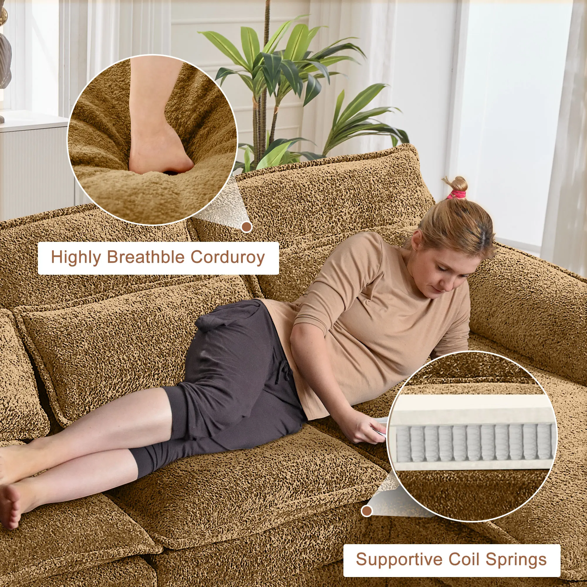 ·Cloud-Like Comfort, Lasting Support:9:Sink into the embrace of our extra-plush, double-thick cushions and experience a weightless feeling of being cradled in comfort.The high-resilience foam,paired with a sturdy frame,ensures firm support and effectively fights sagging.A reliable sanctuary for your movie nights or reading marathons,this couch promises comfort that stands the test of time