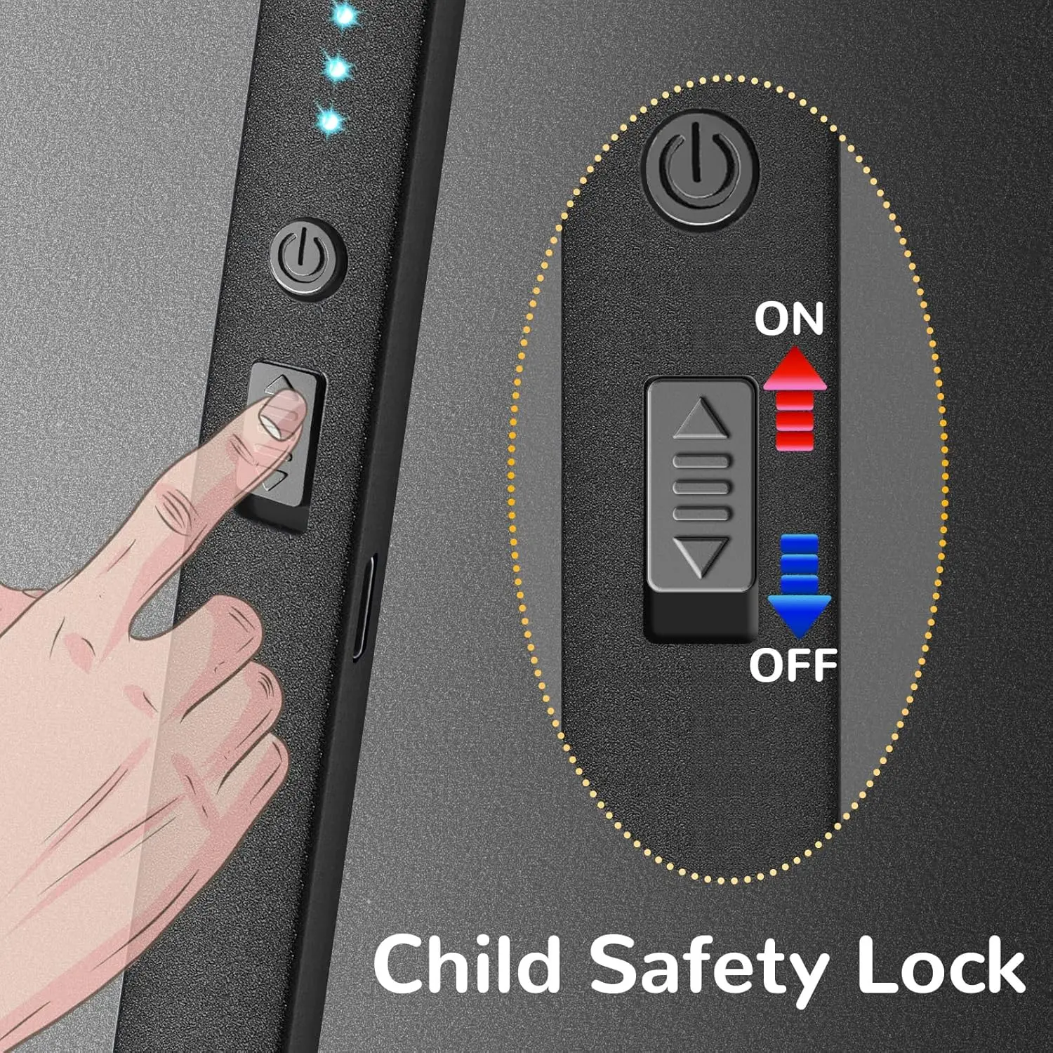 Designed with child safety in mind, you have to push the safety lock switch first, then press the ignition switch to work. 2) 7s Auto Off: The electric arc will automatically turn off after 7 seconds per use