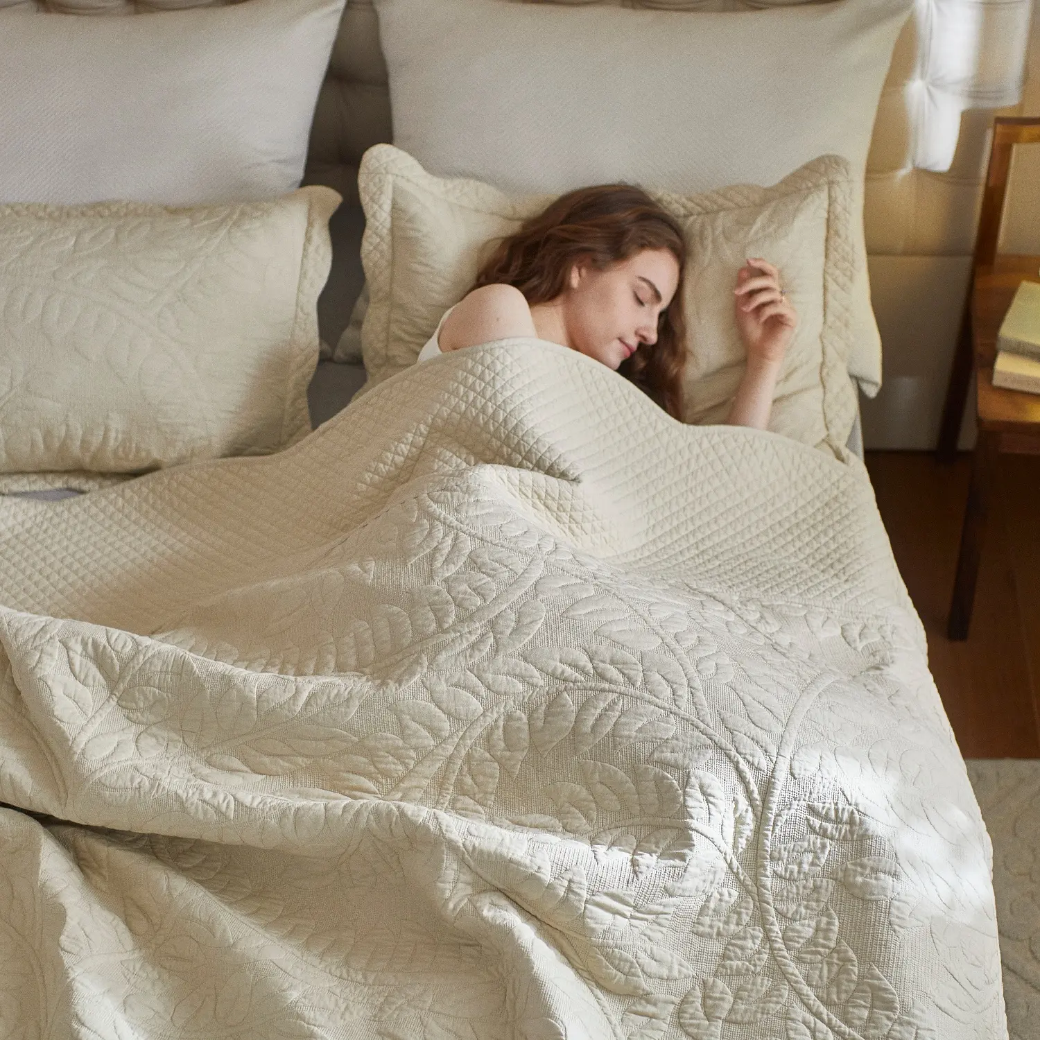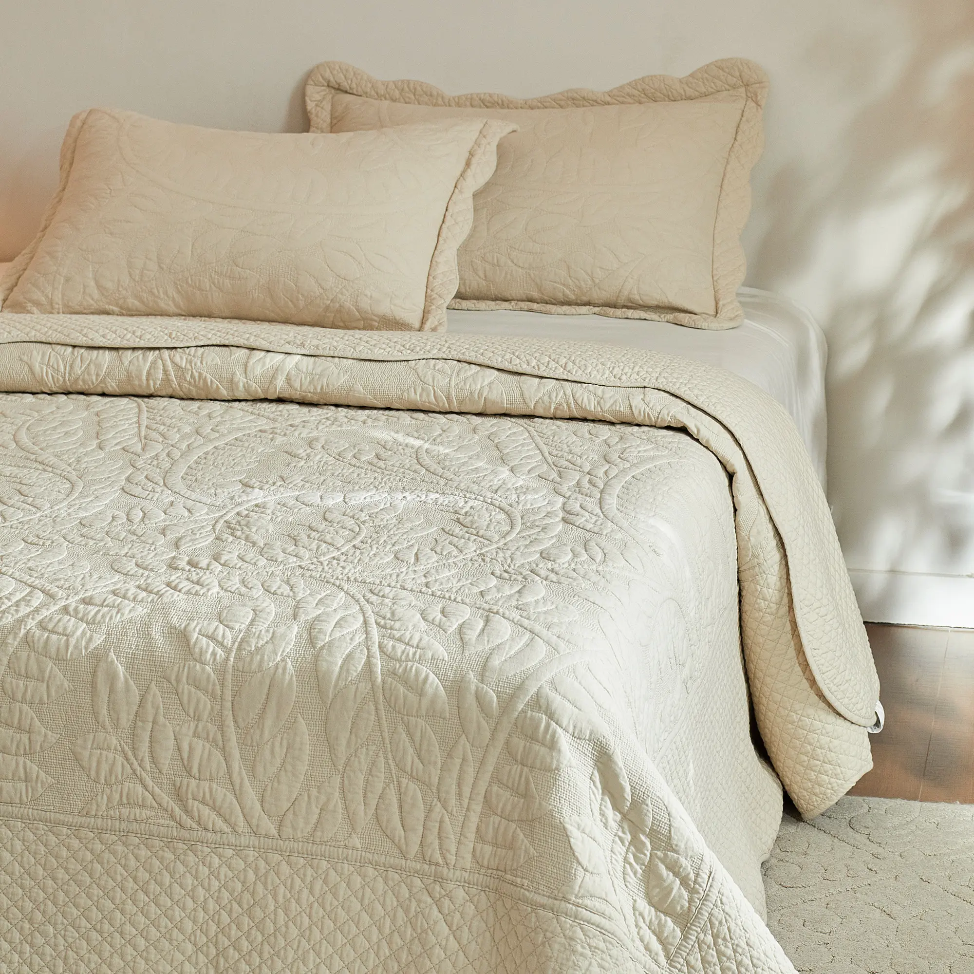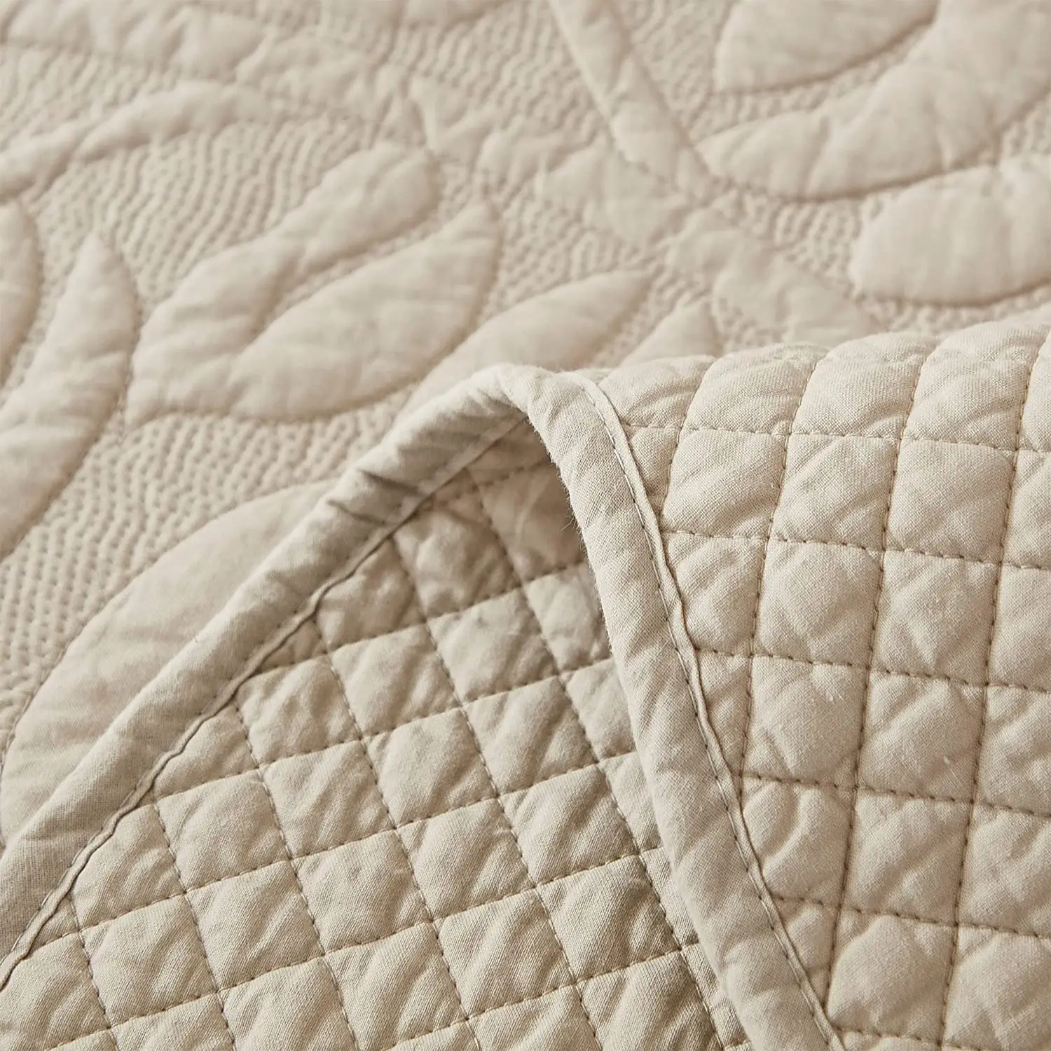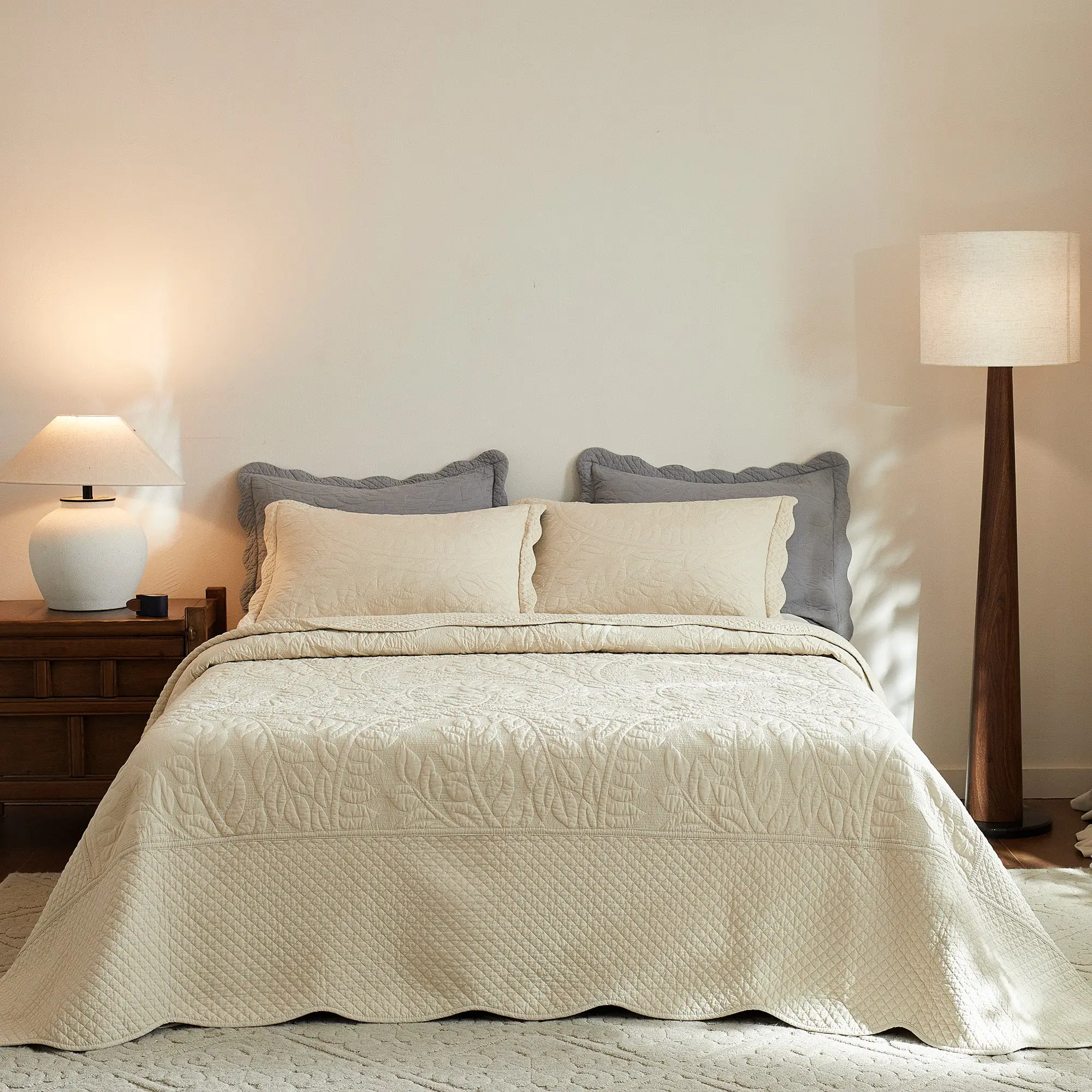 Oversized Quilt Bedspread Set 3-Piece, 100% Cotton Embroidered Queen King Size, Soft Breathable All-Season Comforter Cover, Leaf Design Bedspread
