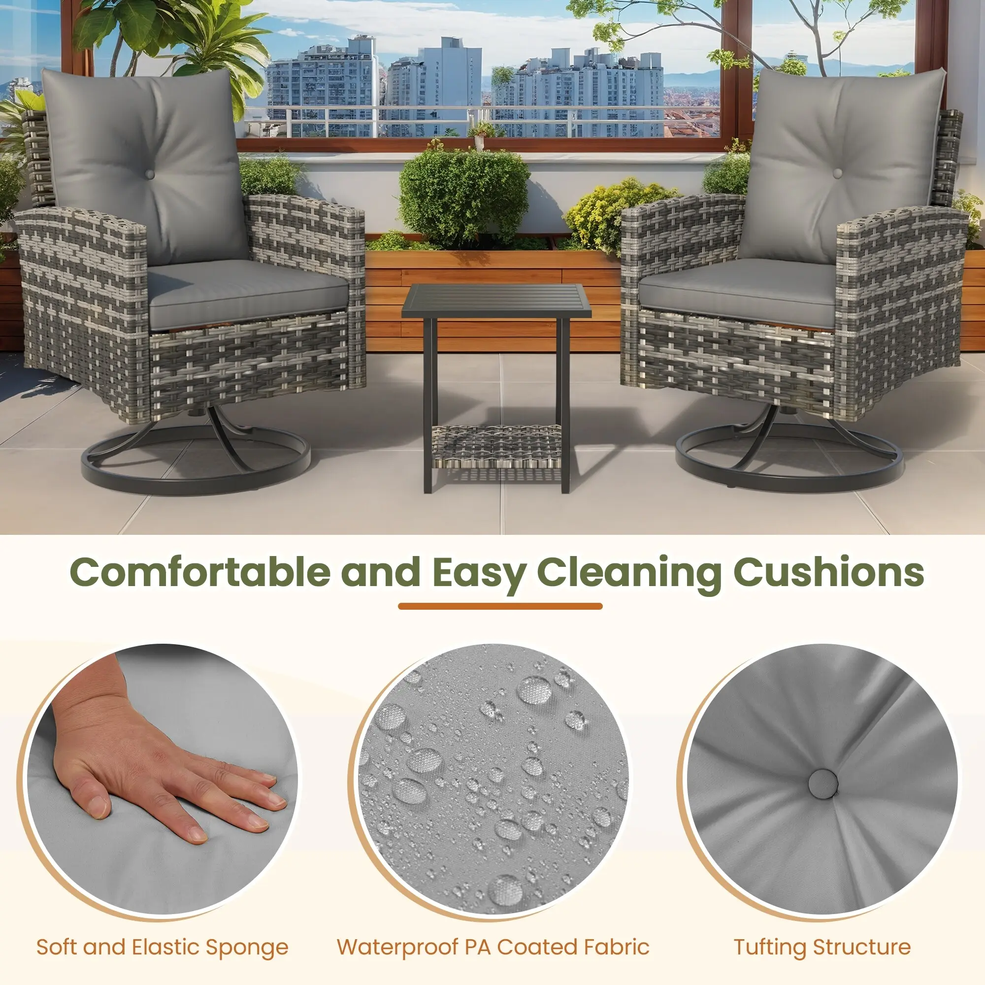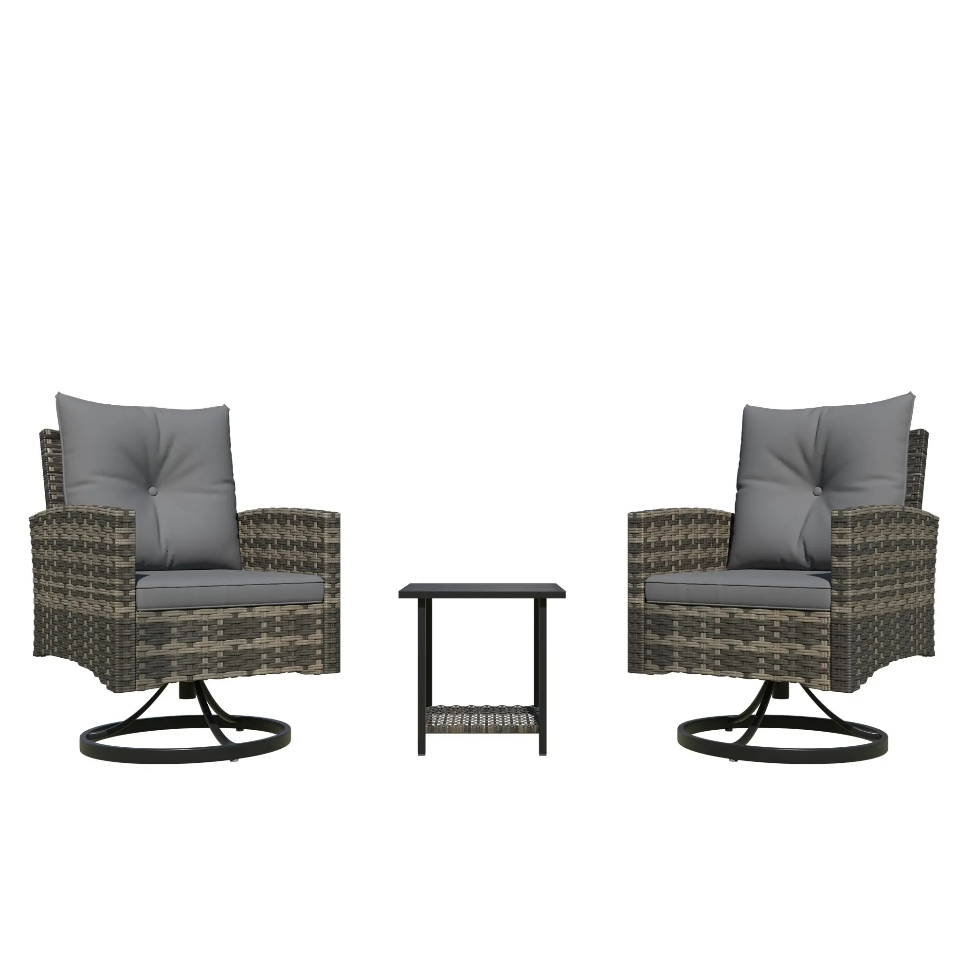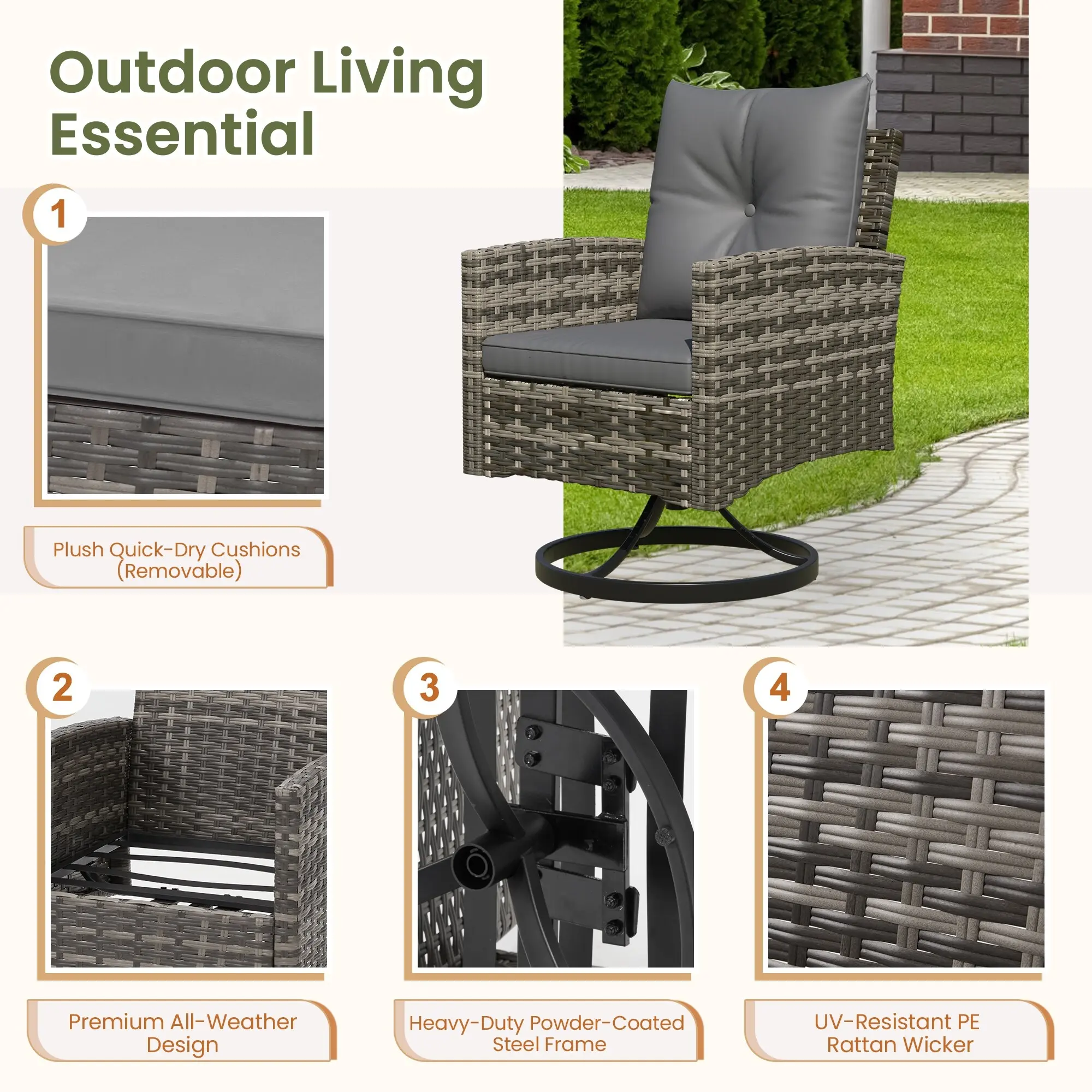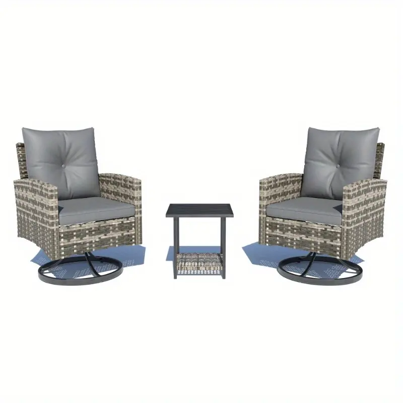 Handwoven with high-quality, UV-resistant PE rattan and supported by a powder-coated steel frame, this outdoor swivel chair set is built to withstand sun, rain, and daily outdoor use. The durable wicker resists fading and cracking for long-lasting beauty.
