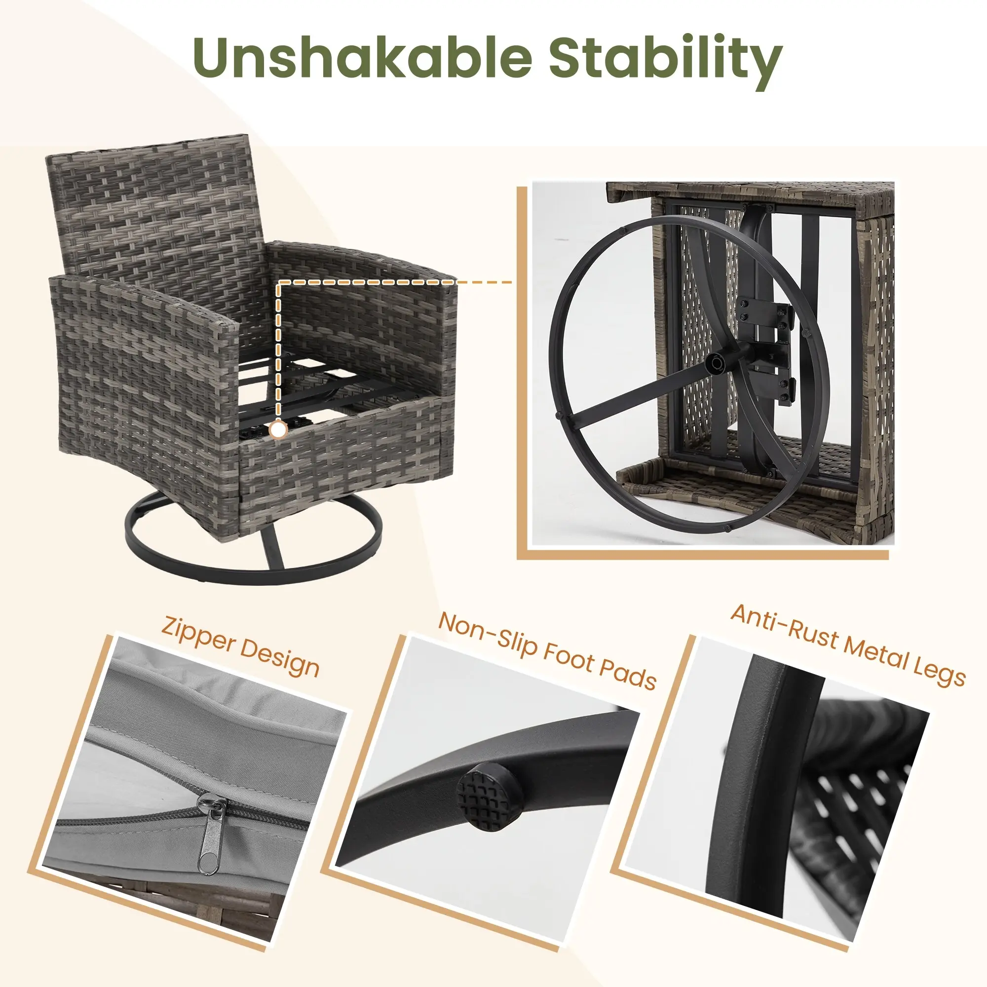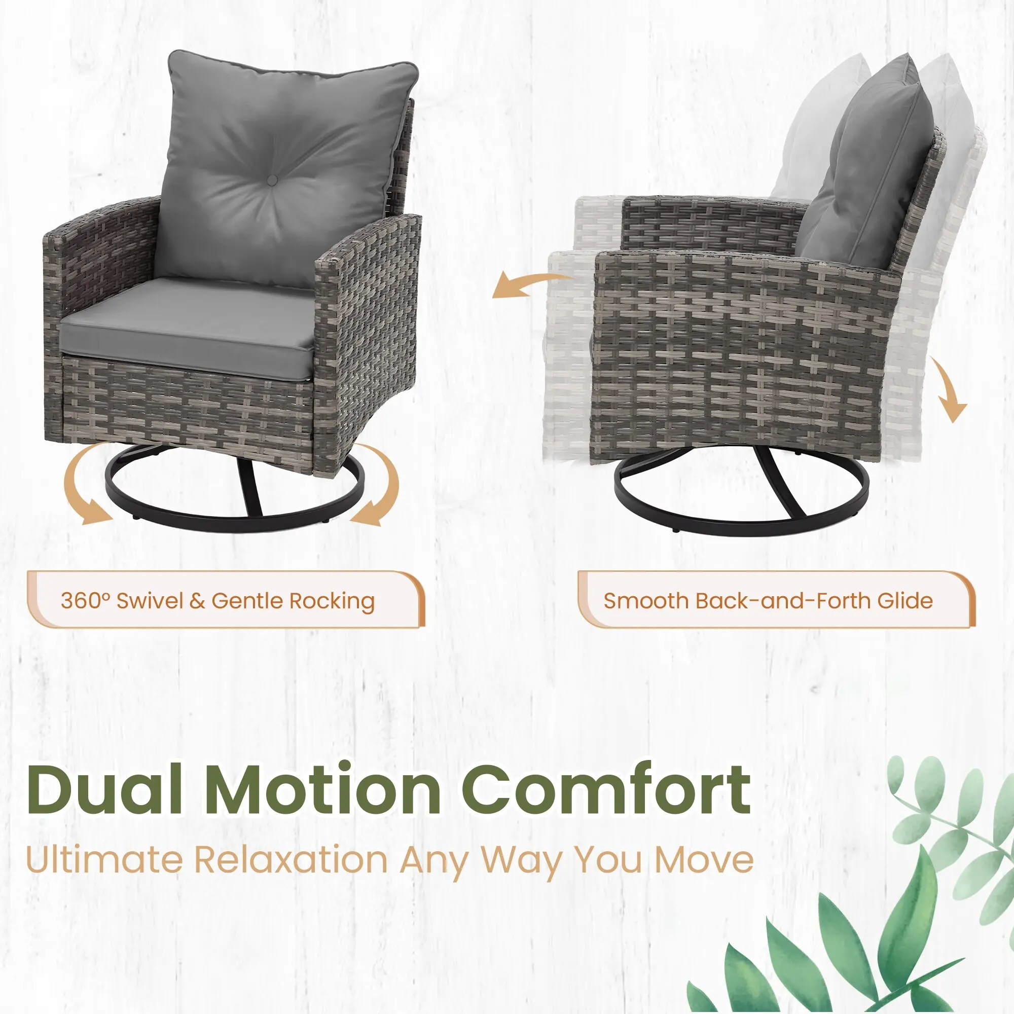 Enjoy effortless movement with smooth 360° swivel and gentle rocking motion. The rotating base allows you to turn freely for conversations or relaxation, making these swivel rocker chairs perfect for lounging, entertaining, or enjoying a quiet coffee outdoors.