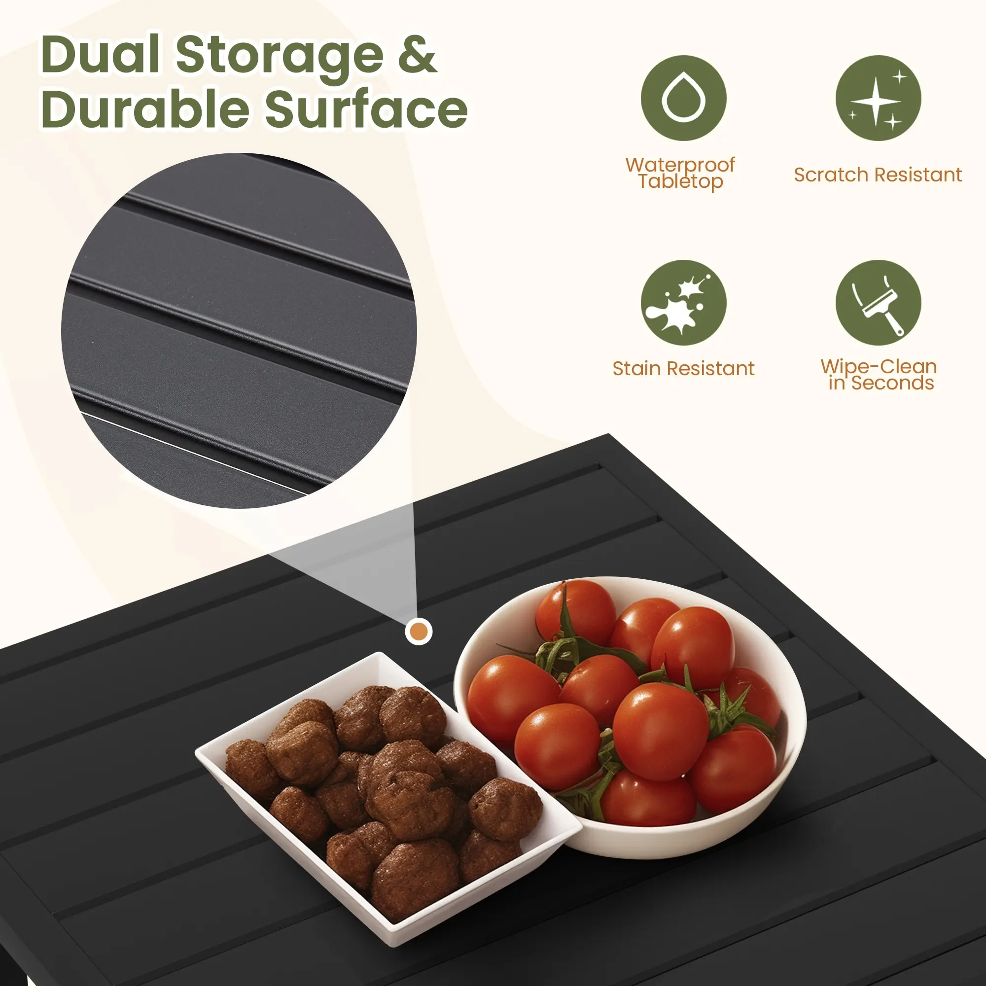 The matching coffee table features a waterproof woodgrain tabletop that resists scratches, stains, and water damage. Its two-tier design provides extra storage space for drinks, books, snacks, or décor, adding both style and practicality to your patio setup.