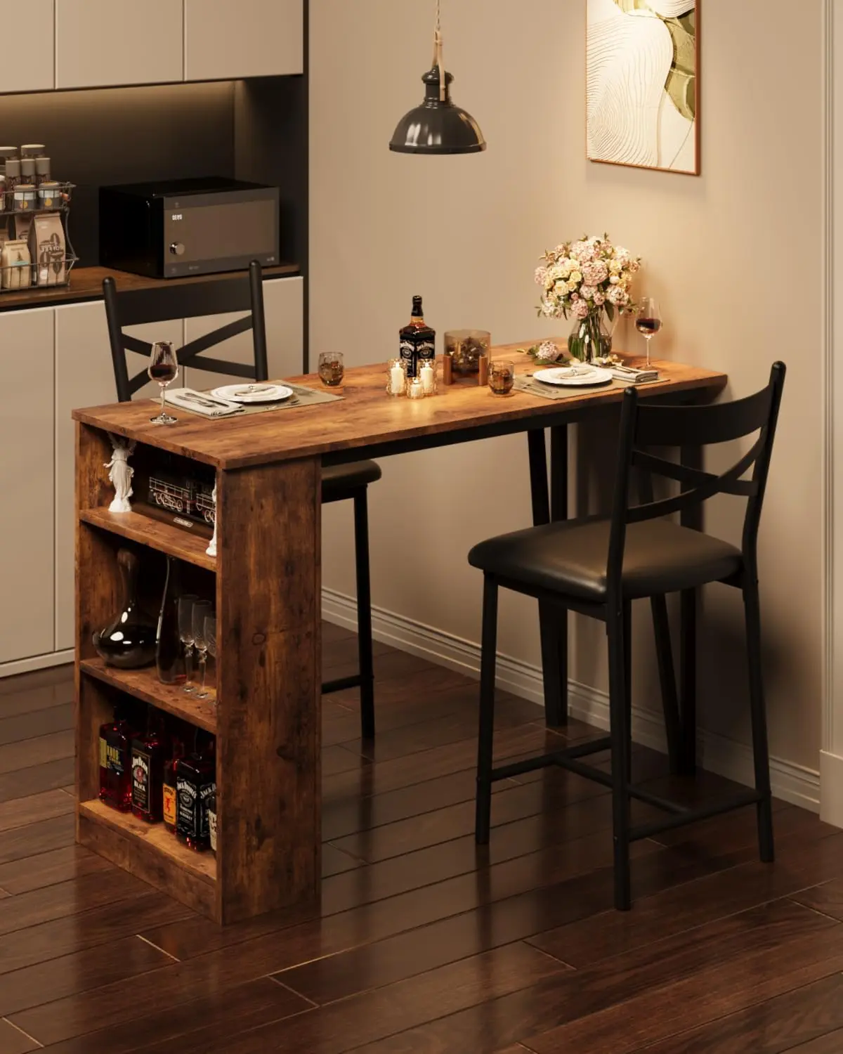 ·1. Perfect for Small Spaces: This 3-piece dining table set is designed with a drop leaf, making it an ideal solution for kitchens, dining rooms, small apartments, or even bars. It comfortably seats two people and features a modern, counter-height design that fits seamlessly into compact spaces.