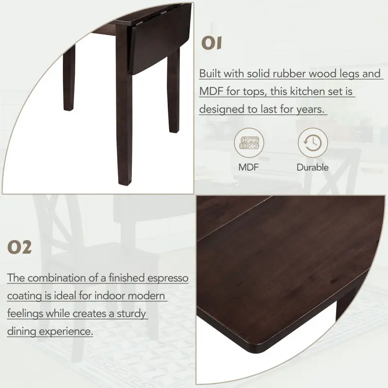 ·[Premium Construction] Built with solid rubber wood legs and MDF for tops, this kitchen set is designed to last for years.The combination of a finished espresso coating is ideal for indoor modern feelings while creates a sturdy dining experience.