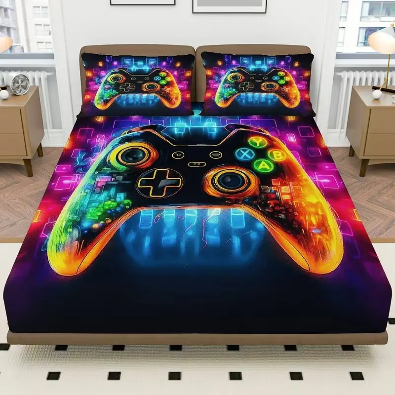 3-Piece Game Controller Bedding Set, Includes Fitted Sheet & Pillowcases, Breathable Polyester Fiber, All Seasons, Gaming Theme