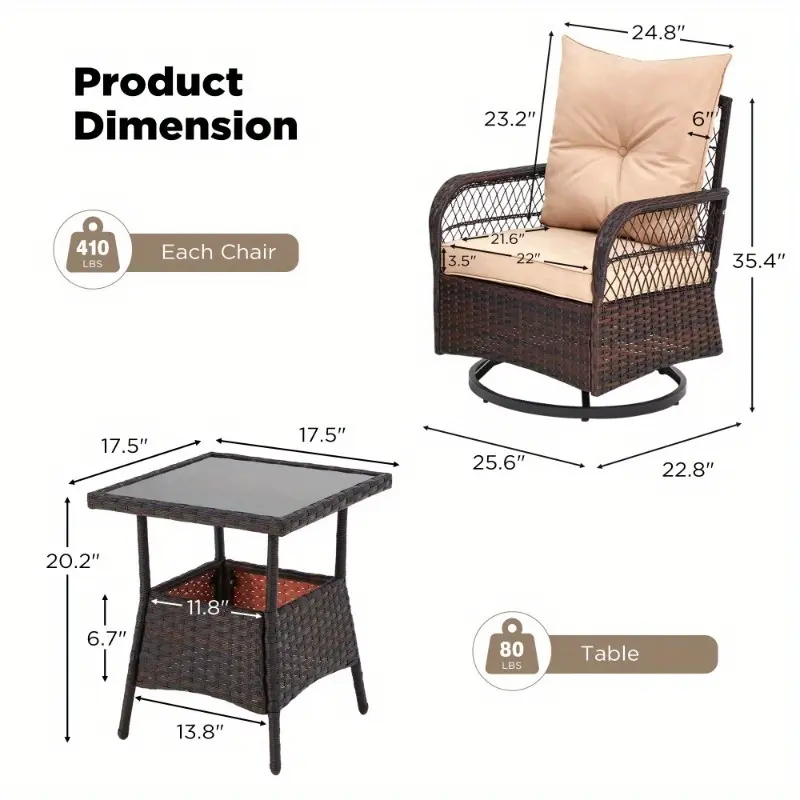Enjoy ultimate relaxation with chairs that rotate a full 360° and provide a gentle back-and-forth rocking motion. Perfect for lounging, reading, or enjoying the fresh air on your patio, porch, or garden.