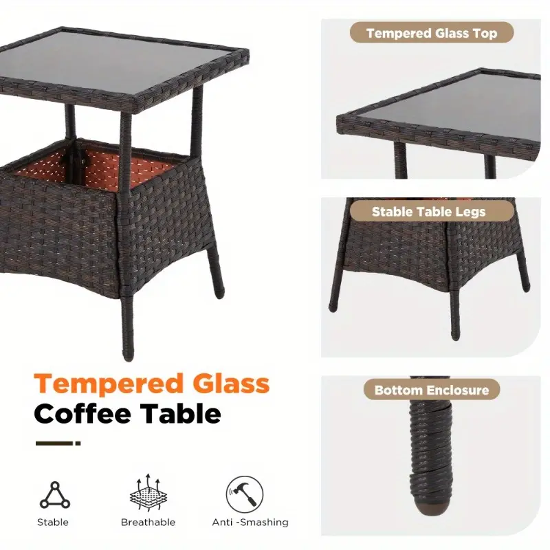 The included coffee table features a sleek tempered glass top and sturdy design. Ideal for holding drinks, snacks, or décor, combining style and functionality.