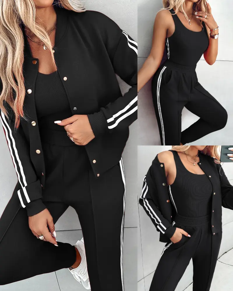 2026 FW ChicMe Women's 3 Piece Outfits Matching Sets Striped Tape Patch Tank Tops Button Front Jacket Cuffed Pants with Pockets Tracksuit Comfort Womenswear