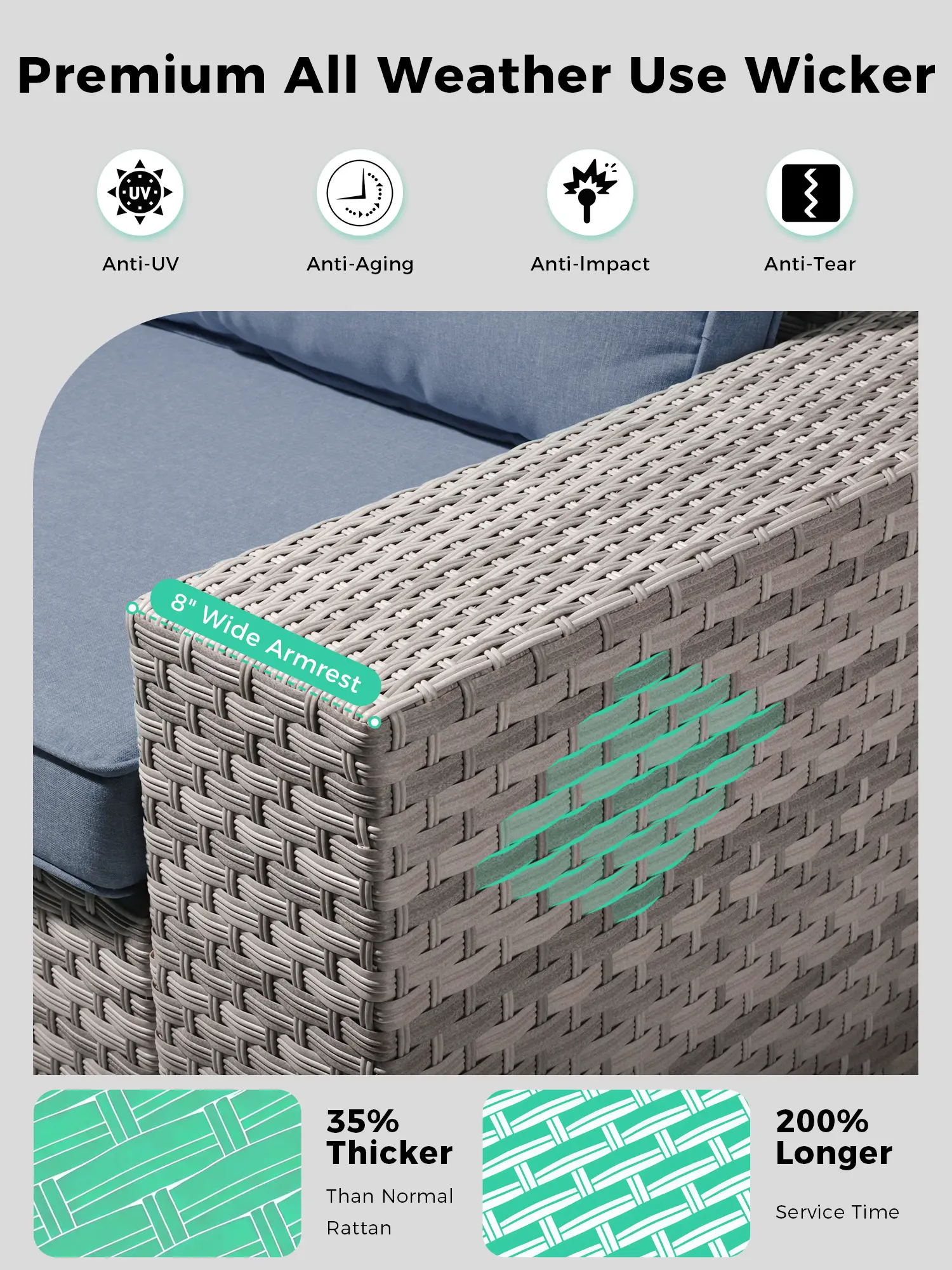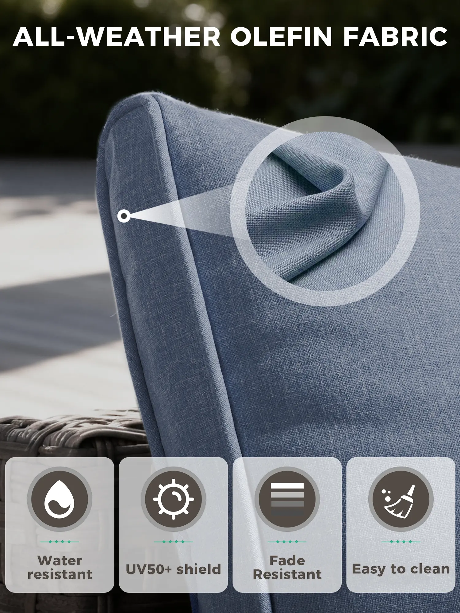 ·Easy-Clean Care for Lasting Beauty: Keep your wicker patio furniture set looking fresh with ease. The fade-resistant cushion covers are removable and machine washable, allowing for a quick clean. For long-lasting beauty, we recommend storing cushions indoors during extended rain, as the inner foam is designed for comfort, not waterproofing.