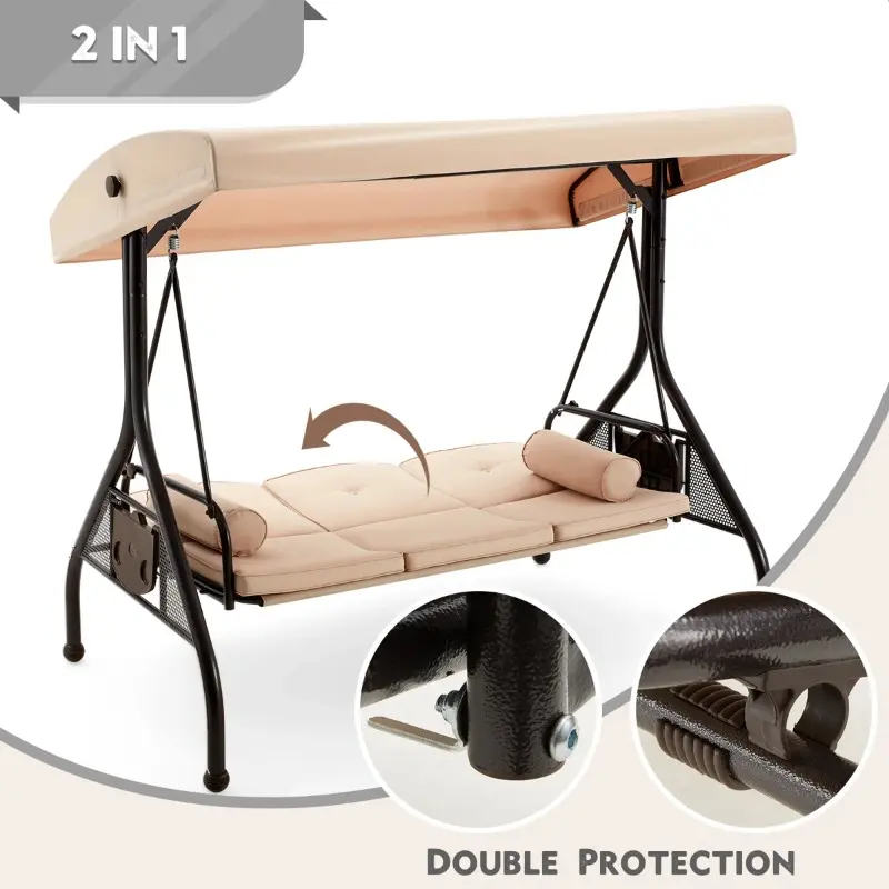 Easily transform the patio swing into a flatbed by releasing the spring locks on both sides. The backrest smoothly reclines and secures with anti-slip buckles and limit stops for double protection, providing a stable and comfortable lounging or napping experience outdoors.