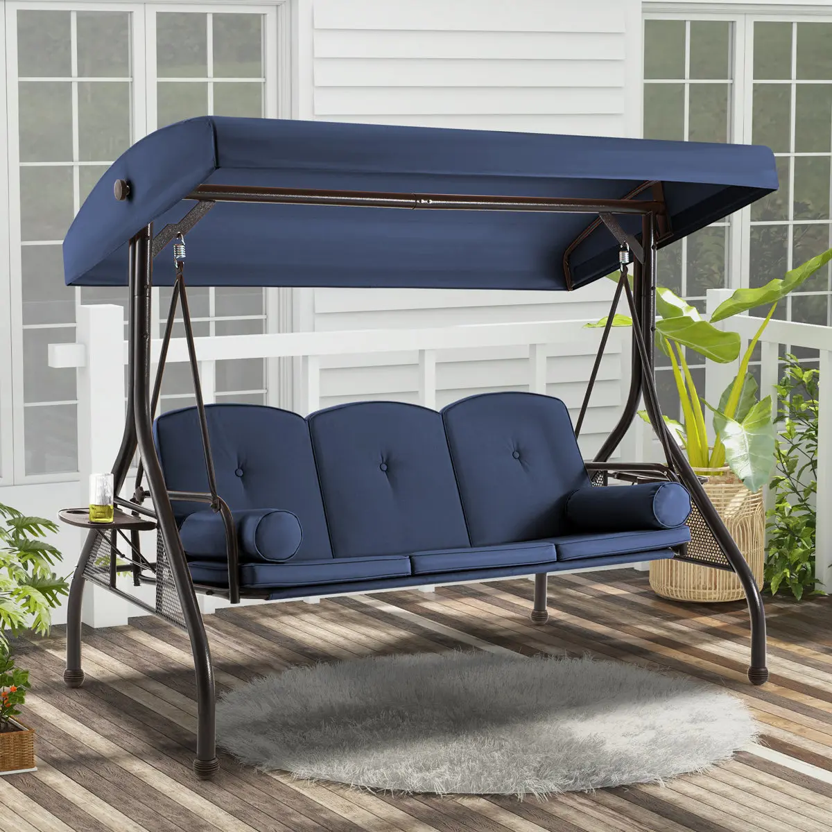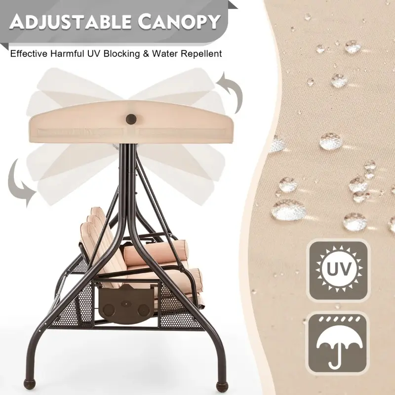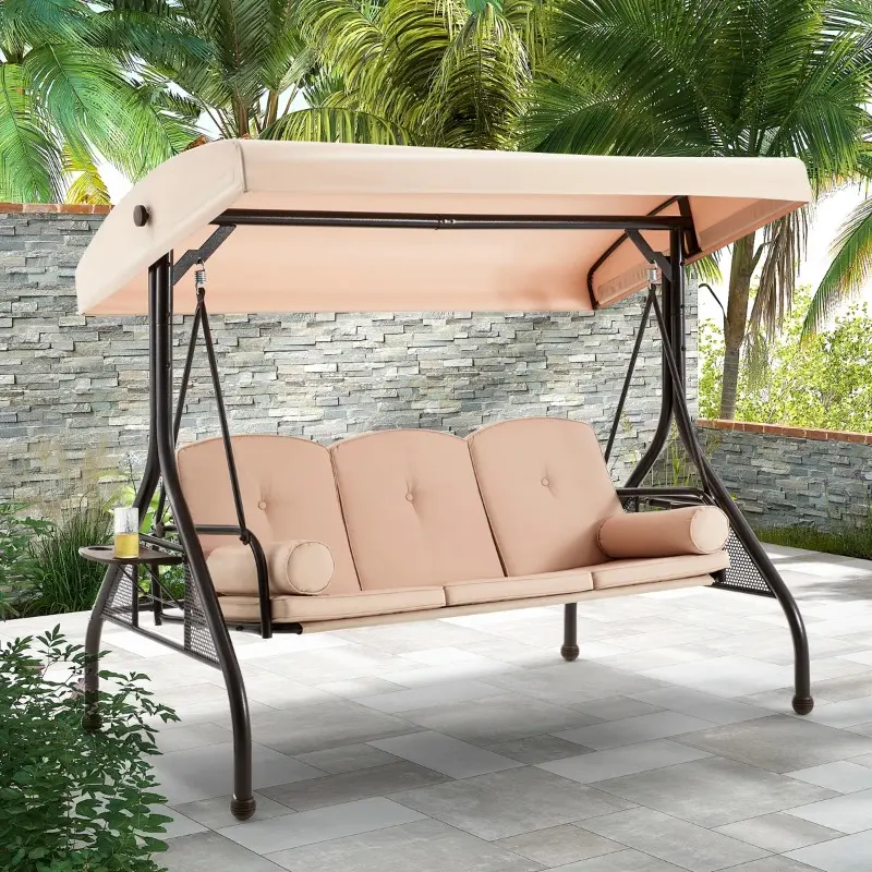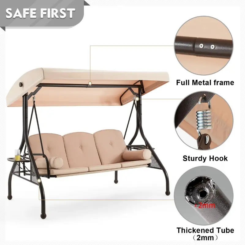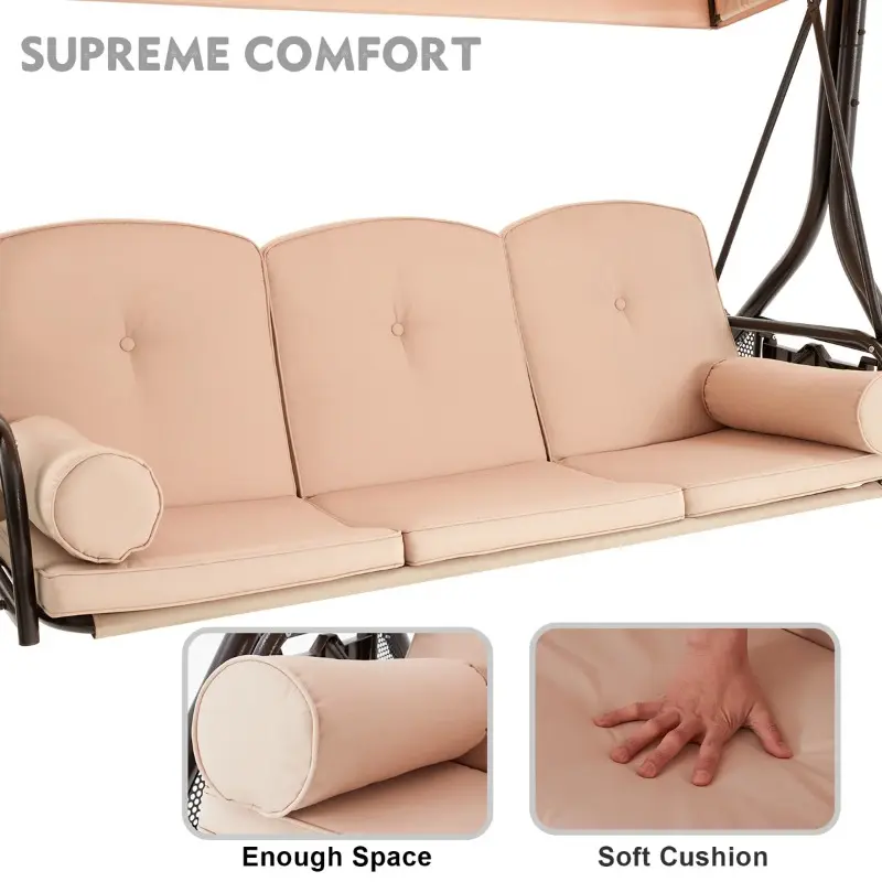 Designed with a wide seating area and thickened cushions, this outdoor swing comfortably accommodates three adults for relaxing together. The precision gliding mechanism ensures a smooth, stable motion without annoying squeaks, allowing you to fully enjoy peaceful outdoor moments.