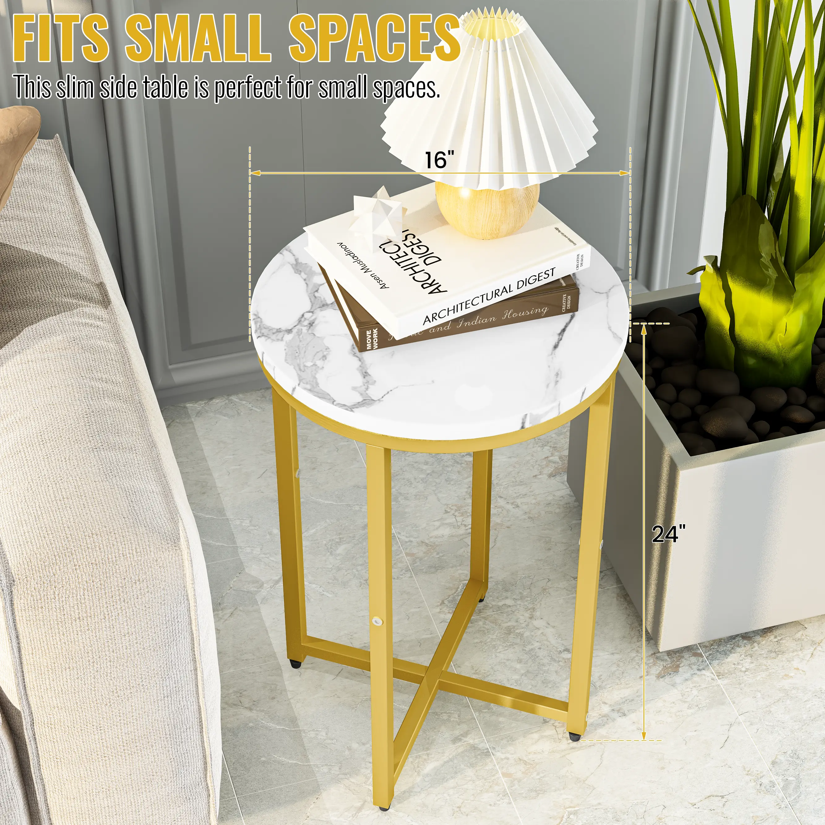 【MODERN SIDE TABLE】- This posh piece's metal frame is finished in golden polished chrome for a look,table top is made of MDF and finished with a beautiful glossy white faux marble with gray veining, bringing the look and feel together,adding a nice touch to your home.