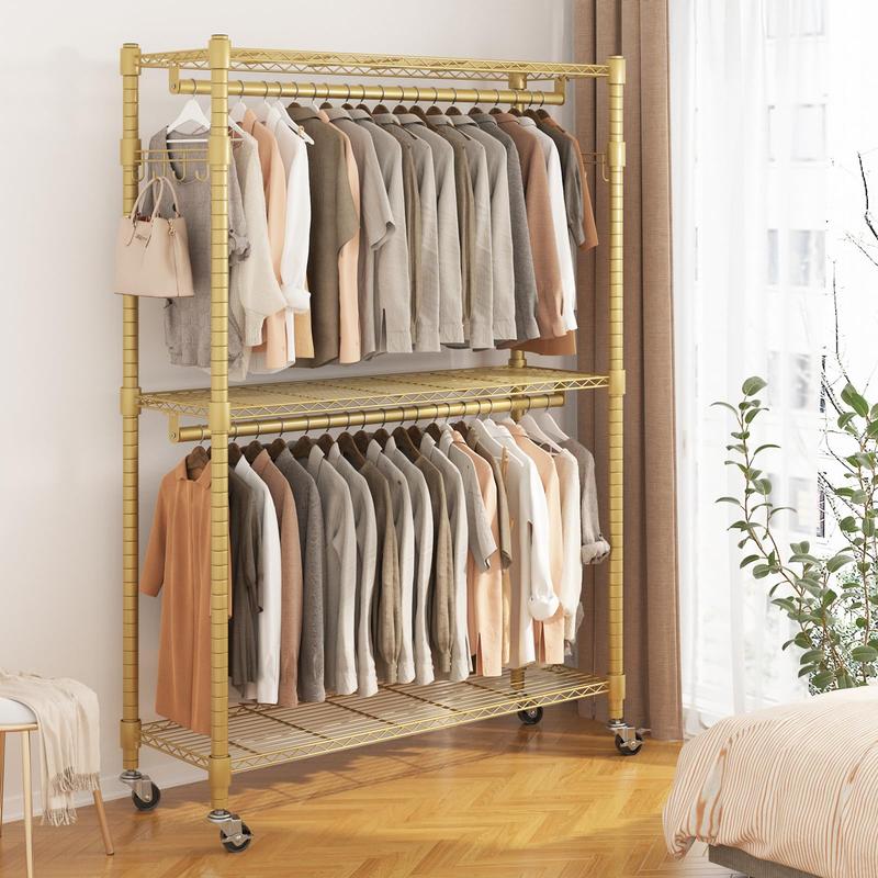 ·Multi-layer Storage The metal clothes hanger adopts a three-layer shelf with a double rod design, which makes flexible use of vertical space. The layer height can be adjusted freely to easily accommodate long and short clothes. The multifunctional storage area meets the needs of hanging clothes, stacking, and storage.