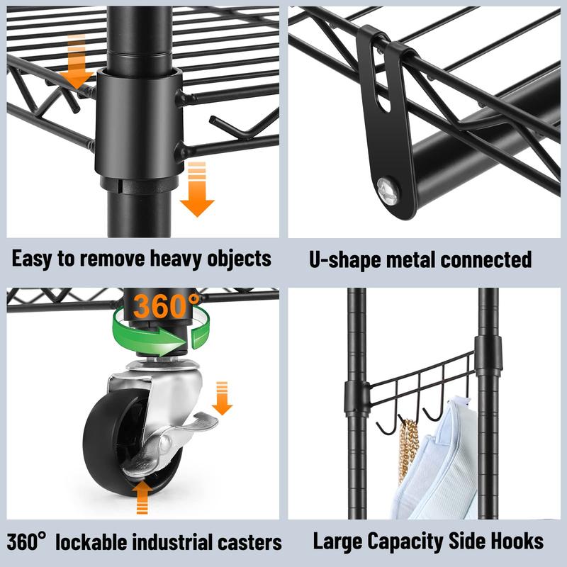 Made of high-quality steel, it has 250, 350 and 450 pounds of super-strong load-bearing capacity for you to choose. The innovative three-layer adjustable design is equipped with a double-rod suspension system, so that suits, jackets, and long skirts can be placed at will. Different modes of assembly allow you to store clothes flexibly. The thoughtful side hooks make bags, hats, scarves and other accessories return to their places in an instant.