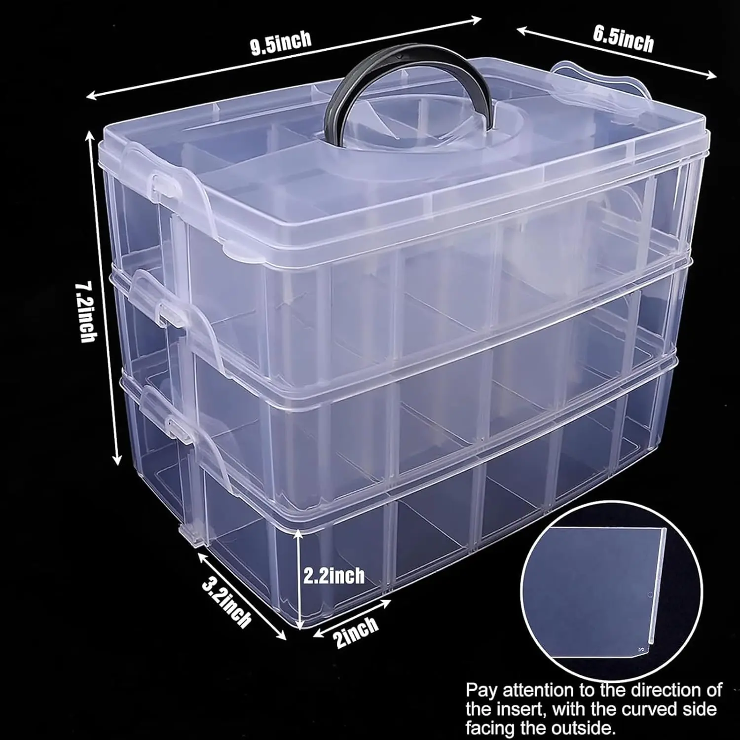 Adjustable Size: Outer box size 9.5"L x 6.5"W x 7.2"H, single grid size: 3.2"L x 2.0"W x 2.2"H. The dividers are removable and detachable that can make larger compartments to adapt the crafts you need to store.