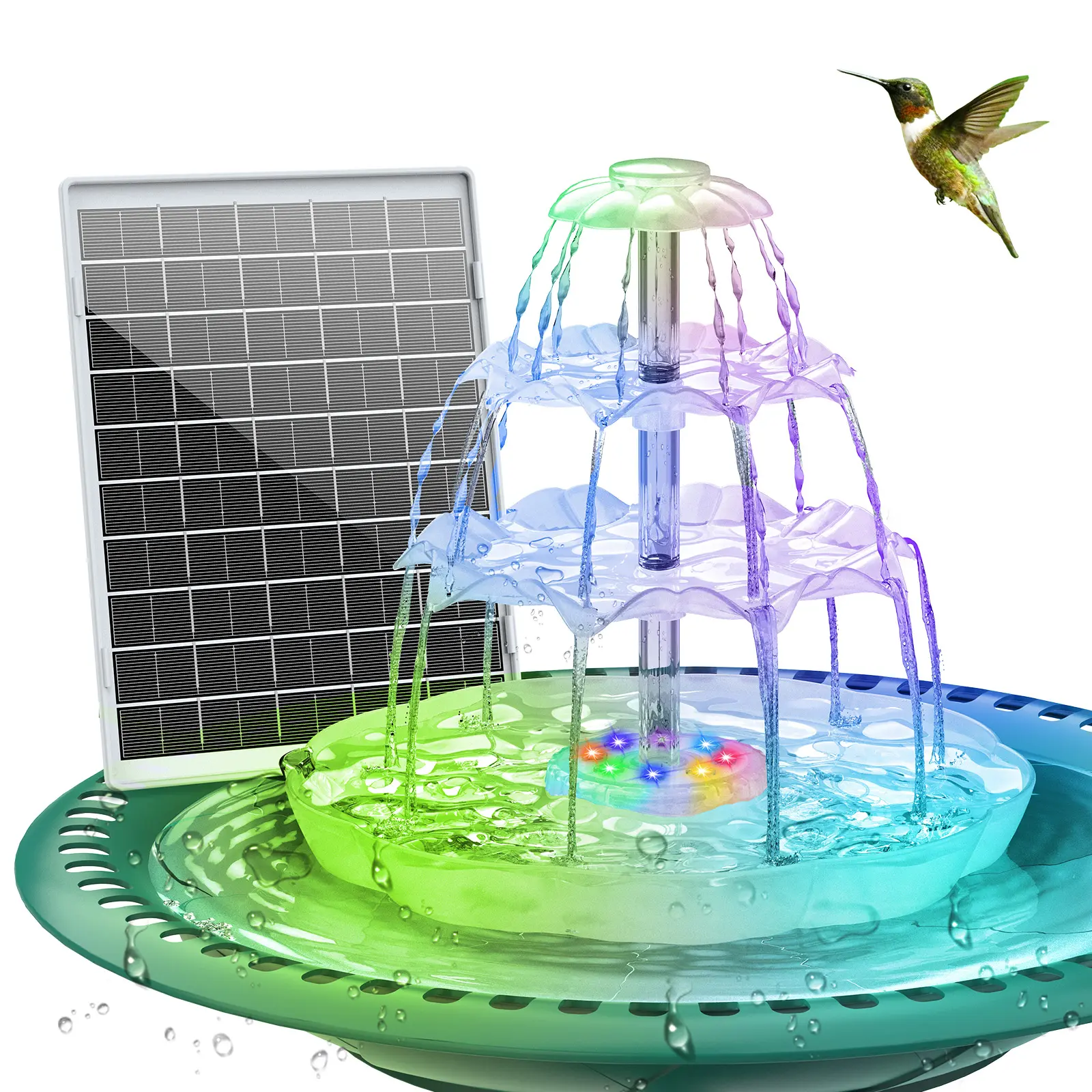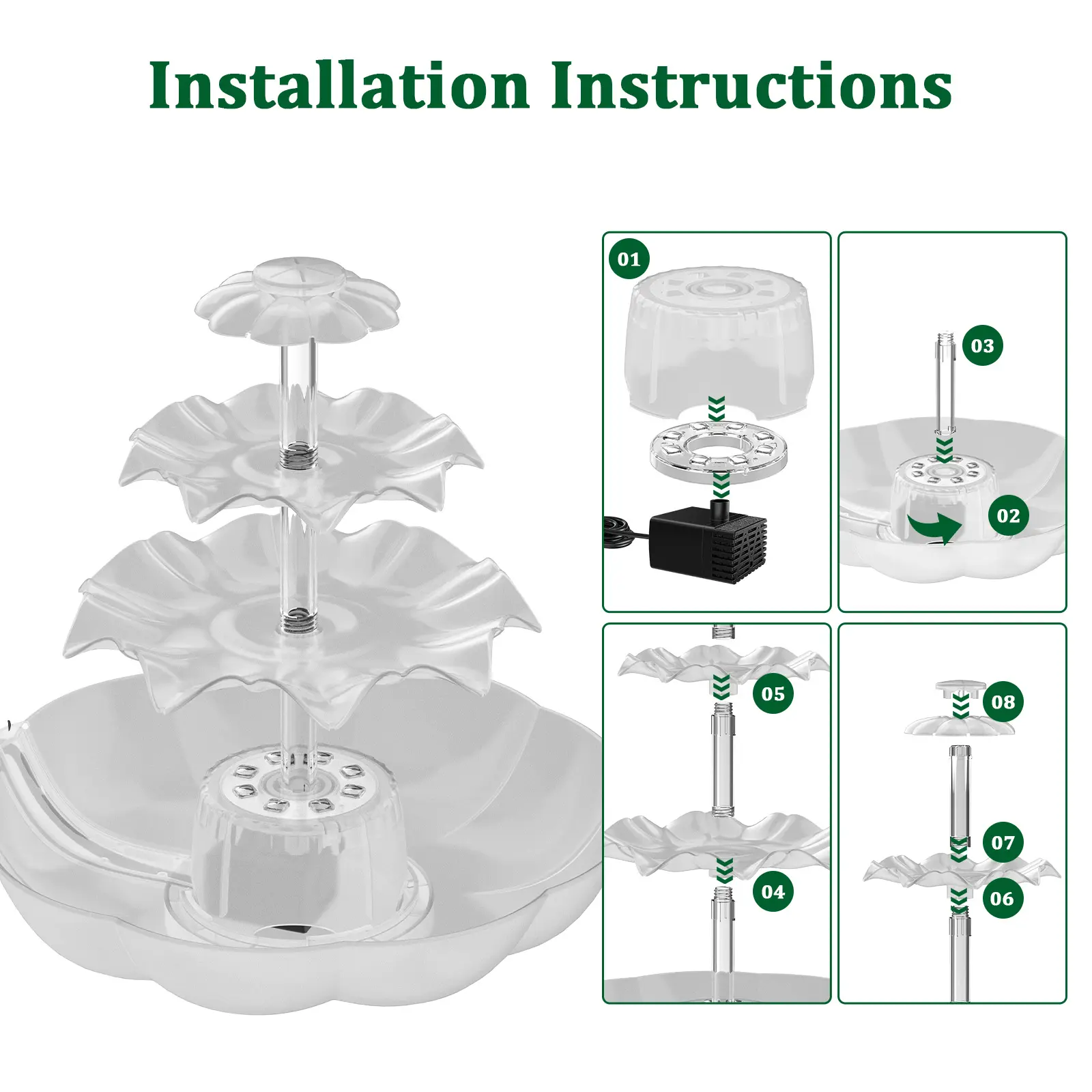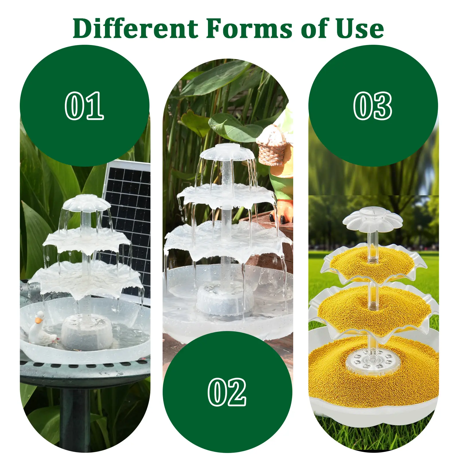 ·【Bird Bath Set】3-tier outdoor bird feeder with 6.5W solar fountain, bird bath combination set, easy to assemble and clean. You can use it as a complete bird bath set; you can also put it in a bird bath tray as an extra decoration. An ideal yard decoration to attract birds.