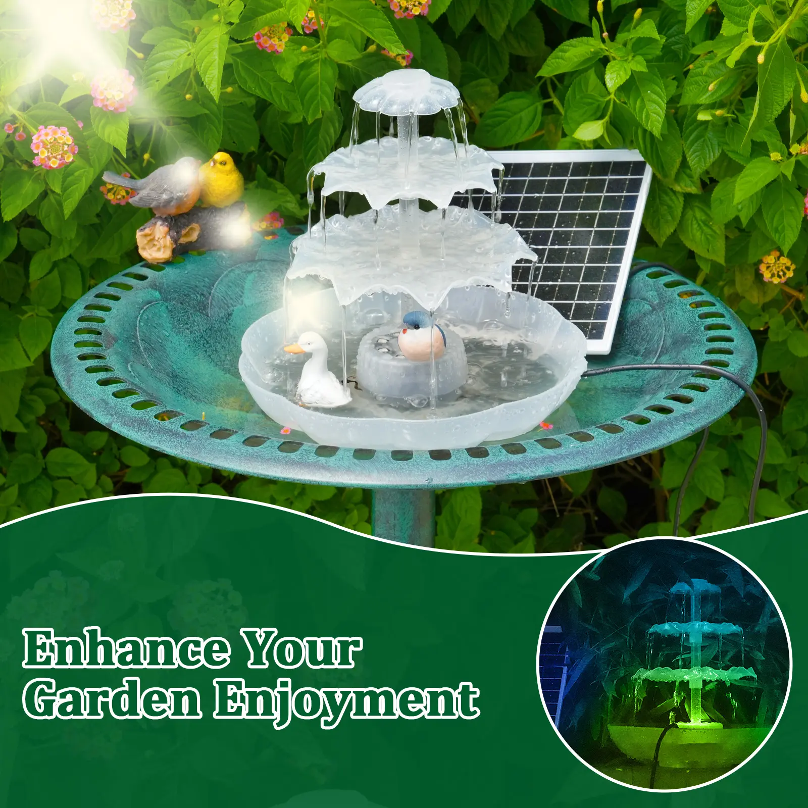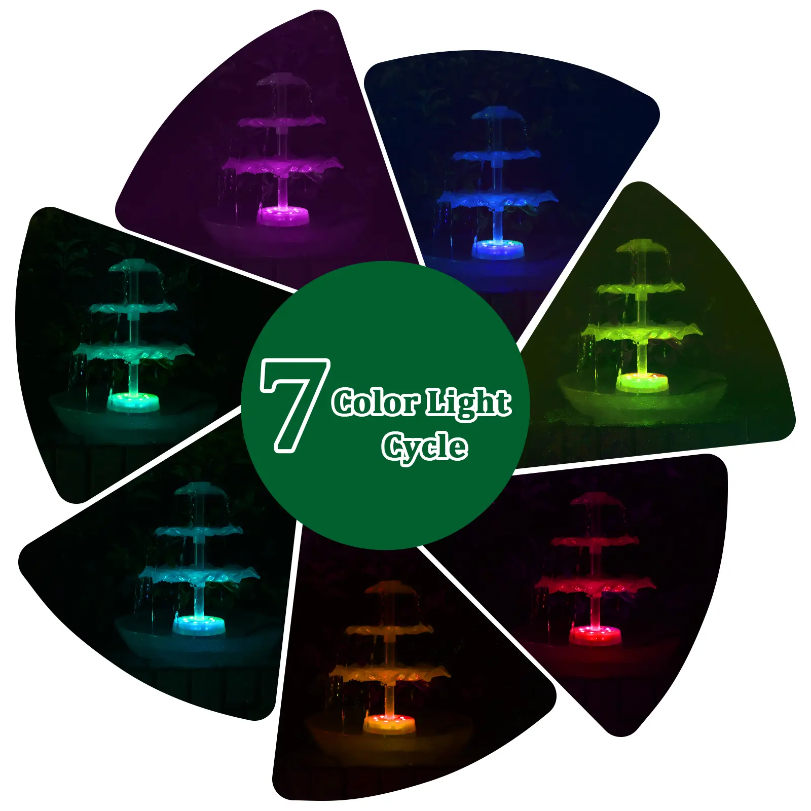 ·【Colorful LED Lighting】 Built-in multicolored LED lights illuminate the water streams and basin, creating a stunning, dynamic light show after dark. The lights automatically activate at dusk, turning your fountain into a captivating focal point for evening gatherings.