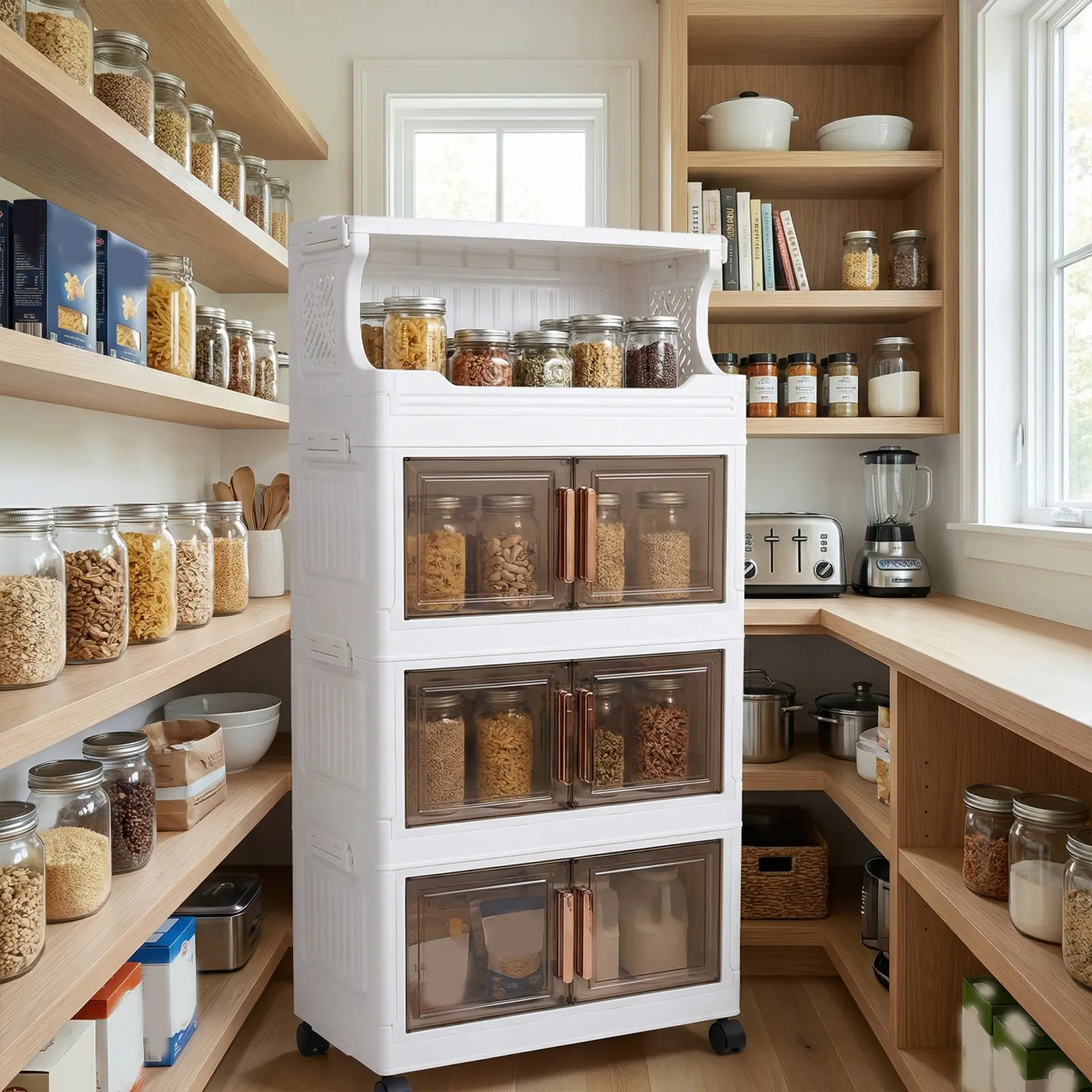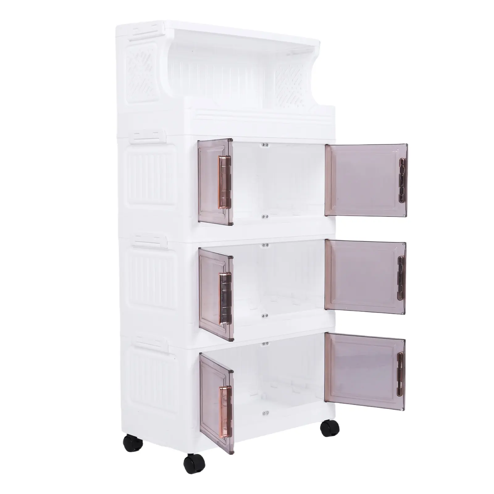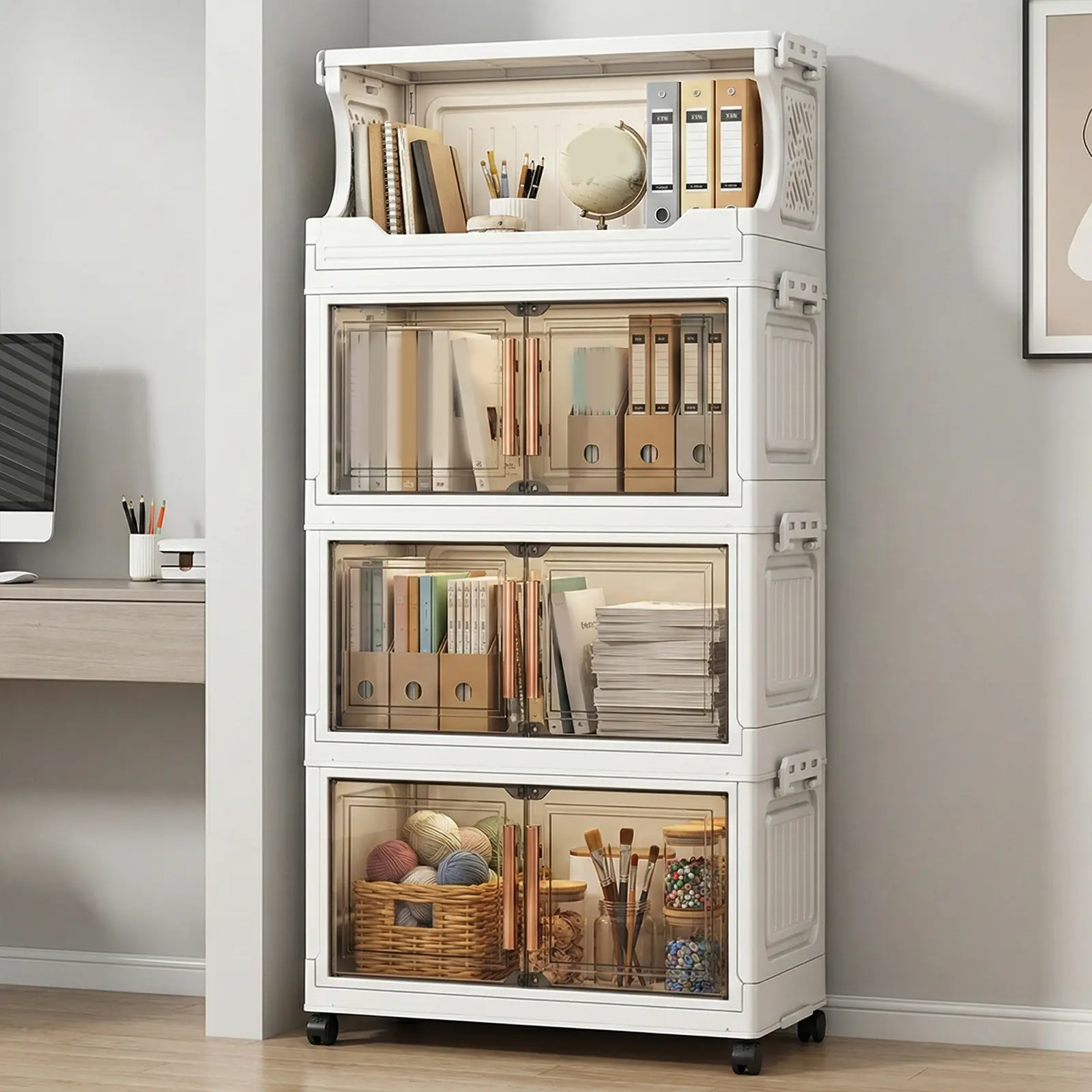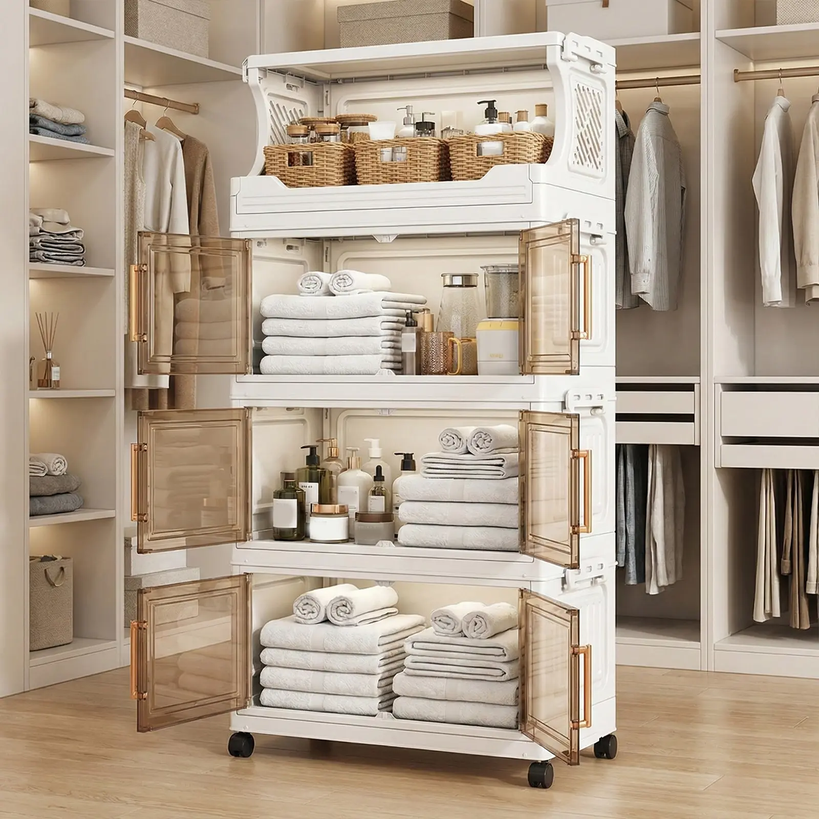 4 Tier Stackable Plastic Storage Bins with Doors and Wheels 42cm Foldable Plastic Storage Container Large Capacity for Craft Home Pantry DormTransparent