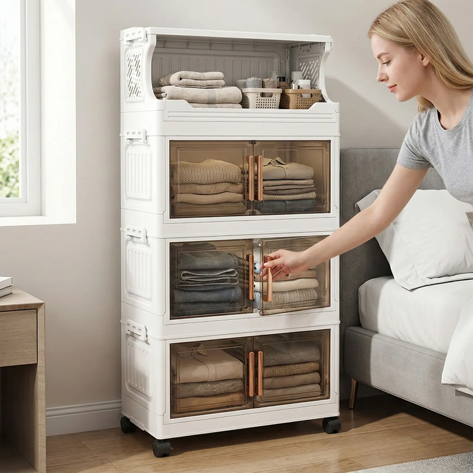 3. Stackable & Mobile Convenience: The foldable plastic storage container features grooves and clasps that securely lock each transparent box in place. Four swivel wheels, including two with locking mechanisms, allow easy movement and secure placement wherever needed.