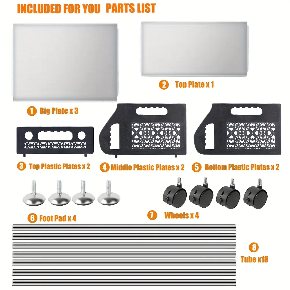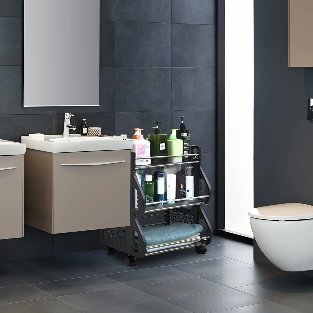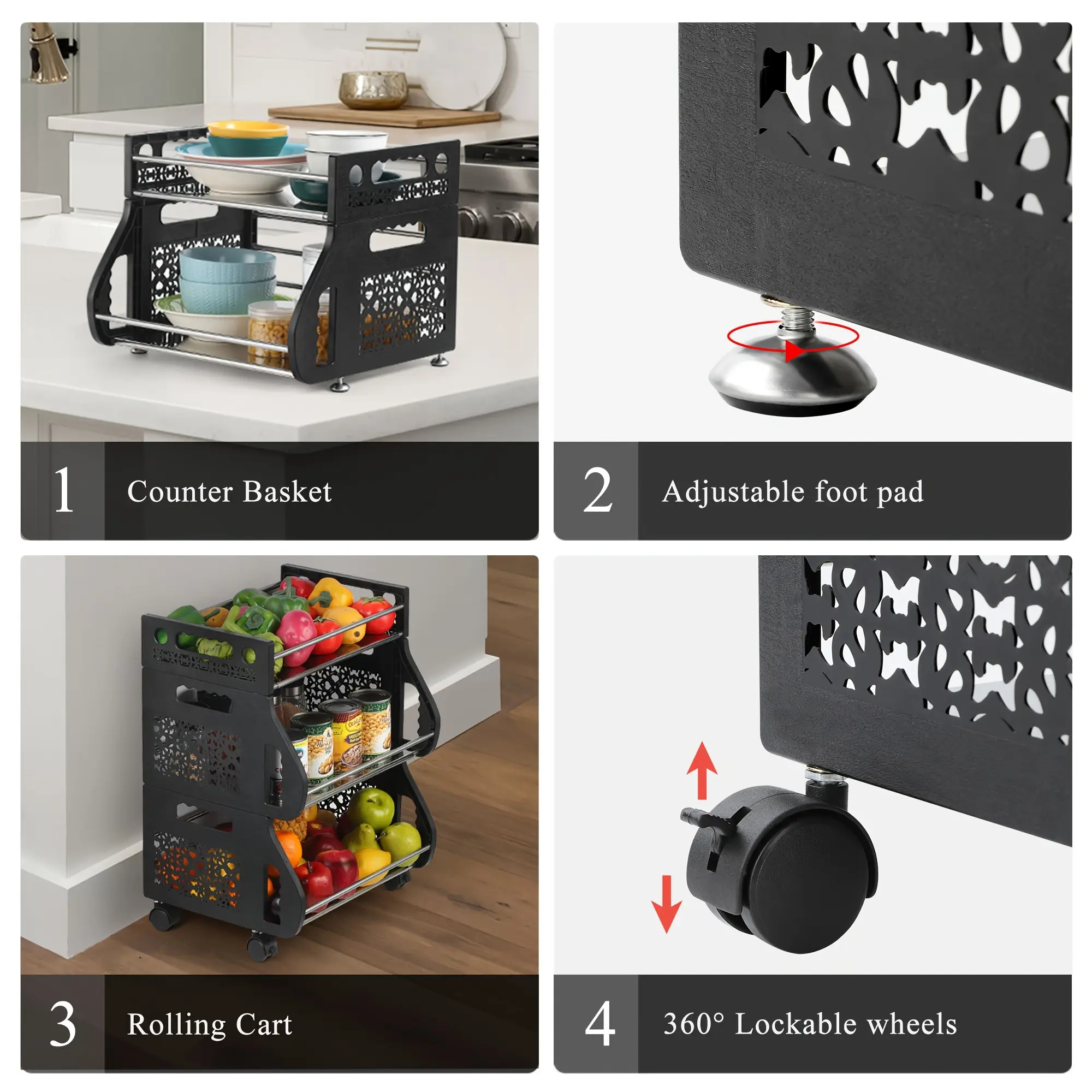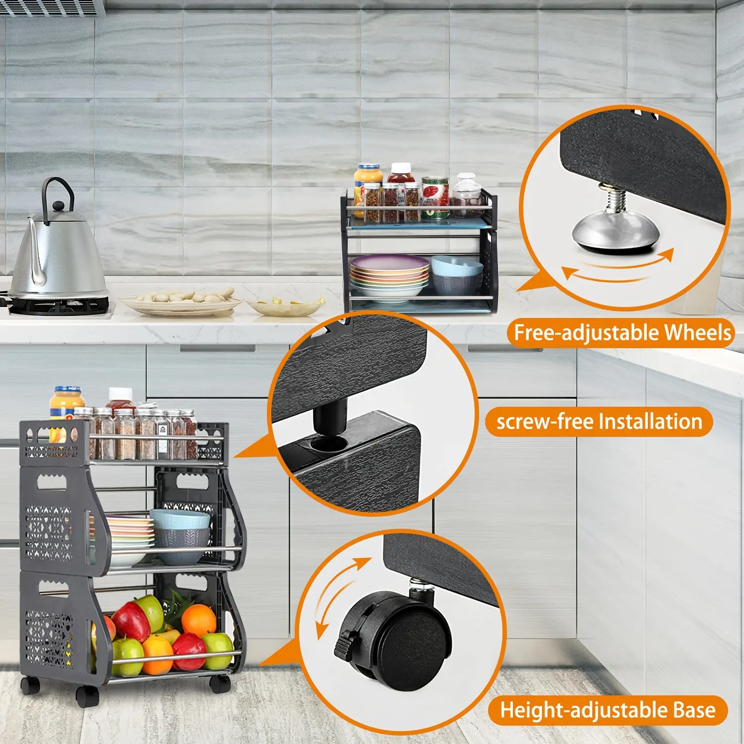 [360°Movable Rolling Cart]The fruit basket has 3 tiers Storage bins together with 4pcs universal Tires, can be moved around conveniently. Two of the casters are loable, to keep the storage organizer securely in place when needed. The casters of the storage cart are made of ABS which is smooth and durable. So it is moving smoothly without noise. More, two loable Tires with brakes to help you stop it in a specific place